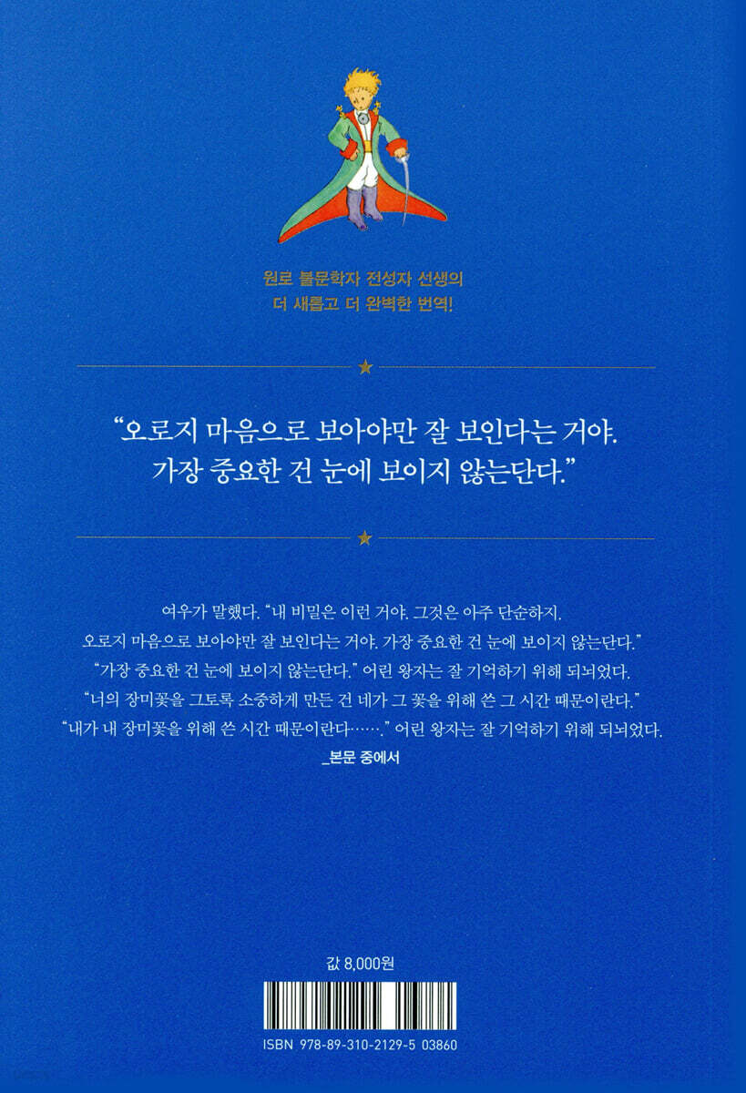 --- p.8~9 “어느 날 나는 해가 지는 걸 마흔네 번이나 보았어!”잠시 후 너는 다시 말했지.“몹시 슬플 때에는 해 지는 풍경을 좋아하게 되지…….”“마흔네 번 본 날, 그럼 너는 몹시 슬펐겠구나?”그러나 어린 왕자는 대답하지 않았다. --- p.31 “그럼 너 자신을 심판하거라.” 왕이 말했다. “그것이 가장 어려운 일이니라.” 다른 사람을 심판하는 것보다 자기 자신을 심판하는 게 훨씬 더 어려운 법이거든. 네가 너 스스로를 훌륭히 심판할 수 있다면 그건 네가 참으로 지혜로운 사람이라는 얘기다. --- p.50 “네가 오후 네 시에 온다면 난 세 시부터 행복해지기 시작할 거야.시간이 갈수록 난 점점 더 행복해지겠지.네 시에는 흥분해서 안절부절못할 거야.그래서 행복이 얼마나 값진 것인지 알게 되겠지!” --- p.90 “내 비밀은 이런 거야. 그것은 아주 간단하지. 오로지 마음으로 보아야만 잘 보인다는 거야. 가장 중요한 건 눈에 보이지 않는단다.” --- p.94 |