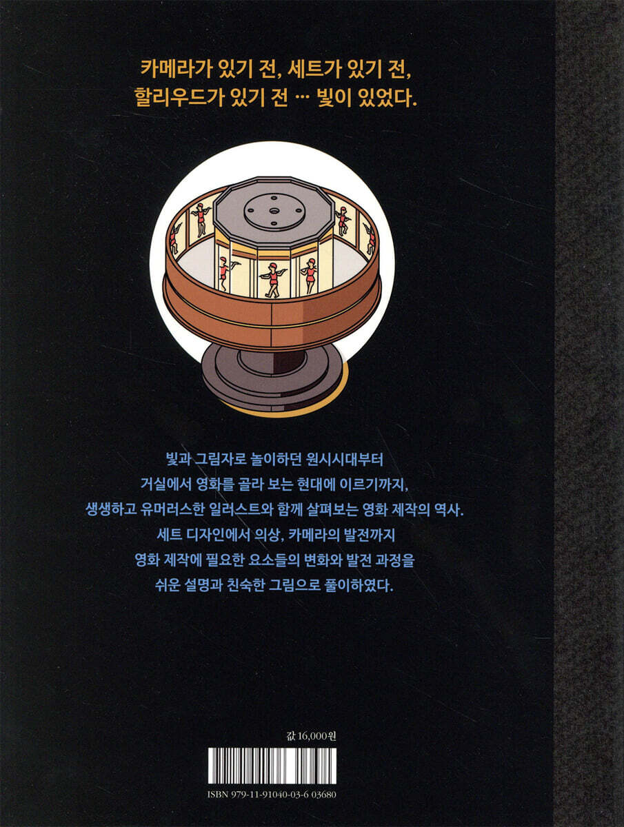 역사 이전 빛을 이용한 놀이 19세기 1800년대 최초의 영화 제작자들 1890년대 첫 번째 상영 20세기 1900년대 마술과 환영 1910년대 [인톨러런스(편협)]의 세트 시네마: 영화관 시대를 이어온 영화관들 1920년대 사운드! 1930년대 컬러! 1940년대 필름 누아르 1950년대 사무라이 미학 [7인의 사무라이]의 세트 편집 1960년대 프랑스 누벨바그 1970년대 [스타워즈]의 세트 1980년대 인공적인 배경 1990년대 다양한 확장 21세기 2000년대 문화적 교류 2010년대 종합 미래 유산 팀을 만나요! 용어 풀이 참고문헌 옮긴이의 말 찾아보기 |