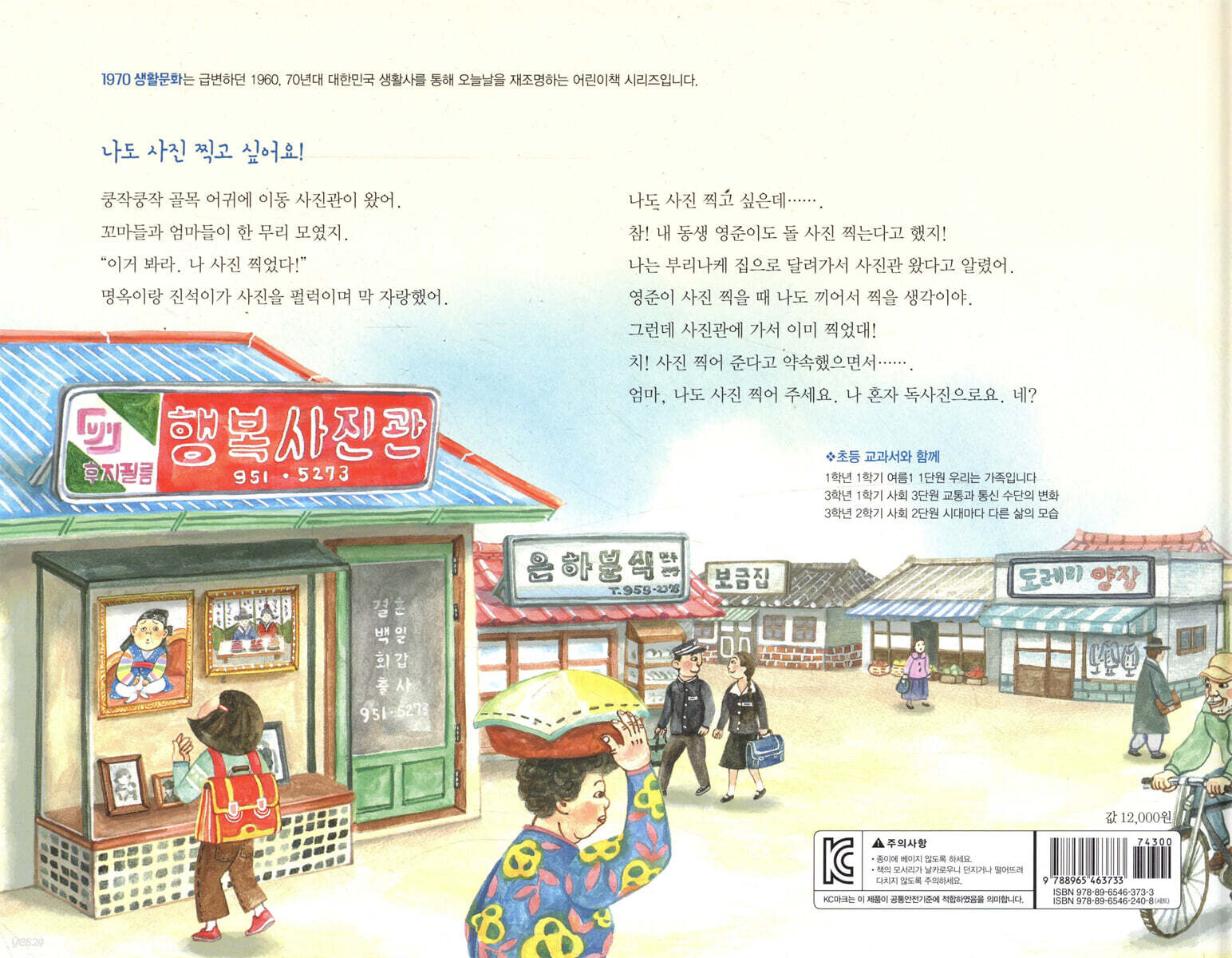 “잠깐, 인증샷 찍어야지!” 분위기 좋은 음식점이나 맛집에 가면 일행 중에 하나는 꼭 이렇게 외친다. 어디 음식뿐인가. 경치 좋은 곳에 구경을 가도, 투표를 해도 인증샷은 필수다. 그야말로 ‘인증샷 시대’다. 스마트폰으로 여러 장을 찍어 그 중 잘 된 사진을 골라 SNS에 올리고 친구들과 소통하는 일이 일상이자 즐거운 놀이가 된 것이다. 그러나 불과 몇 십 년 전까지만 해도 사진은 전문가의 전유물이었다. 카메라가 귀했던 때라 가격이 비싸서 아무나 가질 수 없었고, 필름을 넣어 찍어야 했기 때문에 사진 한 장을 찍을 때마다 조심스럽게 정성을 다해야 했다. 필름은 24장 또는 36장짜리가 있었다. 그리고 필름이 사진이 되기 위해서는 인화를 해야 했고, 그 또한 비용과 시간이 걸렸다. 귀했던 사진이 소중했고, 그러한 사진이 어떻게 우리 곁에 성큼 다가오게 되었는지를 돌아보게 하는 그림책이 출간되었다. 바로 『쿵작쿵작 사진관이 왔어요!』는 그때 당시의 기억을 돌아보고, 지금 우리를 돌아보게 한다. 사진에 대한 갈증을 해소해 준 이동 사진관의 추억 “아이 사진 찍어요!” 목청껏 외치는 소리와 함께 쿵작쿵작 음악을 울리면 사람들은 집 밖으로 뛰어나갔다. 이동 사진관이 온 것이다. 1970년대 덜그럭대는 손수레에 멋진 풍경을 그린 나무판과 모형 자동차나 보트가 실려 있다. 서민들에게 이동 사진관은 사진을 남길 수 있는 좋은 기회였다. 사진관이나 가야 번듯한 사진을 남길 수 있는 시절에 이동 사진관은 동네의 큰 행사처럼 여겨지기도 했다. 그렇다고 이동 사진관이 무조건 싼 것은 아니어서 생활에 여유가 없으면 구경만 해야 했다. 다른 아이들이 사진 찍는 것을 구경만 하다가 끝내 엄마가 찍어주지 않으면 울음을 터뜨리는 아이도 있었다. 이 책 『쿵작쿵작 사진관이 왔어요!』는 그때 그 시절 사진을 찍고 싶은 아이, 미영이 이야기이다. 동네 어귀에 이동 사진관이 오자 우르르 몰려 가 사진을 찍지만 미영이는 구경만 하는 신세다. 엄마에게 졸라 보지만, 사진 찍는 것은 요원하다. 엄마는 나중에 이동 사진관이 오면 찍게 해 주겠다고 약속을 한다. 사진 찍는 것이 편리해진 지금, 이동 사진관에 열광하는 풍경은 낯설다. 하지만 주변 친구들이 다 하는 것을 나만 못하게 되는 심정이나, 나 몰래 동생만 해 주는 것에 대한 속상한 마음은 여전히 변치 않는 보편적 정서일 것이다. 무엇인가를 하고 싶어 하고, 갖고 싶어 하는 아이들의 소박하고 순수한 마음이 시대를 넘어 공감을 불러일으킨다. 우리 일상의 큰 부분을 차지하게 된 사진에 대한 모든 것 오늘날 사진은 우리 모두의 일상이 되었다. 휴대폰 카메라가 웬만한 카메라 성능을 뛰어 넘어 특별한 기술이 없어도 멋진 사진을 찍을 수 있기 때문이다. 누구나 전문가처럼 사진을 찍고, SNS에 올린다. 하루에 일억 만장 정도가 올라온다는 인스타그램만 봐도 거의 대부분 근사한 사진들이다. 사진관에 가야만, 또는 사진사가 찍어 주어야만 했던 시대에서 모두가 사진사가 되어 소통하는 시대가 된 것이다. 이렇게 우리 생활에 소중한 부분을 차지하게 된 사진. 그 사진에 대한 재미있는 지식과 역사를 이 책을 통해 알 수 있는 기회가 될 것이다. 이 책에서는 미영이의 이동 사진관 이야기 뿐 아니라 ‘돌려 보는 통통 뉴스’ 코너를 통해 사진에 관한 많은 지식과 정보를 전하고 있다. |