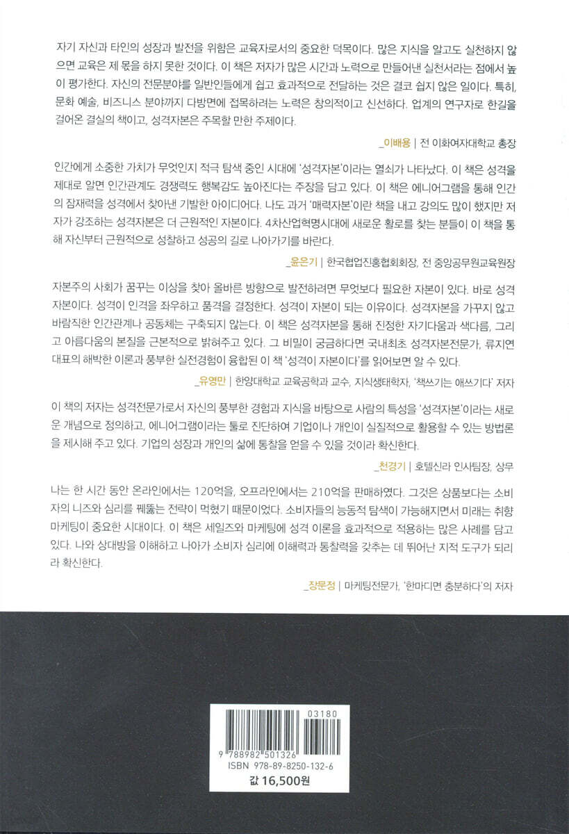 인간에게 소중한 가치가 무엇인지 적극 탐색 중인 시대에 ‘성격자본’이라는 열쇠가 나타났다. 이 책은 성격을 제대로 알면 인간관계도 경쟁력도 행복감도 높아진다는 주장을 담고 있다. 이 책은 에니어그램을 통해 인간의 잠재력을 성격에서 찾아낸 기발한 아이디어다. 나도 과거 ‘매력자본’이란 책을 내고 강의도 많이 했지만 저자가 강조하는 성격자본은 더 근원적인 자본이다. 4차산업혁명시대에 새로운 활로를 찾는 분들이 이 책을 통해 자신부터 근원적으로 성찰하고 성공의 길로 나아가기를 바란다. - 윤은기 (한국협업진흥협회회장, 전 중앙공무원교육원장)