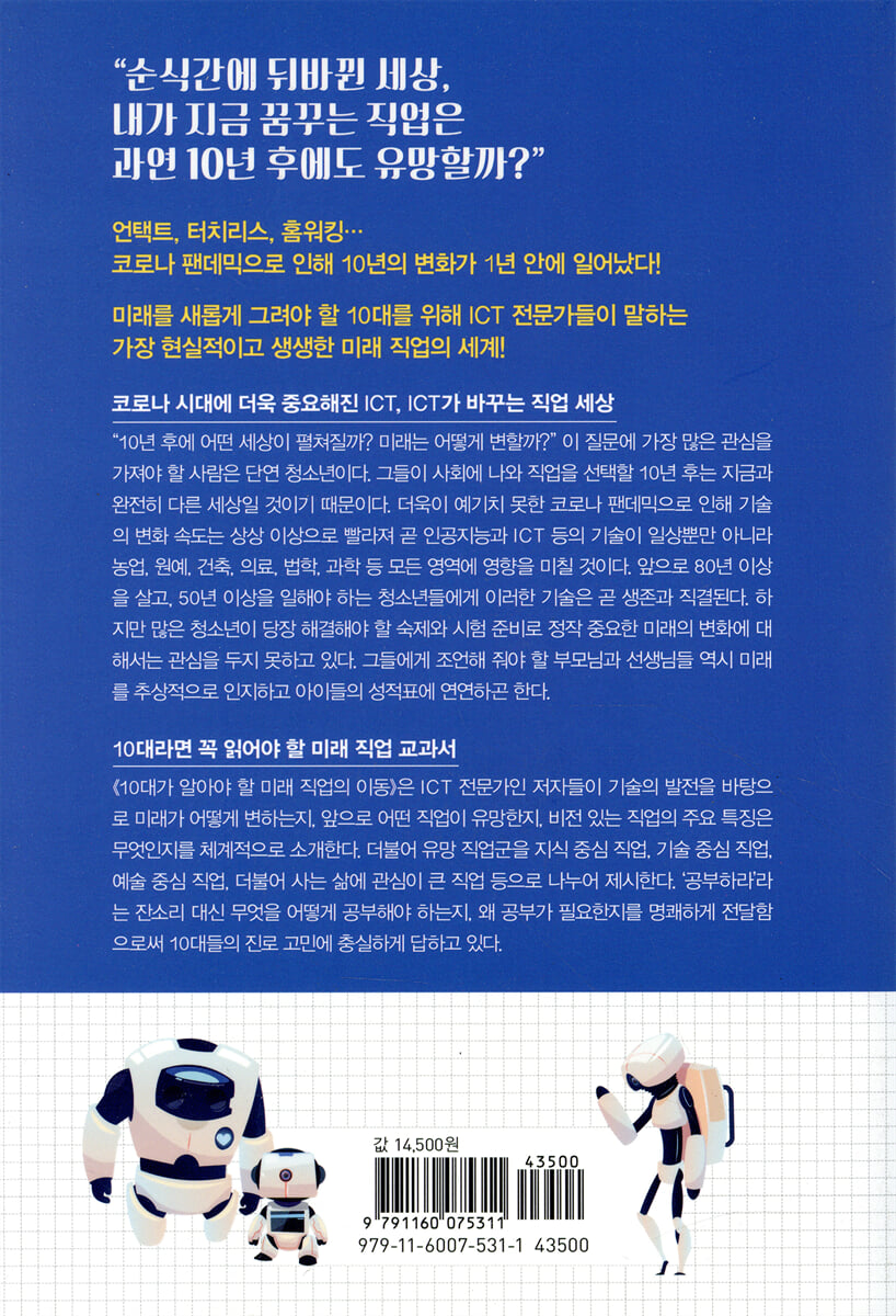 바로 늘어나는 수명입니다. 의료 기술과 다양한 생활 환경의 개선으로 우리 인간의 수명이 100세를 기대하게 된다고 합니다. 그렇다면 우리는 100세까지 회사에 다닐 수 있을까요? 지금은 말도 되지 않는 소리라고 넘길 수 있지만 인류의 수명이 120세도 가능하다는 인구학자들의 분석이 멀게만 느껴지지 않습니다. 특히나 2010년 이후 태어난 ‘지구인’들의 긴 수명은 우리에게 어떤 과제를 던져 줄지 고민해 보아야 할 시점입니다. (중략) 환경과 기술의 변화는 다양한 방식으로 우리 삶에 개입할 것입니다. 여러분에게 미치는 영향은 보다 더 광범위하고 심대할 테죠. 특히 직업 선택에 대해서는 말할 것도 없습니다. 한 예로, ‘평생직장’이라는 말은 말을 타고 서당에 간다는 말처럼 사라질 것입니다. 한 직업을 유지하는 기간은 짧아지고 평생에 걸쳐 갖게 될 직업의 수는 늘어납니다. 그래서 어떤 대학의 무슨 과를 나와 어떤 직업을 가질 것인지를 고민하는 것이 큰 의미가 없을 수 있습니다. 직업을 선택할 때 한번 진로를 정하면 끝을 봐야 한다는 생각은 과거에는 ‘바람직한 직장인의 자세’로 칭찬받았을지 모르지만, 4차 산업혁명 시대에는 변화에 유연하지 못한 직업관이라고 비추어질 수 있습니다. 앞으로 여러분이 살아갈 미래는 사회 변화에 즉각적으로 대응해서 자신의 역량을 계발하고 발전시키는 유연성이 더욱 요구될 것입니다. 사회와 미래를 큰 그림으로 파악하고 장기적으로 살펴보는 안목이 그래서 중요하죠. 더불어 직업이 요구하는 개인 역량의 수준은 상당히 높고 복잡해질 것입니다. ---「프롤로그: 코로나 팬데믹이 더욱 앞당긴 새로운 세상 앞에서」중에서 인공 지능의 기세가 무섭습니다. 기술 전문 신문뿐 아니라 종합 일간지의 한 면에서 인공 지능에 관한 기사를 찾아내는 것은 아주 쉬운 일이 되었습니다. 이제 우리는 인공 지능에 대해 말 한마디 못하면 시대에 뒤처지는 느낌을 받아야 하는 지경에 이르렀습니다. 하루가 멀다 하고 소개되는 새로운 기술들에 대해 기본적인 지식이라도 익히는 것 역시 그리 만만한 일이 아닙니다. 얼마나 복잡하고 새로운 일들이 일어날지 도무지 예측할 수 없습니다. 20세기에 이 땅에 살던 선배들은 우리가 지금의 인공 지능을 대하는 그런 마음으로 ‘영어’라는 장벽에 맞서 싸웠습니다. 영어를 잘 할 줄 모른다고 하면 왠지 뒤처지는 느낌이고 쑥스럽고 부끄럽기까지 한 마음의 부담을 가지고 살아야 했습니다. 다른 나라의 언어를 습득한다는 것이 어렵고 지루하고 고된 일이지만 말 한마디 못 하면 세계화에 적응하지 못하고 있다는 좌절감이 지배하던 시기였죠. 이제 20세기 한국인을 고단하게 했던 영어의 시대는 가고 서서히 그 자리를 AI(Artificial Intelligence), 즉 인공 지능에 내어 주고 있는 것 같습니다. 좀 더 넓게 말하면 신기술의 시대를 맞이하고 있는 것이죠. 어렵게만 느껴지는 인공 지능은 20세기에는 IT로, 21세기 초에는 ICT로 이름을 바꾸어 늘 우리 곁에 있었던 개념입니다. 인공 지능이라는 말이 소개된 지는 거의 70년이 되고 있습니다. 지난 70년간 주변을 떠돌던 그 말이 갑자기 왜 우리 삶에 이렇게 중요하게 등장했을까요? 실험실 과학자들의 전유물처럼 여겨지던 인공 지능이 이처럼 빛을 보기 시작한 것은 많은 과학자가 기울인 그간의 노력이 결실을 맺어 드디어 생활에 직접적으로 도움을 주는 ‘생활형 인공 지능’으로 다가오고 있기 때문입니다. ---「Part 2 10년 후, 달라질 미래, 01 20세기 영어 = 21세기 ICT」중에서 최근 미국에서 가장 적극적으로 로봇과 인공 지능 기계를 도입하여 일자리 자동화에 속도를 내고 있는 직종은 어떤 분야일까요? 최첨단 IT 회사일까요, 아니면 대기업 공장일까요? 정답은 바로 요식업계랍니다. 미국 노동청에 따르면 최저 임금을 받는 노동자의 대부분이 웨이터나 주방 보조 등 음식 서비스업에 종사한다고 합니다. 2013년 당시 이들의 임금은 시간당 7.25달러였는데요. 하루 8시간씩 20일을 일해도 1,160달러, 우리나라 돈으로 환산하자면 130만 원이 채 되지 않는답니다. 최근인 2019년부터 샌프란시스코를 비롯해 일부 지역에서 이들의 최저 임금 수준을 시간당 11달러로 올리기 시작했고 더 나아가 15달러까지 두 배 이상 올리려는 움직임이 일어나고 있어요. 근로자 입장에서는 희소식이지만 인건비를 지불해야 하는 가게 사장님들은 울상이 되었습니다. 최저 임금 수준이 높아져 인건비가 상승할 것이기 때문이죠. 그래서 레스토랑 운영자들이 일자리 자동화에 가장 적극적으로 동참하는 현상이 벌어지고 있습니다. 일자리의 자동화와 관련하여, 영화 [해리 포터] 시리즈의 촬영지로 더욱 잘 알려진 옥스퍼드 대학교에서는 여러분이 성인이 되었을 때 마주할 일자리의 모습을 연구하고 있는데요. 최근 다소 충격적인 연구 결과를 공개했습니다. ‘고용의 미래’라는 제목의 보고서에 따르면, 2020년까지 200만 개의 직종이 생겨나지만 반대로 710만 개의 직종은 사라질 거라고 했습니다. 마치 옥스퍼드 대학교에 해리 포터가 나타나 마법을 부린 것처럼, 우리 주변에서 일상적으로 만나던 직업이 사라지고 있