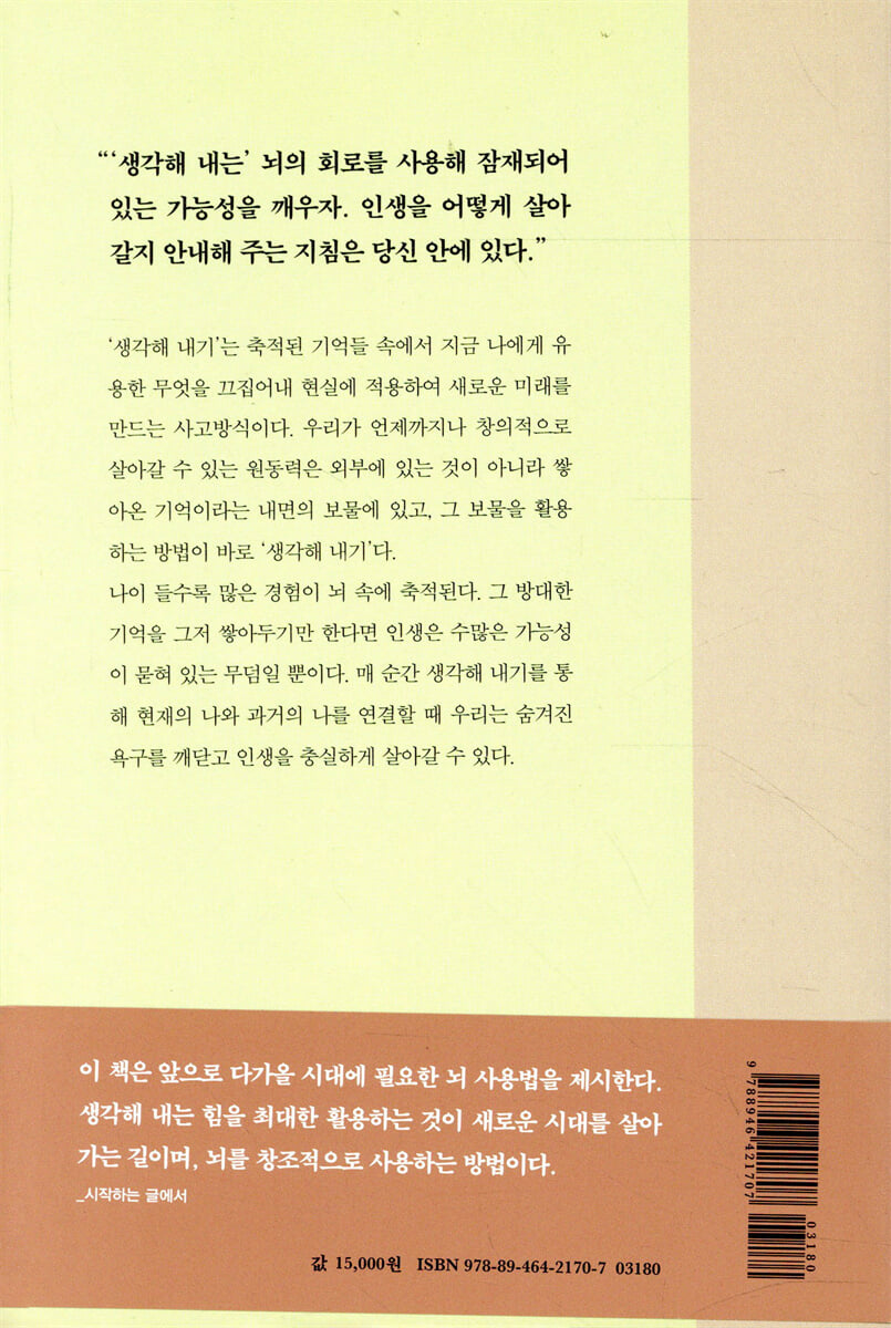 우리는 매 순간 기억한다. 일상에서 보고, 듣고, 느끼는 모든 정보가 감각기관을 통해 들어와 고스란히 뇌에 저장된다. 저자에 따르면, 여기에서의 기억은 ‘저장하기(기억하기)’, ‘보존하기’, ‘출력하기(생각해 내기)’라는 기억의 세 과정 가운데 ‘저장하기’에 불과하다. 이 책은 기억의 세 번째 과정인 ‘출력하기(생각해 내기)’에 주목한다. 정보 과잉 시대, 인공지능의 등장, 예측할 수 없는 미래를 눈앞에 둔 오늘날, 단순히 기억해서는 경쟁력을 갖추고 살아남기가 어렵기 때문이다. ‘생각해 내기’는 축적된 기억들 속에서 지금 나에게 유용한 무엇을 끄집어내 현실에 적용하여 새로운 미래를 만드는 사고방식이다. 이 사고방식을 거듭할수록 ‘기억하는 뇌’에서 벗어나 ‘생각해 내는 뇌’를 장착할 수 있다. ‘생각해 내는 뇌’가 당신의 ‘새로운 미래’를 만든다 우리는 생각해 내기를 통해 현재의 나와 과거의 나를 연결할 수 있다. 이때 잠재된 가능성은 깨어나고, 잊고 있던 욕구가 되살아난다. 욕구와 가능성을 가진 사람은 다른 미래를 만들 수 있다. “생각해 내기가 향수에 그치는 것이 아니라 미래를 만들어가는 힘”인 이유다. 생각해 낸다는 것은 무의식에 주의를 기울이는 일이기도 하다. 이를 통해 의식과 무의식을 동시에 자극하면 뇌의 균형이 이루어져, 사물을 한쪽으로 치우친 시각이 아니라 다각적인 측면에서 바라볼 수 있다. “그 결과, 미래에도 ‘세계가 이대로 계속 이어질 것이다’라는 식의 사고는 하지 않게 된다.” 뇌가 현실에 집착하지 않고 자유롭게 발상해 지금과는 완전히 다른 미래를 상상할 수 있기 때문이다. 창의적인 삶, 지금 이 책으로 시작하라 어린아이는 단순히 기억하지 않는다. 언제나 호기심 만발한 몸짓을 동반해 외부 대상을 받아들이고는 ‘엄마, 저번에 그런 일이……’라고 운을 띄우며 생각해 내는 뇌의 회로를 가동한다. 이 책은 어린아이의 에너지를 가지면 창의적으로 살 수 있다고 강조한다. 호기심 어린 눈으로 현실을 주시하다가 순간순간 내면에 쌓인 기억을 떠올려 새로운 걸 만들어내기 때문이다. 우리가 언제까지나 창의적으로 살아갈 수 있는 원동력은 외부에 있는 것이 아니라 쌓아온 기억이라는 내면의 보물에 있다. 그 보물을 활용하는 방법이 바로 ‘생각해 내기’다. 무엇보다 나이 들수록 축적된 경험이 많아지기 때문에 끊임없이 창의적인 사람으로 거듭날 수 있다. 무엇이든 좋다. 잠깐이라도 내면을 들여다보자. 생각해 내려고 애쓰는 순간부터 창의성의 문은 열리기 시작한다. |