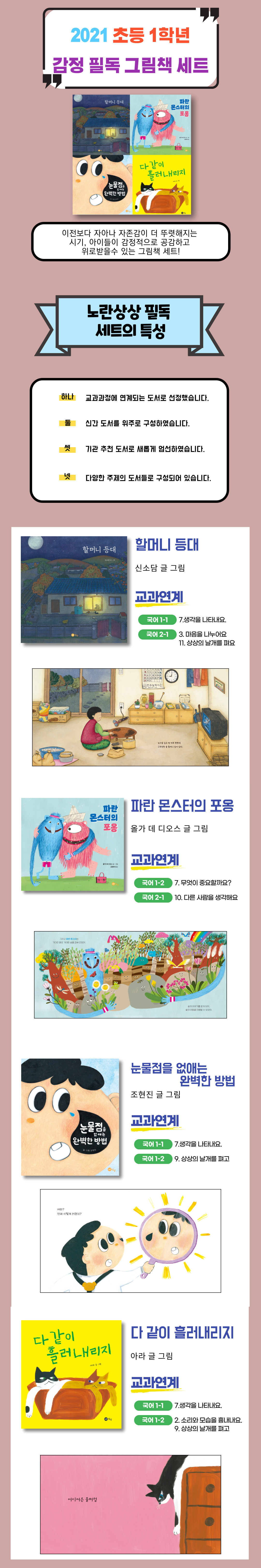 ★KBBY 추천 도서 ★으뜸책 선정 가을의 어느 늦은 밤, 유독 밝게 불을 밝히는 어느 집이 있어요. 이모에게 줄 마늘 껍질을 벗겨 내느라 꾸벅꾸벅, 삼촌에게 줄 못난이 콩을 골라내느라 꾸벅꾸벅, 막내 삼촌이 오길 기다리느라 꾸벅꾸벅, 잠을 겨우 이겨 내며 할머니는 가을 하늘보다 더 높이, 보름달보다 더 밝게 사랑을 빛내요. 파란 몬스터의 포옹 | 올가 데 디오스 글 그림 | 김정하 옮김 | ★행복한 아침독서 추천 도서 파란 몬스터에게는 커다란 입을 가진 친구와 높이 뛸 줄 아는 친구, 힘이 아주 센 친구가 있었어요. 파란 몬스터는 궁금했어요. 자신도 잘하는 게 있는지 말이에요. 그러던 어느 날 숲이 이야기를 시작했어요. 우리 모두에게 필요한 무엇에 대한 이야기였지요. 눈물점을 없애는 완벽한 방법 | 조현진 글 그림 | ★으뜸책 선정 울보 다울이에게 눈물점이 생겼어요! 심지어 점점 커지잖아요? 다울이는 눈물점을 없애기 위해 점 백과사전을 펼쳐 보았어요. 눈물점을 없애려면 웃을 때 나는 눈물이 닿아야 한 대요! 과연 다울이의 눈물점은 깨끗하게 사라질 수 있을까요? 고양이춤 | 아라 글 그림 | ★2021 북스타트 플러스 선정 도서 학교 공부로, 회사 일로, 온몸이 뻣뻣하게 굳어 있나요? 피곤한가요? 그렇다면 우리 모두 힘 빼고 흘려내려 봐요! 꽁꽁 언 얼음이 온기에 흘러내리듯, 고양이 털처럼 노곤하고 부드러운 마음을 전하는 책! |