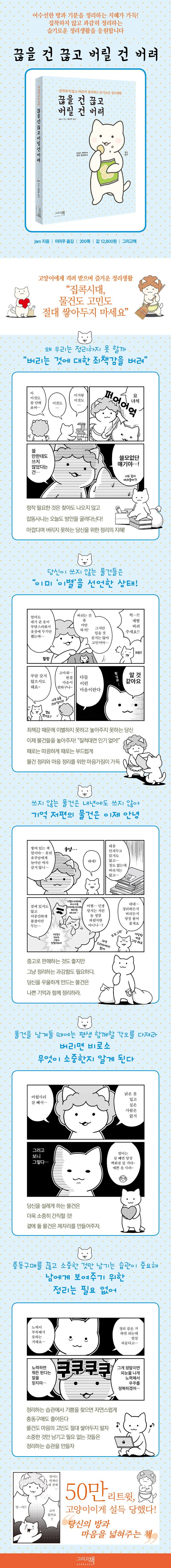 “집콕시대, 물건도 고민도 절대 쌓아두지 마세요” 바야흐로 정리의 시대다. 미니멀리즘이 유행했던 시기에도 나와는 상관없는 이야기라고 넘어갔지만 지금의 분위기는 사뭇 다르다. 먼저 집안에 머무는 시간이 늘어나다보니 집 구석구석에 쌓여있는 잡동사니가 눈에 들어오기 시작했다. 왜 이렇게 쓸데없는 것들을 쌓아두었을까. 게다가 생수나 마스크와 같은 생필품들을 조금씩 저장해야 할 필요가 생겼다. 말끔하게 정리하면 좋을 텐데 하는 소리가 절로 나온다. 통계에 의하면 현대인들은 평균 1만 개의 물건을 소유하고 있으며, 특히 옷과 섬유는 1년에 30kg가 넘는 양을 소비한다고 한다. 포장이사를 하면 5톤 트럭에 짐이 한가득 실린다. 집안에는 온갖 물건들이 넘쳐나고 옷장은 언제 샀는지도 모를 옷들로 가득하다. 하지만 정작 필요한 것은 찾아도 나오지 않고, 눈에 보이는 것들은 자기 자리를 찾지 못해 오늘도 방안을 굴러다닌다. 집안을 정리하는 것은 의외로 간단하다. 필요 없는 것은 버리고 꼭 필요한 것만 남기면 된다. 남긴 물건들은 제자리를 찾아 정리하고 소중하게 여기는 것이 비결이다. 하지만 문제는 정리를 실천하지 못한다는 것이다. 왜 우리는 정리하지 못 할까 “버리는 것에 대한 죄책감을 버려” 연예인의 집안을 정리하는 프로그램이 인기다. 인터넷에는 정리 전문가가 등장해 정리의 ABC를 소개한다. 이렇게 배운 정리 노하우를 활용해 가벼운 마음으로 정리를 하려 마음먹지만 일단 시작부터 문제다. 처음부터 꽉 막힌 기분이다. 서랍이나 옷장의 물건들을 살펴보아도 도무지 버릴 것이 없다. 버릴 만큼 망가지지 않았고, 비싸게 산 물건들도 많으며, 추억이 새록새록 떠오르는 것들도 있다. 버려야 정리를 할 수 있지만 버릴 것이 없으니 정리가 안 된다. 심리 전문가들은 버리지 못하는 심리를 ‘죄책감’에서 찾는다. 언젠가 쓸지도 모른다는 ‘알뜰한 생각’에 버리지 못한다. 때로는 추억이 담긴 물건에 감정이입을 해서 버리는 것에 죄책감을 느끼기도 한다. 값 비싼 물건은 버리면 낭비라는 생각에 가지고 있어야 마음이 편하다. 선물 받은 물건은 고마운 마음을 버리는 것 같아 죄책감이 든다. 즉 물건을 버리지 못하는 이유는 바로 죄책감 때문이다. 이 책 『끊을 건 끊고 버릴 건 버려』에 등장하는 엄마 고양이는 “이미 그 물건들은 너에게 작별을 고한 상태다. 죄책감 때문에 이별하지 못하고 질질 끌고 있는 것”이라며 과감히 정리하지 못하는 어중간한 태도를 꼬집는다. 또한 “질척대면 인기 없어!”라면서 버리는 것에 대한 죄책감을 끊어내고 이별을 고한 물건들을 그만 놓아줄 것을 권한다. 소중하게 여기지도 않고 어중간하게 붙잡아만 두었던 물건들은 “그래, 내가 조금 소홀했어.” 하면서 가뿐하게 놓아주자. 주인공 고양이와 엄마 고양이는 정리를 실천하지 못하는 일상을 만화를 통해 유머러스하게 표현한다. 때로는 따끔하게 때로는 부드럽게 물건 정리와 마음 정리를 위한 마음가짐을 조언한다. 물건을 남겨둘 때에는 평생 함께할 각오를 다져라 “버리면 비로소 무엇이 소중한지 알게 된다!” 이미 당신에게 이별을 고한 물건들을 가벼운 마음으로 처분하면 당신에게 필요한 물건들만 남는다. 이제 그 물건들 중에서 당신에게 소중한 물건들을 골라내자. 소중한 물건이란 당신이 평생 아끼고 사랑할 물건이다. 필요가 있고 쓸모가 있기에 남긴 물건들이지만 좋지 않은 기억이 담긴 물건이 간혹 있다. 입고 나간 날 일진이 좋지 않았던 옷, 사이가 나빠진 친구에게서 받은 탁상시계와 같은 물건들이다. 당신을 우울하게 만드는 징크스를 가진 물건도 나쁜 기억과 함께 정리하자. 중고로 판매하는 것도 좋지만 시간도 필요하고 망설이게 될 수 있으니 그냥 정리하는 과감함도 때로는 필요하다. 이런 과정을 거치면 소중하게 생각하는 물건들은 더욱 아끼게 되고 버릴까 고민하던 물건들은 죄책감을 끊어내고 가뿐한 마음으로 버릴 수 있다. 곁에 두고 싶은 물건은 제자리를 만들어주고 항상 그곳에 정리하도록 한다. 또한 망가지지 않도록 소중하게 관리해야 한다. 이렇게 평생 함께할 각오를 다진 물건만 남게 되면 당신이 인생에서 진정 소중하게 생각하는 것이 무엇인지 비로소 보이게 된다. 충동구매를 끊고 소중한 것만 남기는 습관이 중요해 “남에게 보여주기 위한 정리는 필요 없어” 쓸데없는 물건들을 버리고 소중한 물건들만 남겼다면, 이제 평소 집안을 정리하는 습관을 가지는 것이 중요하다. 하지만 바쁘다보니 정리나 청소를 미루곤 한다. 죄책감을 감내하면서 버렸지만, 어느새 새로 산 물건들이 쌓이기 시작한다. 마치 새해 첫날, 다이어트를 결심하지만 3일 만에 그만두는 격이다. 그렇다면 정리 습관은 어떻게 만들어야 하는 것일까? 짧게는 하루에 10분이라도 꾸준히 반복하는 것이 필요하다. 처음에는 귀찮지만 착실하게 정리되는 방을 보고 기쁨을 느끼면 된다. 반복된 정리 행동과 이에 기쁨을 느끼는 보상 심리의 사이클은 당신의 뇌에 긍정적으로 각인된다. 이렇게 비로소 습관의 고리가 하나 형성되는 것이다. 절대 무리한 계획을 세우는 것은 