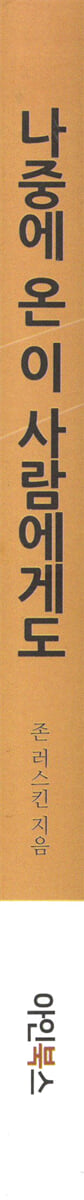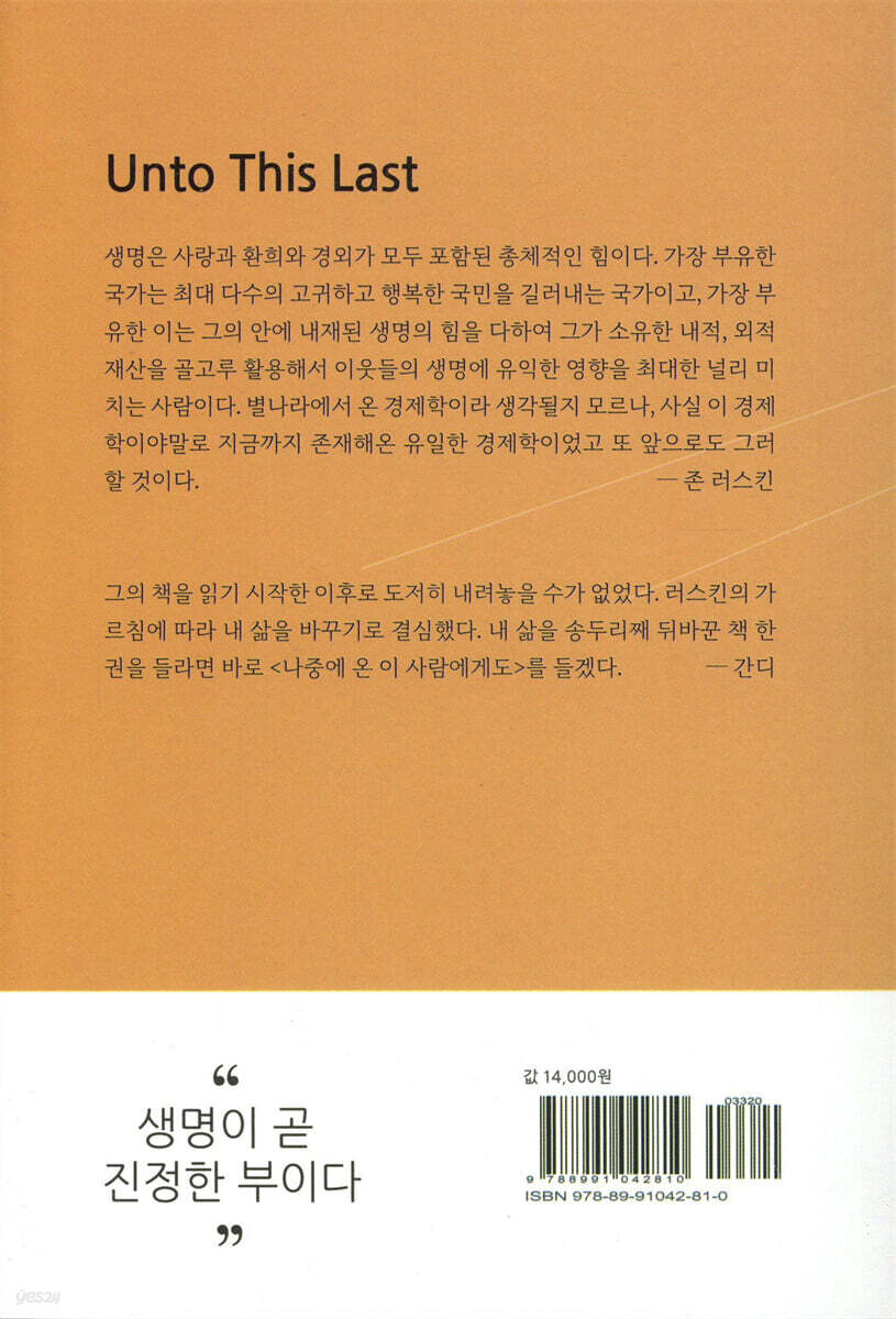 “진짜 경제학은 생명을 향해 나아가는 물건을 열망하고 그 때문에 일하도록, 그리고 파멸로 이끄는 물건을 경멸하고 파괴하도록 국민을 가르치는 학문이다.” ‘생명’의 가치가 유일한 척도인 그의 경제론은 정직, 도덕, 정의 등 인간의 정신적 가치들을 더 중요시하였다. 그를 통해 노동, 자본, 고용, 수요와 공급 등의 경제용어들은 새로운 시각에서 윤리학적이고 철학적인 사상을 심어주었다. 즉, 일반적인 경제학 책에서는 전혀 찾아볼 수 없는 ‘도덕’이나 ‘정직’, ‘애정’, ‘신뢰’, ‘영혼’과 같은 단어들이 그의 중심 사상의 뼈대를 이루고 있다. 굶주린 어머니와 아들이 한 조각의 빵을 놓고 이를 차지하기 위해 싸우지는 않는 것처럼 다른 인간관계도 무조건 적개심을 품고 경쟁하는 것으로 가정할 수는 없다고 주장한다. ‘천국의 포도원에는 처음과 나중이 없다.’ 이것은 하나님 나라와 구원의 영속성을 이야기하지만 존 러스킨에게는 당대에 외롭게 투쟁하고 후대에 빛을 비출만한 반-경제학의 모토가 된 성경 구절이다. ‘동일 노동, 동일 임금’의 법칙을 깨뜨리는 이 이상한 불평등은 ‘마지막에 온 이 사람에게도’ 똑같이 적용되어야 한다고 주장한다. 간디는 ‘그의 책을 읽기 시작한 이후로 도저히 내려놓을 수가 없었다.’ ‘러스킨의 가르침에 따라 내 삶을 바꾸기로 결심했다.’ ‘내 삶을 송두리째 바꾼 책 한 권을 들라면 바로 「나중에 온 이 사람에게도」를 들겠다.’고 그의 수필집에 썼다. |