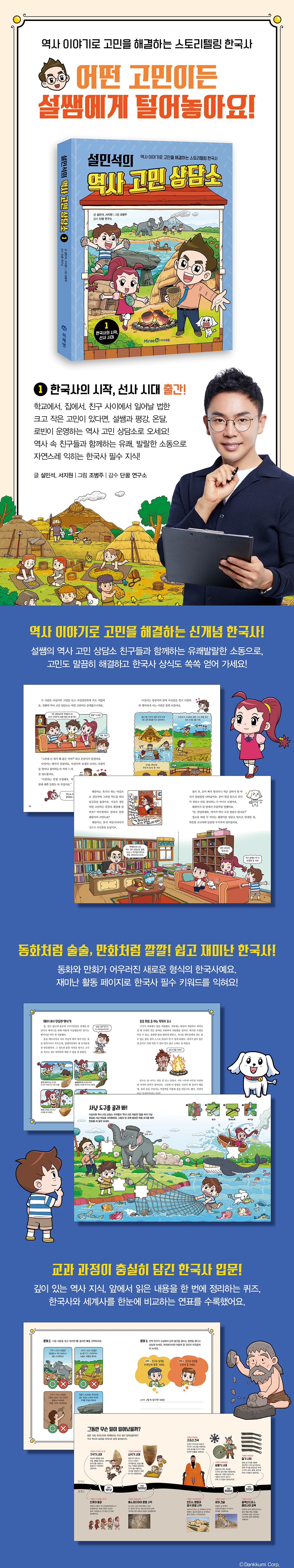 고민이 있다고? 설쌤의 역사 고민 상담소가 해결해 줄게! 『설민석의 역사 고민 상담소』는 역사 속 인물과 사건에 얽힌 이야기로 어린이들의 고민을 시원하게 해결해 주는 ‘신개념 한국사 읽기물’ 시리즈입니다. 대한민국에서 가장 사랑받는 역사 선생님, 설민석의 분신 ‘설쌤’과 두 명의 조수 온달이와 평강이, 그리고 귀여운 반려견 로빈이 운영하는 ‘역사 고민 상담소’를에서 벌어지는 유쾌한 소동을 만나 보세요. 고민도 싹 해결하고, 한국사 지식도 쏙 담아 가는 새로운 형식의 참신한 역사 동화입니다. 1권에서는 구석기 시대부터 청동기에 이르는 선사 시대를 다룹니다. 손님이 없어 파리만 날리는 ‘설쌤의 역사 고민 상담소’에 말 못 할 고민을 가진 친구들이 찾아옵니다. 설쌤은 아이들의 고민을 해결하기 위해 ‘역사 고민 처방전’ 앱을 켜서 구석기, 신석기, 청동기 시대의 인물을 차례로 소환하지만, 마음만큼 일이 척척 돌아가지 않는데……. 과연, 설쌤의 역사 고민 상담소는 아이들의 고민을 시원하게 해결하고 손님이 북적거리는 곳으로 성장할 수 있을까요? 역사 이야기로 고민을 해결한다고? 고민 해결과 역사 지식의 파격적인 만남! [무한도전], [선을 넘는 녀석들], [어쩌다 어른] 등 수많은 방송에서 역사 대중화에 힘쓰고 있는 자타공인 대한민국 ‘최애’ 역사 선생님, 설민석! 그가 이번에는 어린이들의 고민을 해결해 주기 위해 나섰습니다. ‘역사는 현재를 비추는 거울’이라는 말이 있습니다. 우리 인간은 역사를 통해 배운 교훈을 거울삼아 보다 나은 선택을 할 수 있어요. 『설민석의 역사 고민 상담소』에서 설쌤이 알려 주는 역사적 사건과 중요 인물들이 위기의 순간에 대처한 방식을 가만 들여다보세요. 고민이 시원하게 해결되는 것은 물론, 앞으로 세상을 살며 겪을 수 있는 크고 작은 어려움을 헤쳐 나갈 자양분을 얻고, 마음의 크기 또한 한 뼘 더 자라게 될 것입니다. 『설민석의 역사 고민 상담소』에서 다루는 고민들은 꽤 구체적입니다. ‘1권. 한국사의 시작, 선사 시대’ 편에서는 캠핑을 싫어하는 해찬이의 이야기로 시작합니다. 캠핑에 간다는 선생님 말씀에 반 친구들 모두 환호하는데, 해찬이는 춥고 딱딱한 땅에서 자는 건 딱 질색입니다. 설쌤은 해찬이의 고민을 해결하기 위해 ‘역사 고민 처방전’ 앱을 켜서 구석기 시대 소년을 소환합니다. 얼떨결에 현대로 소환된 구석기 소년과 역사 고민 상담소 친구들의 시끌벅적한 소동이 일어나고, 그 속에서 해찬이는 자연스레 깨달음을 얻고 구석기 시대의 생활상과 대표적인 유물?유적도 머릿속에 담아 가게 됩니다. 완전히 새로운 형식으로 재미와 학습을 동시에 잡았다! 동화처럼 술술, 만화처럼 깔깔 웃으며 읽는 한국사 『설민석의 역사 고민 상담소』는 이제껏 보지 못한 새로운 형식의 한국사 책입니다. 만화라고 부르기에는 줄글이 있어 동화처럼 술술 읽는 맛이 있고, 학습서라고 부르기에는 귀여운 그림이 담뿍 담겨 있어 책장을 넘기는 재미가 있어요. 『설민석의 역사 고민 상담소』는 설민석 선생님이 그동안 강조한 ‘지루하지 않은 한국사’라는 원칙을 충실히 구현해 낸 책입니다. 한편 단순히 재미만 추구한 것이 아니라, 탄탄한 스토리 속에 각 시대의 생활상과 역사적 사건의 흐름을 짚어 주고, 숨은 그림 찾기, 사다리 타기, 미로 찾기 등의 활동 페이지를 통해 한국사 키워드를 재미있게 익히도록 했습니다. 각 장의 마지막에 있는 정보 페이지에서는 꼭 알고 넘어가야 할 역사 지식을 그림과 사진 자료를 곁들어 설명했습니다. 마지막에는 가볍게 풀어 볼 수 있는 퀴즈가 있어 한 권의 내용을 전체적으로 정리할 수 있습니다. 따라서 억지로 암기하지 않아도, 마지막 책장을 덮고 나면 구석기 시대의 만능 도구가 무엇인지, 신석기 시대의 주요 유적지는 어디인지, 청동기 시대의 주요 특징이 무엇인지 자연스레 습득할 수 있습니다. 이 책의 마지막에는 한국사―세계사 비교 연표를 부록으로 수록하여, 시대의 흐름을 한눈에 파악하고 한반도의 개별적인 사건들이 세계사적인 관점에서 어떤 인과 관계가 있는지 상상해 봄으로써 유기적인 상상력을 키울 수 있게 했습니다. 한국사를 처음 접하는 어린이도 읽을 수 있는 나의 첫 한국사 『설민석의 역사 고민 상담소』는 초등 교과 과정을 성실히 반영하여, 초등학교 3학년부터 시작하는 한국사 수업 내용을 미리 접하고 역사 공부에 흥미를 가질 수 있도록 만들었습니다. 또한 전체 시리즈를 시대 순으로 구성하여 한국사의 전체적인 흐름을 짚고, 모든 사건을 세밀하게 학습하기보다 굵직굵직한 사건과 중요한 인물 위주로 기본 개념을 익히는 데 초점을 맞추었습니다. 따라서 학교에서 배울 한국사 수업을 선행 학습하고자 하는 어린이, 부담 없이 한국사 공부에 가볍게 입문하고자 하는 어린이, ‘그냥 재미있는 이야기를 읽고 싶은’ 어린이 모두 『설민석의 역사 고민 상담소』 시리즈를 즐길 수 있습니다. |