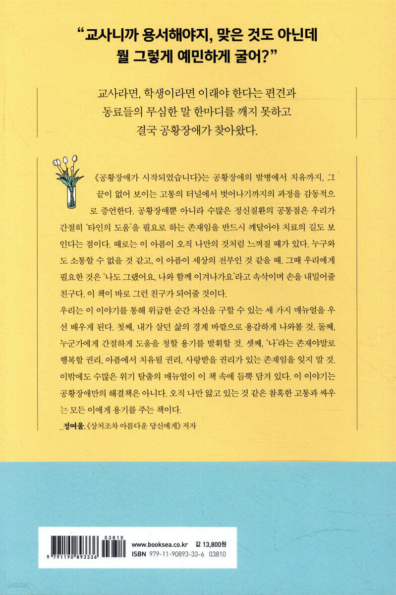 《공황장애가 시작되었습니다》는 공황장애의 발병에서 치유까지, 그 끝이 없어 보이는 고통의 터널에서 벗어나기까지의 과정을 감동적으로 증언한다. 공황장애뿐 아니라 수많은 정신질환의 공통점은 우리가 간절히 ‘타인의 도움’을 필요로 하는 존재임을 반드시 깨달아야 치료의 길도 보인다는 점이다. 때로는 이 아픔이 오직 나만의 것처럼 느껴질 때가 있다. 누구와도 소통할 수 없을 것 같고, 이 아픔이 세상의 전부인 것 같을 때. 그때 우리에게 필요한 것은 ‘나도 그랬어요, 나와 함께 이겨나가요’라고 속삭이며 손을 내밀어줄 친구다. 이 책이 바로 그런 친구가 되어줄 것이다.