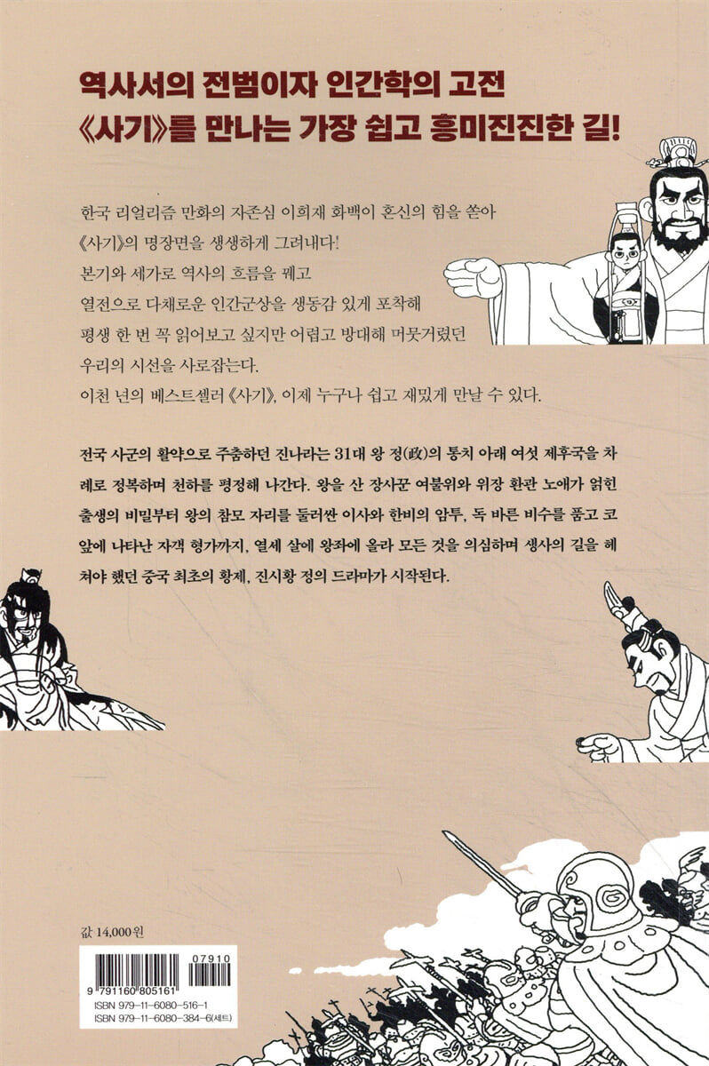 이제 만화로 쉽고, 재밌고, 드라마틱하게 만나다 ― 130책의 방대한 기록, 7권의 만화로 독파! 가장 위대한 역사책, 역사서의 전범, 인간학 교과서, 인물형의 보물창고, 동양의 탈무드, 인류 최고의 인간 드라마 등 다채로운 수식어만큼이나 2,000년을 넘는 시간 동안 수많은 사람이 찾고, 또 찾아온 불후의 고전 《사기》. 하지만 본기, 세가, 열전, 표, 서 등 130책, 5만 6,500여 자의 방대한 기록이기에 누구나 이 보물창고에 쉽게 접근할 수는 없었다. 중국 고대사를 알고 싶어서, 다양한 인간 군상의 쟁투를 통해 권력과 인간의 삶을 이해하기 위해서, 조직 안에서 성장하거나 조직을 이끌기 위해서, 오늘날에도 널리 쓰이는 고사성어의 유래를 알고 싶어서 등 다양한 이유로 《사기》를 접하지만, 완독한 사람을 쉬이 찾기 어려운 이유다. 《만화로 읽는 사마천의 사기》는 언젠가 읽어야 할 목록에 올려두었던 《사기》를 오늘 바로 펼치게 하는 《사기》의 입문서로 손색이 없다. 이 책은 《사기》의 백미인 ‘열전’을 뼈대로 하되, ‘본기’와 ‘세가’로 열전만으로는 놓치기 쉬운 중국사의 맥락을 잡아준다. 원전에 충실하면서도 만화의 장점을 살려 인물의 심리와 사건의 전개가 생생하게 펼쳐지도록 해 독자의 공감과 감동을 끌어낸다. 만화라면 모름지기 ‘재미’가 있어야 한다고 생각하는 이희재 화백의 지론대로, 재미까지 더하니 《사기》 읽기를 미뤄야 할 이유가 전혀 없다. 《사기》는 낱낱의 사건과 개개인의 드라마를 마치 유능한 극작가가 짜고 얽어서 흥미롭게 구성한 서사극 같았다. 인간사가 생생하게 그려지는 미시사이면서 고대 중국 3,000년의 거대 역사였다. (…) 나는 저마다 인물들의 매력에 취해 한참을 몰입하는가 하면, 해를 거듭하는 동안 건강의 한계와도 싸웠다. 때로 궁형을 당한 채 죽간을 채워 나갔던 사마천을 떠올렸다. 사마천의 고역에 천분의 일도 미치지 못하지만, 그가 그린 인물들을 끌어내 오늘의 세상과 대면하게 하는 현재형 《사기》를 그리는 일에 내 60대를 쏟아부었다. ―〈작가의 말〉 중에서 (4~5쪽) 2. 한국 리얼리즘 만화의 개척자이자 자존심, 이희재 화백의 만화로 재탄생한 《사기》! ― 이희재 화백 7년 만의 신작 1970년 만화계에 입문해, 1981년 데뷔작 《명인》과 《억새》를 발표한 지 40년. 60대 화백이 7년째 몰두하고 있는 작품은 《사기》를 원작으로 한 만화다. 한국 만화에 리얼리즘의 기운을 불어넣은 대한민국 만화사의 거장 이희재 화백은 산업화 과정에서 고단한 삶에도 희망을 잃지 않는 주변부 사람들의 삶을 그려내 깊은 울림을 주었고, 현실 참여적인 만화의 면면을 일깨웠다. 한편, 바스콘셀로스의 성장소설 《나의 라임오렌지 나무》, 이윤복의 일기 《저 하늘에도 슬픔이》, 위기철의 소설 《아홉살 인생》, 나관중의 《삼국지》 등 원작을 이희재식 만화로 풀어내 선보이는 것으로도 유명하다. 그는 매번 원작을 뛰어넘는 감동과 만화적 흡인력으로 독자들을 사로잡았다. 사마천의 《사기》 역시 그의 뛰어난 재해석과 탄탄한 연출력이 더해져 기대감을 불러일으킨다. 자신만의 시선으로 세세하게 우리네 삶을 살피고, 그 고단함과 허기, 따스함과 외침까지 담아내 우리 시대 열전을 써 내려온 그이기에 3,000년 전 인물을 오늘의 세상과 대면하게 한 현재형 《사기》에 그만큼 적격인 작가도 없으리라. 특히 영원한 승자도, 영원한 패자도 없는 인간사의 명멸을 다루는 《사기》를 그려내기엔 보다 깊어진 노년의 만화가의 시선이 더 맞춤할 것이다. 3. 생동하는 인물 묘사, 구성진 입담과 탄탄한 연출, 깊은 여운을 남기는 그림 ― 소장하고 싶은 《사기》의 명장면 이희재 화백은 본기, 세가, 열전을 오가며 흐름을 꿰는 인물과 사건 선정, 드라마틱한 구성, 역동적인 인물 묘사로 《사기》 속 인물들이 활보하던 역사의 현장으로 독자를 데려간다. 3,000명의 빈객을 거느리고서도 몰락의 길을 걸어야 했던 신릉군과 춘신군의 생사고락에 위·초의 비극적 명운을 담아 한 편의 서늘한 알레고리를 얽어내는 한편, 두 계부 사이에서 진왕 정(政)이 헤쳐온 정서적 고뇌와 정체성의 혼란을 선연히 그려내 진시황제라는 역사적 인물의 탄생에 인간미 흐르는 생명력을 불어넣는다. 더불어 이사와 한비 천재적인 두 친구의 대립하는 시선 구도를 세워 진나라의 통일 가도를 입체감 있게 살피게 한다. 전국 최후의 자객 형가가 풍기는 비장미는 이희재 화백의 이야기꾼 면모가 짙게 배어나는 5권의 백미라 하겠다. 이희재 화백 특유의 투박하지만 진솔한 그림은 인간사의 갈등과 그 깊이를 전하는 데 더없이 적절하게 다가온다. 총 7권으로 계획되어 있는 《만화로 읽는 사마천의 사기》는 2021년 완간 예정이다. 춘추전국의 종장을 그린 5권에서는 전국 사군의 활약으로 주춤하던 진나라가 31대 왕 정(政)의 통치 아래 여섯 제후국을 차례로 정복하며 천하를 평정해 나간다. 왕을 산 장사꾼 여불위와 위장 환관 노애가 얽힌 출생의 비밀부터 왕의 참모 자리를 둘러싼 이사와 한비의 암투, 독 바른 비수를 품고 코앞에 나타난 자객 형가까지, 열세 살에 왕좌에 올라 모든 것을 