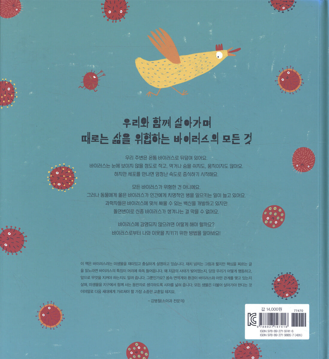 이 책은 바이러스라는 미생물을 재미있고 충실하게 설명하고 있습니다. 재치 넘치는 그림과 짧지만 핵심을 찌르는 글을 읽노라면 바이러스의 특징이 머리에 쏙쏙 들어옵니다. 왜 지금의 사태가 빚어졌는지, 당장 우리가 어떻게 행동하고, 앞으로 무엇을 지켜야 하는지도 알려 줍니다. 그뿐인가요? 몸속 면역계와 환경이 바이러스와 어떤 관계를 맺고 있는지 살펴, 미생물을 지구에서 함께 사는 동반자로 생각하도록 시야를 넓혀 줍니다. 모든 생물은 더불어 살아가야 한다는 것이야말로 다음 세대에게 가르쳐야 할 가장 소중한 교훈일 테지요. - 강병철 (소아과 전문의)