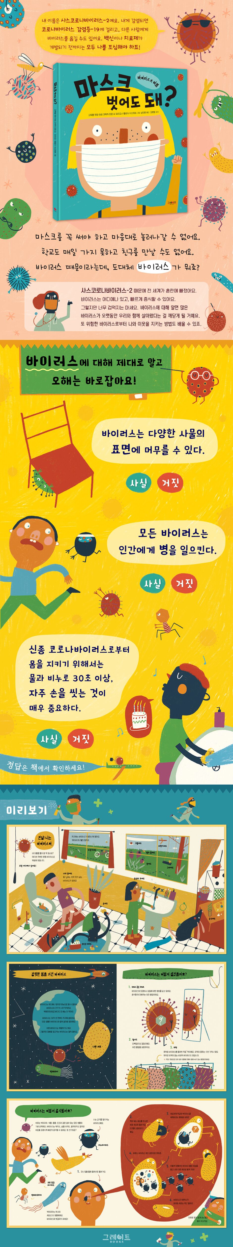 ‘코로나바이러스감염증-19’ 때문에 전 세계가 위기에 빠졌습니다. 수많은 사람들이 병에 걸려 목숨을 잃거나 아파하고 있고, 건강한 사람들도 언제 바이러스에 감염될지 몰라 불안에 떨고 있습니다. 이제 여럿이 모이는 건 위험한 일이 되었고, 외출을 할 때는 반드시 마스크를 써야 하지요. 상황이 심각해지자 세계 보건 기구(WHO)는 세계적인 전염병 대유행을 의미하는 팬데믹을 선언했습니다. 이 병을 일으키는 바이러스의 이름은 사스코로나바이러스-2예요. 바이러스는 맨눈으로 보이지 않을 정도로 작고 스스로 움직일 수도 없습니다. 하지만 사물 표면에 오랫동안 남아 있을 수 있기 때문에 바이러스에 오염된 물건을 만진 손이 얼굴에 닿거나 사람의 침방울을 통해서 다른 사람에게 옮겨 갈 수 있어요. 신종 바이러스라 아직 치료제가 없고, 백신 역시 개발 단계라서 감염된 환자가 계속해서 증가하고 있어요. 도대체 바이러스가 뭐기에 우리의 삶을 이렇게 바꿔 버린 걸까요? 바이러스를 피하는 방법이 있을까요? 바이러스에 대한 오해를 바로잡고 제대로 알아봐요 바이러스에 대해 처음 알게 되면 깜짝 놀랄 거예요. 크기는 박테리아의 천 분의 1밖에 안 될 만큼 작아서 전자 현미경을 통해 겨우 관찰할 수 있지만, 우리 주변 어디에나 있으니까요. 보이지 않지만 수는 개미보다도 많고, 무게를 모두 더하면 대왕고래 7,500만 마리의 무게와 같다고 하니 상상하기도 어렵죠. 이 책에서는 셀 수 없이 많은 바이러스 중 주로 인간과 관련이 있는 바이러스를 다루고 있어요. 과거에 많은 사람들의 목숨을 앗아 간 천연두를 비롯해 광견병이나 에볼라처럼 여전히 위험한 질병을 일으키는 바이러스를 소개해요. 하지만 너무 겁먹지는 마세요. 바이러스는 30억 년 전부터 지구에 살고 있었어요. 인간이 등장하기 훨씬 오래전이지요. 그러니 인간의 역사는 바이러스와 함께한 기록이라고 할 수 있을 거예요. 바이러스는 DNA 혹은 RNA라는 유전 물질과 단백질 껍질로 되어 있어요. 먹거나 숨을 쉬지도, 움직이지도 않아요. 하지만 바이러스는 자신과 맞는 세포를 만나면 엄청난 속도로 증식해요. 세포를 자신의 공장으로 삼아 자신과 닮은 바이러스를 마구 만들어 낼 수 있지요. 이렇게 무시무시한 바이러스로 뒤덮인 지구에서 어떻게 인간은 살아남을 수 있었을까요? 그건 모든 바이러스가 위험한 것은 아니기 때문이에요. 인간을 병들게 하는 바이러스는 일부에 불과하고 대부분의 바이러스는 생물에게 큰 문제를 일으키지 않아요. 또 다른 이유는 우리 몸의 면역 체계 덕분이에요. 만약 우리 몸에 장염을 일으키는 로타바이러스가 들어오면 어떻게 될까요? 책에는 장까지 침입한 로타바이러스를 몸의 면역 체계가 물리치는 과정이 그려져 있어요. 백혈구 캐릭터들이 침입자를 잡아먹기도 하고 항체를 만들어 바이러스를 꼼짝 못하게 만드는 장면을 보면 우리 몸이 놀랍고 든든하게 느껴질 거예요. 이게 끝이 아니에요. 싸움에서 이긴 세포들은 우리 몸에 남아 나중에 다시 같은 바이러스가 공격해 왔을 때 더 빠르고 강하게 반응할 수 있어요. 이것이 바로 바이러스의 공격으로부터 인간이 살아남을 수 있었던 비밀이지요. 과학자들은 면역 체계의 원리를 이용해서 백신을 만들었어요. 백신에는 바이러스의 정보나 힘을 약하게 만든 바이러스가 들어 있어 백신을 맞으면 우리 몸이 항체를 만드는 방법을 미리 익힐 수 있어요. 이후 같은 바이러스에 감염되면 우리 몸은 항체를 만들어 바이러스를 쉽게 물리칠 거예요. 팬데믹에 대처하는 우리의 자세 지구에 생명체가 살 수 있었던 건 바이러스 덕분이에요. 남세균(시아노박테리아)가 광합성하는 것을 도와 산소를 만들게 하고, 바이러스에 감염되어 죽은 박테리아가 다음 세대의 먹이가 되는 순환 과정에 중요한 연결 고리가 되었죠. 하지만 최근 바이러스로 인한 전염병이 유행하는 일이 많아졌어요. 세계화로 사람들이 나라 사이를 자유롭게 오가면서 바이러스 역시 이동 범위가 엄청나게 늘어났어요. 기후 변화로 열대 지방에서 살던 바이러스를 가진 모기가 온대 기후 지역까지 퍼졌어요. 또 열대 우림의 나무를 베어 내자 그곳에 살고 있던 야생 동물과 인간이 접촉하는 일이 많아졌고, 동물에게는 치명적이지 않던 바이러스가 인간에게 옮겨지면서 돌연변이를 일으키는 일도 생겼어요. 우리는 바이러스가 더 이상 퍼지지 않도록 막아야 해요. 전문가의 충고를 따라 개인위생을 철저히 하고 사람들과의 만남을 줄여야 해요. 저자는 방역 수칙을 지키는 것이 우리와 우리보다 더 몸이 약한 사람들을 보호할 수 있는 방법이라고 말해요. 전염병은 혼자만의 힘으로 극복할 수 없어요. 의료 지원을 제대로 받지 못하는 사람들, 몸이 약한 사람들을 도와야 바이러스가 전파되는 걸 막을 수 있어요. 언제, 또 다른 변종 바이러스가 나타나 우리를 위협할지 몰라요. 하지만 우리가 할 수 있는 일이 있어요. 최근 바이러스의 유행은 인간의 잘못에서 비롯된 경우가 많았거든요. 지금이라도 우리는 숲과 바다에서 야생 동물이 잘 살아갈 수 있도록 환경 보호에 관심을 기울여야 해요. 좁은 공