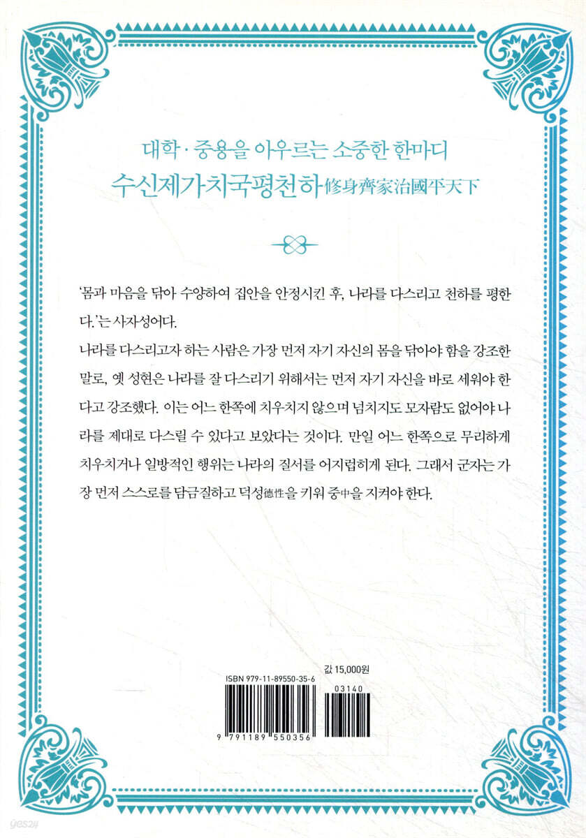 대학 大學 대학장구 서 大學章句序 _14 독대학법 讀大學法 _27 제왕학 대학 대학장구대전 帝王學大學 大學章句大全 _48 경문 經文 _50 전문 傳文 _58 제1장 능히 큰 덕을 밝히다 _59 제2장 백성을 진작시켜 새롭게 하다 _60 제3장 지극히 착한 경지에 이르다(止於至善) _61 제4장 시작과 끝, 근본을 알다 _66 제5장 사물의 이치를 깨닫다 _67 제6장 군자는 그 뜻을 성실히 하는 것이다 _69 제7장 수신은 몸과 마음을 바로잡는 데 있다 _73 제8장 제가齊家와 수신修身의 관계 _75 제9장 나라와 집안의 관계를 설명하다 _77 제10장 치국평천하를 논하다 _85 중용 中庸 중용장구 서 中庸章句序 _104 독중용법 讀中庸法 _128 중용장구대전 中庸章句大全 _138 제1장 천지와 만물이 나와 일체이다 _141 제2장 군자가 중용하는 이유 _152 제3장 중용의 덕德 _154 제4장 도가 행해지지 못하는 이유 _155 제5장 밝지 못하니 도가 행해지지 못한다 _158 제6장 순임금이 큰 지혜를 가지셨다 _159 제7장 공자는 지혜롭지 못하다 _161 제8장 중용의 도를 선택하다 _163 제9장 천하와 국가를 평화롭게 하다 _164 제10장 군자는 화和하되 흐르지 않는다 _166 제11장 중용의 도를 따라 행하다 _172 제12장 군자의 도道의 시작 _175 제13장 군자가 지켜야 할 중용의 도 _181 제14장 군자는 자기의 위치에 따라 행할 뿐이다 _189 제15장 군자의 도道는 가까이 있다 _194 제16장 천지조화, 공덕의 위대함 _196 제17장 군자는 천명을 받는다 _202 제18장 근심이 없는 자는 천하를 평정한다 _206 제19장 종묘의 제로써 중용의 도를 말하다 _211 제20장 정치는 도로써 행한다 _218 제21장 성실이 본성을 감화시킨다 _251 제22장 성실한 사람은 천하와 함께 한다 _252 제23장 천하지성 _254 제24장 믿음과 성실은 도道 _256 제25장 성실과 참된 도리 _258 제26장 성실은 천도天道 _262 제27장 군자가 도를 행하는 방법 _273 제28장 성인은 천자가 되어야 한다 _278 제29장 군자는 천하의 명예를 따른다 _283 제30장 천지天地의 도 _291 제31장 성인 지성至聖 _295 제32장 성인의 도리 _298 제33장 비단옷을 입고 홑옷을 덧입는다 _301 |