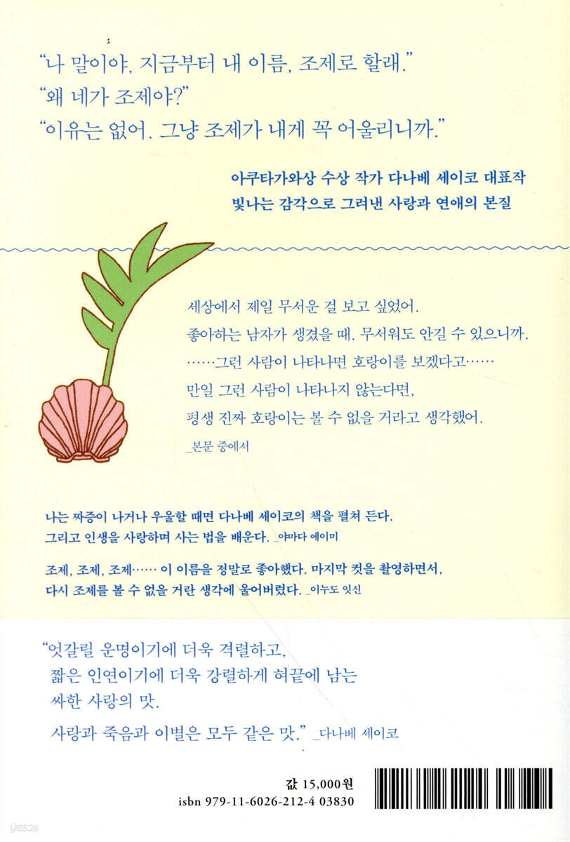 --- p.28 그런 과정을 거치면서 츠네오는 뭔가를 깨달았다. 조제가 하는 말은 거짓이 아니라 하나의 바람이며 꿈이라는 것을. 그것은 현실과는 다른 차원으로 엄연히 조제의 가슴속에 존재하는 것임을. --- p.51 노랑과 검정이 만들어낸 강렬한 얼룩무늬가 움직일 때마다 햇빛을 받아 번득인다. 조제는 호랑이의 포효에 기절할만큼 놀라 츠네오의 옷자락을 잡는다. “꿈에 나오면 어떡해…….” “그렇게 무서워하면서 보긴 왜 봐.” “세상에서 제일 무서운 걸 보고 싶었어. 좋아하는 남자가 생겼을 때. 무서워도 안길 수 있으니까. ……그런 사람이 나타나면 호랑이를 보겠다고…… 만일 그런 사람이 나타나지 않는다면, 평생 진짜 호랑이는 볼 수 없을 거라고 생각했어.” --- p.66 ‘이중인격’을 가진 우네인지라, “뭐 하러 왔어? 빨리 돌아가”라고 말할 수도 있고, “잘 왔어, 천천히 놀다가”라고 할 수도 있다. 그러나 우네는 흉기를 숨긴 채 상냥한 태도로 유지를 맞았다. “아, 잘 어울리는데. 네 거니?” 그 말이 떨어지기가 무섭게 유지는 마구 얼굴을 구기고 웃으며, “형 거야. 그냥 입어버렸어. 집에는 합숙 강습이라고 하고.” 구름도 안개도 없는 날이었다. 바다와 하늘이 아주 가까이 보인다. 유지는 방에서 바라보이는 풍경에 입을 쩍 벌리더니, 창가에 달라붙었다. 짐은 스포츠백 하나였다. “땀 흘렸지? 어서 씻어.” 우네는 유지의 넥타이를 풀어주면서, “왜 이렇게 비틀어졌니. 아직 매는 법도 몰라?” 하고 나무라듯이 말했다. 유지의 눈에 기쁨이 가득 고이기 시작했다. --- p.94~95 그런 즐거움이 있기에, 엷은 주근깨가 난 얼굴에 아름다운 꽃 무리가 떠올라 있는 것이다. 그러면서도 한편으로 우네는 생각하지 않을 수 없다. 이렇게 아름답고 즐거운 기회는, 이 한 번으로 끝나야 한다고. 다시는 가질 수 없는 시간이기에, 바닥없는 열락이 피어오를 것이다. “우리, 산꼭대기 검은 땅에 커다란 구멍을 파서, 남모를 사랑의 관을 묻나니.” --- p.102 커다란 덩치, 조금씩 배가 나오기 시작한 몸 위에, 조금 늘어진 듯한 동안이 매달려 있다. 서른둘치고는 순진한 표정에 성격도 온순하다. 그래서 여자들에게 비교적 인기가 있는 편이지만, 리에가 보기에는 어딘지 모르게 중심 뼈대가 없는 상냥함이다. 그것이 어린애 특유의 천진무구한 잔혹함과 통한다는 것을 리에는 너무도 잘 알고 있다. ‘어른이라고 보기에는 결함이 많은 상품이야.’ 그런 생각을 하면서도 옛날에는 그 어린애 같은 에고나 순진한 상냥함이 너무 귀엽게 느껴졌다. 그러나 일단 일이 터지고 보니 역시 결함 상품이라는 사실이 확연히 드러났다. ‘인간이란 정말 쉽게 맹종하고, 쉽게 헤매는 존재야.’ 리에는 그런 생각을 해본다. --- p.232 |
