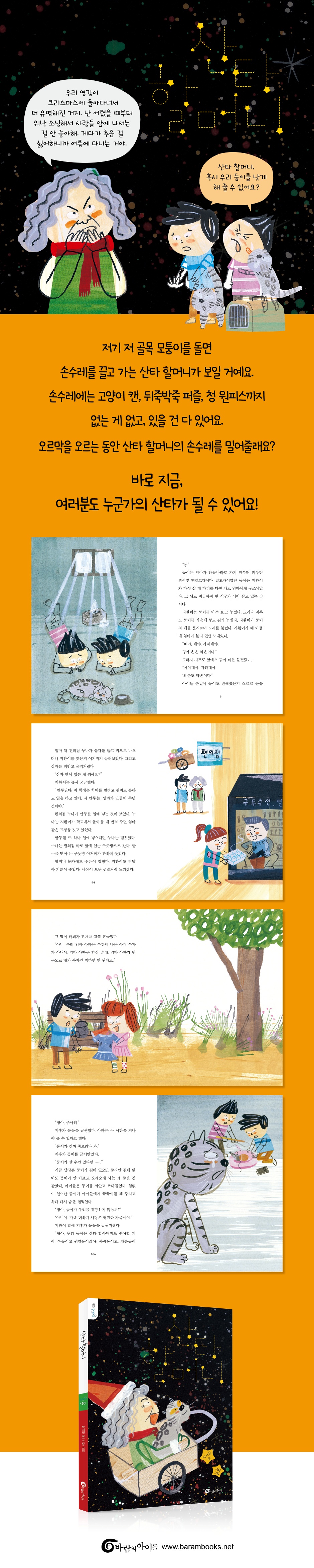 할머니의 손수레에는 어떤 선물이 들어 있을까? 크리스마스 즈음, 온 세상은 산타 클로스를 둘러싼 갖가지 재미난 소문들로 들썩인다. 산타가 우는 아이에게는 선물을 안 주고 루돌프라는 왕따 사슴에게 썰매를 끌게 하며, 핀란드 라플란드의 어느 숲속 마을에 진짜로 살고 있다는 등의 이야기는 이제 상식에 가깝다. 그보다는 산타 클로스가 하룻밤 사이 전세계를 다 돌기 위해 총알보다 3470배 빠른 속도로 이동해야 한다거나 선물 배송을 기다릴 아이들을 위해 산타 클로스의 위치 추적 시스템을 만든 사람들도 있다거나, 혹은 산타 클로스가 사실은 어느 음료 회사의 마케팅 수단이었다는 등 종잡을 수 없는 이야기들이 더 흥미롭다. 이 모든 뒤죽박죽 정보들은 산타 할아버지가 전세계적으로 얼마나 인기 많은 인물인지를 잘 보여준다. 바야흐로 12월의 산타의 시절인 것이다. 그런데 만약 이 뚱보 인기남 할아버지에게 부인이 있다면? 산타 할아버지가 있다면 산타 할머니도 있지 않을까? 저학년 동화 『산타 할머니』는 산타 할아버지의 부인이자 길고양이들의 보호자 메리 할머니에 대한 이야기다. 부끄럼쟁이에다 추위를 너무 많이 타는 할머니는 겨울에 돌아다닐 수 없고 한여름에 몰래몰래 손수레 가득 선물을 싣고 돌아다닌다. 골목길에서 만나는 길고양이들은 누가 착한 아이고 나쁜 아이인지 전해주는 정보원이고, 고양이들이 맛있는 간식 캔을 얻어먹는 건 당연한 보상이다. 하지만 대가 없는 선물도 얼마든지 가능하다. 친구들과 어울리지 못하는 아이에게는 비눗방울 장난감, 편의점 알바로 고생하는 학생에게는 엄마표 만두, 어떻게 놀아야 할지 모르는 게임 중독 아이에게는 아빠와 갖고 놀던 나무 팽이, 할머니는 선물을 받는 사람에게 꼭 필요한 맞춤 선물을 건네고, 선물을 받은 사람은 또다시 다른 사람들과 그 즐거움을 나눈다. 한여름 산타 할머니는 얼마나 살뜰한지. 하지만 산타 할아버지의 존재도 미심쩍어하는 아이들에게 산타 할머니라니, 그것도 한여름에 손수레를 끌고 다니는 할머니가 산타라니, 순순히 믿기 어려운 일이다. 이야기는 지환이, 지후 형제를 중심으로 전개되는데 형제에게는 큰 걱정이 하나 있다. 돌아가신 엄마가 키우던 뱅갈고양이 ‘둥이’가 아프다는 것. 할머니의 손수레를 밀어주고 간식 캔을 얻어다 주기도 하고, 친구 엄마가 하는 동물병원에 찾아가 진찰도 받아 보지만 도무지 방법이 없다. 둥이는 나이가 너무 많고 수명이 다했기 때문이다. 수의사 선생님도 둥이를 고칠 수 없다면 이제 방법은 하나뿐. 만약 산타 할머니가 진짜라면 믿어 보자. 그리고 둥이를 살려 달라고 부탁을 해 보자! 따뜻한 마음을 나눌 수 있다면 누구나 산타가 될 수 있고, 언젠가 우리 모두는 누군가에게 산타가 된다 『산타 할머니』는 ‘산타 클로스’ 전설에 기대어 산타 할머니라는 신기한 인물에 대해 이야기하지만 진짜 주인공은 지환이와 지후다. 형제는 엄마가 돌아가시고 아빠는 불규칙한 직업을 갖고 있어 단 둘이 지내다시피 한다. 그렇다고 해서 지환이와 지후가 불쌍하고 처량한 처지라고 볼 이유는 없다. 형은 동생을 살뜰히 돌보고 동생은 형에게 든든한 힘이 되어 주며, 형제는 천진하고 명랑한 어린이 시절을 잘 지내고 있으니까. 아빠가 일 때문에 제대로 보살펴 줄 수 없는 상황에서도 지환이와 지후는 한없이 씩씩하다. 산동네 반지하 방에 살아도 다리운동이 되니 좋고, 함께 다다다 뛰어다니면 더할 나위 없이 신이 난다. 게다가 이 밝고 건강한 아이들은 자신들이 가진 힘으로 어려움을 이겨낼 뿐 아니라 다른 사람을 도울 줄도 안다. 임시 담임으로 온 기간제 선생님이 힘들어하자 슬쩍 쪽지를 건네 조언을 하고, 오랜 수험 공부에 지친 이웃 아저씨에게 응원을 해주는 식이다. 이게 다 따뜻한 마음을 나누려는 생각이 있다면 누구나 다 산타가 될 수 있다는 산타 할머니의 말씀 덕분이다. 모두가 서로를 돕고 보살핀다면 봄여름가을겨울 어느 계절이든 크리스마스처럼 평화롭고 기쁨에 가득찬 나날이 되지 않을까? 결국 『산타 할머니』는 어린이와 노인, 길고양이 같은 모든 연약한 존재들 사이의 상호 보살핌에 대한 이야기다. 수명이 다한 고양이 둥이를 산타 할머니에게 보내 계속 살아가도록 할 것인가, 아니면 마지막까지 옆에서 지켜봐 줄 것인가. 이제 아이들은 선택을 해야 한다. 둥이의 마지막을 둘러싸고 지환이와 지후가 고민하는 이유는 둥이와 헤어지고 싶지 않지만 둥이가 행복하고 건강하게 살았으면 하는 마음 때문이다. 누군가를 사랑하고 아끼는 일은 이따금 복잡하고 난해한 수학 문제처럼 골치가 아프고 어려운 풀이 과정을 거쳐야 한다. 무엇이 둥이에게, 그리고 아이들에게 좋은 선택일까. 그리하여 마침내 지환이와 지후는 어려운 결정을 내린다. 산타 할머니를 믿든 믿지 않든 『산타 할머니』가 상징하는 바는 분명하다. 아낌없는 나눔과 선한 영향력. 누군가는 비아냥대고 누군가는 삐딱한 시선을 보내도 우리가 해마다 12월이 되면 산타 클로스를 기다리는 이유도 마찬가지다. 우리 모두에게는 산타 클로스가 필요하고, 사실은 우리 모두가 산