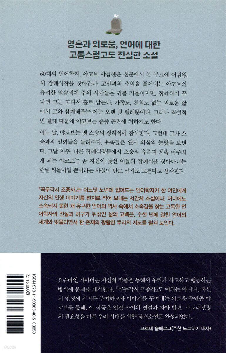 --- p.15~16 우리는 모두 각자의 이야기를 지니고 있습니다. 삶을 산다는 것은 서사의 한 장르입니다. --- p.85 그로부터 일주일 후, 나는 또 다른 장례식장을 찾았습니다. 다시 일주일이 흐른 후에도 마찬가지였습니다. 이렇게 매주 장례식장을 찾는 일은 서서히 나의 습관 또는 삶의 한 형태로 자리를 잡기 시작했습니다. 악습이라 말하는 사람도 있을 것입니다. 하지만 내가 가족의 연대감과 소속감을 느낄 수 있는 방법이라곤 그것밖에 없었습니다. --- p.217 거의 3년 동안 함께 살았던 내 아내도 친척이라곤 없는 가난한 가정에서 나처럼 외동으로 자랐습니다. 아시다시피 우리는 결혼한 후에 자식을 낳지 않았습니다. 우리의 결혼 생활은 비옥하다고는 할 수 없었습니다. 심지어는 펠레조차도 들어설 자리가 없었지요. 레이둔과 나는 소위 함께 살긴 했지만 우리의 결혼 생활은 또 다른 형태의 외로움일 뿐이었습니다. --- p.221 나는 왜 언어의 뿌리와 계보에 이처럼 큰 관심을 가지고 있을까요? 그 대답은 너무나 간단합니다. 내겐 뿌리와 계보가 없기 때문입니다. 인도유럽어족 계보를 제외하고선 내가 속한 가족적 계보는 찾을 수 없습니다. 물론, 나도 한 인간의 소속감이나 정체성은 언어와는 별개라는 것을 잘 알고 있습니다. 나는 할링달 사투리를 듣고 사용하며 자랐습니다. 할링달 방언은 노르웨이어의 일족이며, 노르드어 또는 북게르만어군에 뿌리를 두고 있습니다. 북게르만어군은 게르만어족에 뿌리를 둡니다. 게르만어족에서 갈라져 나온 어군은 북게르만어군뿐만이 아니라, 영어, 독일어, 네덜란드어, 프리슬란트어, 이디시어를 포함하는 서게르만어군, 고트어를 포함한 동게르만어군도 있습니다. 고트어는 현재 사멸하여 사용되지 않지만, 그 옛날에는 기록문자로서 큰 역할을 했습니다. 300년대 중반에 고트어로 기록된 울필라스 성경은, 룬 문자와 고대 게르만 문자를 사용한 기록물을 제외하고선 가장 오랜 역사를 자랑합니다. 전체적으로 보았을 때 게르만어족은 인도유럽어족에서 갈라져 나온 하나의 가지일 뿐입니다. 내게는 자식이나 손자가 없습니다. 형제자매나 부모도 없습니다. 하지만 나는 언어와 함께 살고 있습니다. 이 언어는 인도유럽어족에 속해 있으며, 아이슬란드부터 스리랑카에 이르는 지역에 걸쳐 수많은 친척과 자손 등을 포함하는 광범위한 계보를 자랑합니다. 또한 이 계보를 거슬러 올라가면 무려 6,000년 전이라는 시간적 공간과 접하게 됩니다. --- p.279~280 욘욘의 장례식에 참석하기 위해 세 명의 남자가 검은색 양복을 입고 외딴 유로파 도로변을 걷는 모습을 떠올리니 문득, 깊은 슬픔이 찾아들었습니다. 그토록 아련하고 깊은 슬픔을 느껴본 지가 꽤 오래되었다는 생각이 스쳤습니다. 그것은 마치 마그리트의 그림을 볼 때 느낄 수 있는 슬픔을 닮은 이상한 느낌과도 비슷했습니다. 깊이를 알 수 없는 절망감이었을까요. 나는 금방이라도 울컥 쏟아질 것만 같은 눈물을 참아내려 무진 애를 썼습니다. (…) 문득, 끝이 다가왔다는 생각이 스쳤습니다. 나이가 들면 들수록 이 세상에서의 삶이 기적처럼 느껴지는 것은 나만 경험하는 일일까요. --- p.346~347 우리의 인생에서 가장 중요한 경계선은 죽음과 삶 사이를 가르는 선이 아닙니다. 그것은 바로 사람들 사이를 가르는 경계선입니다. 대부분의 사람들은 살아 있건 죽어 있건 간에 함께할 수 있는 벗이 있습니다. 그들에게는 가족도 있고 친구도 있습니다. 하지만 나는 이곳에서조차 외부인으로, 아웃사이더로 덩그러니 홀로 서 있습니다. 나는 페리에 무임승차를 한 사람입니다. 나는 현재 살아 있는 자, 또는 한때 살아 있었던 자들의 사회에 속하지 않는 존재입니다. --- p.362~363 |