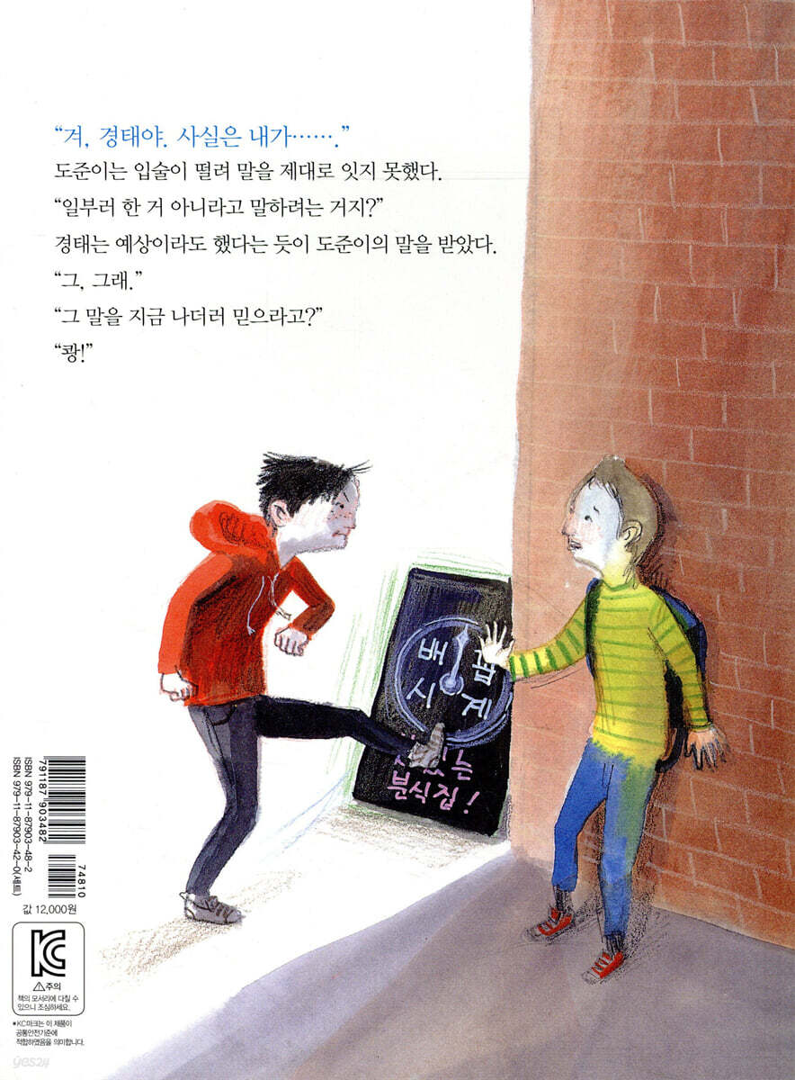 ‘아…….’ 경태의 목소리를 들은 도준이는 다리에 힘이 탁 풀렸다. 예상했던 일이지만 막상 경태의 목소리를 들으니 또다시 심장이 빠르게 뛰기 시작했다. 경태는 다짜고짜 도준이의 손목을 붙잡고 골목 안으로 들어가 접이식 간판 옆에 도준이를 세웠다. 금방이라도 도 준이를 잡아먹을 기세다. “겨, 경태야. 사실은 내가…….” 도준이는 입술이 떨려 말도 제대로 잇지 못했다. “일부러 한 거 아니라고 말하려는 거지?” 경태는 예상이라도 했다는 듯이 도준이의 말을 받았다. “그, 그래.” “그 말을 지금 나더러 믿으라고?” “정말 뒤에서 누가 나를 미는 바람에…….” “쾅!” 간판에 적혀 있던 ‘배꼽’ 글자가 경태의 발길질에 푹 찌그러들었다. “만일 내 병아리가 태어나지 못하고 죽으면…….” “쾅!” 경태가 또 한 번 간판을 세게 걷어찼다. 소리가 얼마나 컸던지 분식집 아주머니가 후다닥 뛰쳐나왔다. “누구냐! 남의 가게 간판을 부수려는 놈이!” 경태와 도준이를 발견한 아주머니는 한눈에 경태가 간판을 발로 찼다는 걸 알아챘다. “경태, 너 이 녀석…….” 눈치 빠른 아주머니는 둘 사이에 어떤 일이 있었는지도 짐작했다. --- p.47~50 |
