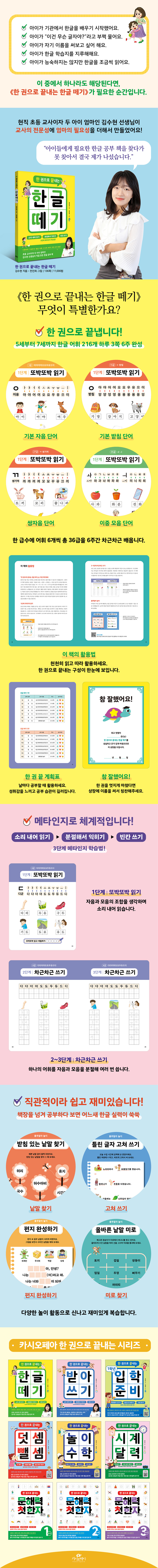 현직 초등 교사이자 두 아이 엄마인 김수현 선생님이 교사의 전문성에 엄마의 필요성을 더해서 직접 만든 한글 공부 책! [특징 ①] 한 권으로 끝냅니다! 5세부터 7세까지 한글 어휘 216개 하루 3쪽 6주 완성 『한 권으로 끝내는 한글 떼기』는 한글 공부를 처음 시작하는 단계인 만큼 아이가 내용을 따라가면서 하나하나 쉽게 해낼 수 있도록 구성했습니다. 그래서 책 속에 등장하는 낱말은 ‘자음과 모음 → 받침 → 쌍자음 → 이중 모음’의 순서를 따릅니다. 그리고 각각의 자음과 모음은 ‘아 → 가 → 라 → 다 → 나…’의 순서에 맞춰 배치했습니다. 아이들이 직접 발음하기에 가장 쉽고, 필기구를 잡고 직접 쓰기에도 쉬운 순서를 최대한 반영하기 위해 노력했습니다. 또 아이들이 일상에서 사용하는 어휘 중에서 가장 많이 등장하는 자음과 모음의 순서를 반영했습니다. 그뿐만 아니라 책을 200% 활용하게끔 도와주는 ‘이 책의 활용법’, 하루 3쪽씩 6주간 꾸준히 공부하게끔 이끌어주는 ‘한 권 끝 계획표’를 실어 복잡한 한글 공부를 한 권으로 끝낼 수 있도록 했습니다. [특징 ②] 메타인지로 체계적입니다! ‘소리 내어 읽기 → 분절해서 익히기 → 빈칸 쓰기’ 3단계 메타인지 학습법 적용 『한 권으로 끝내는 한글 떼기』는 아이가 즐겁고 재미있는 한글 공부를 할 수 있도록 처음부터 끝까지 3단계 메타인지 학습법을 적용해 구성했습니다. 메타인지란 내가 무엇을 알고 있는지를 알고 있는 것입니다. 반대로 내가 무엇을 모르고 있는지도 알고 있는 것입니다. 메타인지가 발달한 아이는 내가 ‘알고 있는’ 지식을 바탕으로 ‘모르고 있는’ 것을 탐구할 줄 압니다. 또 모르는 것은 주기적으로 반복해서 확인하는 활동을 통해 습득하려는 계획을 세울 줄도 압니다. 그리고 몰랐던 것을 알게 되었을 때 성취감을 즐길 줄 압니다. 김수현 선생님이 다년간의 경험을 마중물 삼아 이 책에 적용한 3단계 메타인지 학습법을 소개합니다. 1단계 소리 내어 읽기 (1단계: 또박또박 읽기) 음성 언어를 제대로 사용할 줄 아는 것은 모국어 사용의 가장 기본 근간입니다. 하루에 6개의 어휘를 글자와 그림을 함께 보고, 자음과 모음의 조합을 생각하면서 소리 내어 읽습니다. 2~3단계 분절해서 익히기, 빈칸 쓰기 (2~3단계: 차근차근 쓰기) 무작정 보고 베껴 쓰는 연습이 아닌, 소리와 대응시키고 생각해 쓸 수 있도록 했습니다. 하나의 어휘를 자음과 모음을 분절해 여러 번 쓰고, 마지막에는 빈칸을 채웁니다. [특징 ③] 직관적이라 쉽고 재미있습니다! 책장을 넘겨 공부하다 보면 어느새 한글 실력이 쑥쑥 『한 권으로 끝내는 한글 떼기』는 아이가 책장을 넘겨 보기만 해도 무엇을 해야 하는지 쉽게 알 수 있도록 직관적으로 구성했습니다. 책 속에는 부모님을 비롯해 주 양육자가 보는 내용에만 설명 문장이 있고, 아이가 보면서 공부하는 내용에는 설명 문장 사용을 최소화했습니다. 그 대신 학습에 도움이 되는 내용으로 가득 채웠습니다. 아이가 3단계 메타인지 학습법을 적용한 공부를 마치고 나서 효과적으로 재미있게 복습할 수 있도록 글자 찾기, 미로 찾기, 편지 완성하기 등 다양한 놀이 활동을 중간중간 실었습니다. |