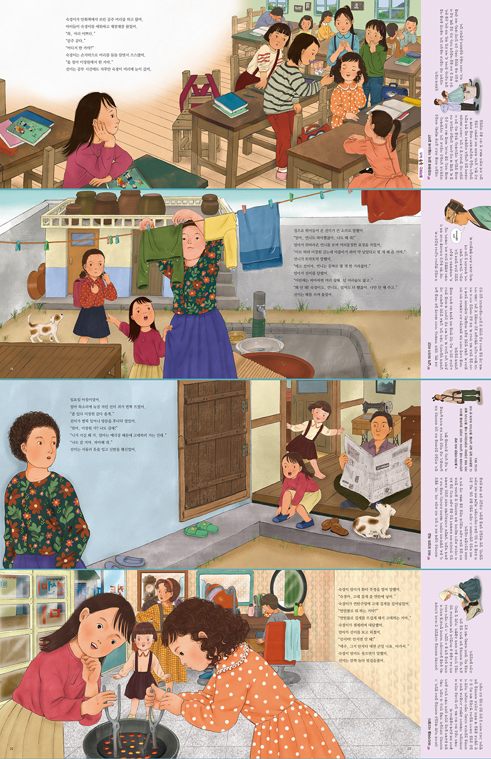 〈1970 생활문화〉는 급변하던 1960, 70년대 대한민국 생활사를 통해 오늘날을 재조명하는 어린이책 시리즈입니다. 당시 생활의 모습을 이야기로 풀어내고, 변하는 생활의 중심에 있던 소재에 대해 깊이 있고 다채로운 정보를 담아내었습니다. 우리를 변신시켜 주는 마술 가게, 미장원 지금은 미용실에 가면 파마 기계도 여러 가지고, 머리색도 원하는대로 알록달록하게 바꿀 수 있다. 긴 머리를 짧은 커트머리로, 생머리를 꼬부랑 파마 머리로, 검정 머리를 노랑 머리로, 마술 같은 변신이 가능한 곳이다. 하지만 1970년대에는 지금처럼 미장원이 흔하지도 않았고, 머리 모양을 바꾸는 도구도 많지 못했다. 그래서일까? 엄마들은 아줌마들의 트레이드마크가 된 ‘뽀글이 파마’를 했다. 짧게, 빠글거릴수록 오래가고 손질이 간편하다는 이유에서다. 이 책에 나오는 주인공 선미는, 미장원을 하는 엄마 덕에 파마머리를 한 숙경이가 부럽기만 하다. 자신도 굽실굽실한 파마머리를 하면 예쁠 것만 같다. 하지만 당시에는 대부분 어린이들의 머리는 집에서 잘라 주었다. 남자애들은 바가지를 씌워 그 모양대로 자르기가 일쑤였고, 여자 아이들도 바가지를 씌워 앞머리를 나란히 자르고, 길게 뻗은 머리들을 대충 다듬는 경우가 많았다. 그런 시절 파마머리는 마술 같은 일이었고, 멋지고 부러운 일이 아닐 수 없었다. 이 책은 당시 예뻐지고 싶고, 미장원에 가서 멋진 파마를 하고 싶은 선미의 시선으로 당시의 풍경, 특히 미장원의 푸경과 당시의 머리 모양, 패션 등을 잘 그려내고 있다. 미장원 놀이의 추억 어릴 때 언니나 누나가 머리를 자르거나 파마한다고 머리를 돌돌 말려 본 추억이 많이 있을 것이다. 미장원 놀이는 보통 동생들한테 이뤄졌다. ‘예쁘게 해 줄게!’, ‘멋지게 해 줄게!’라는 말과 함께 시작되지만, 언제나 만족스런 결과는 이뤄지지 않는다. 『나도 곱슬곱슬 파마해 줘!』의 주인공 선미도 마찬가지다. 선미는 미장원에 가서 파마를 하고 싶지만, 엄마에게 떼를 써도 안 된다고만 한다. 선미는 아쉬운 마음에 언니 선희를 졸라 미장원 놀이를 한다. 언니 선희는 걱정 말라며, 가위를 진짜 들고 자르기 시작한다. 멋진 커트를 예상했지만 삐뚤빼뚤 이상해진 머리. 선미가 울상을 짓자 이번에는 파마를 해 준다며 젓가락을 달궈서 머리카락을 말았다. 치지직 머리카락이 타고……, 머리는 더 손쓸 수 없는 지경에 이르고 만다. 이렇듯 이 책은 어린 시절 누구나 한 번쯤 해봤을 미장원 놀이의 추억을 소환한다. 파마한다고 아카시아줄기를 따다가 머리를 돌돌 말기도 하고, 연탄불이나 양초에 쇠 젓가락을 달구어 머리카락을 말다가 태우기도 했던 그때 그 시절, 우리의 모습을 정감 있게 그려낸다. 부모와 아이가 함께 보는 1970 그림책 이 책은 1970생활문화 시리즈의 다른 권과 같이, 당시 풍경을 잘 재현하고 있다. 머리 모양뿐 아니라, 당시 교실의 책걸상, 수돗가에서 손빨래 하는 모습, 거리에서 고무줄하는 풍경, 많은 집들에 하나씩 있던 재봉틀, 옛날 미장원의 파마 기계와 고데 집게를 연탄불로 데우는 모습 등이 정겹게 그려진다. 보기만 해도 70년대를 알아가는 계기를 주고 있다. 아이와 어른이 함께 이 책을 보며 많은 이야기를 나눌 수 있는 계기가 될 것이다. 또한 이 책은 미용과 관련된 다양한 지식도 얻을 수 있다. 미장원과 이발소는 어떻게 다르고 그동안 어떻게 변화 발전해 왔는지, 우리 조상들의 머리 모양은 어떠했는지, 뽀글이 파마가 왜 아줌마들의 트레이드마크가 되었는지, 시대마다 머리와 옷의 유행은 어땠는지, 내 얼굴형에 어울리는 머리 스타일은 무엇인지 같은 유용하면서도 재미있는 정보가 가득하다. ◆ 작가의 말 ◆ 미장원 놀이를 추억하며 처음 머리를 자르러 간 곳은 미장원이 아니라 이발소였어요. 어릴 적 살던 동네에는 이발소만 있었거든요. 요즘은 미장원이 훨씬 많은데 말이죠. 이발사 아저씨는 남동생과 내 머리를 똑같은 모양으로 깎아 주었어요. 뒤통수 아래를 파르라니 깎은 상고머리였지요. 그게 너무 싫었어요. 같은 반 친구는 긴 머리를 곱게 빗어서 양 갈래로 땋고 다녔고, 내 짝꿍은 살짝 파마한 머리였거든요. 그런데 나는 남자애처럼 상고머리라니……. 너무 창피해서 학교도 가기 싫었어요. 나는 머리를 기르고 싶었거든요. “머리에 이가 생겼는데 어떻게 머리를 길러!” 내가 머리로 투덜거리자 엄마가 야단치듯 말했어요. 나도 잘 알고 있었지만 너무 속상했어요. 그때는 머릿니가 아주 흔했어요. 그래서 우리 자매와 친구들은 대부분 짧은 머리를 할 수밖에 없었어요. 상고 머리 아니면 바가지 머리였죠. 아마 그래서 지금도 긴 머리를 즐겨하는지 모르겠어요. 동네 입구 삼거리에 미장원이 생기고 엄마랑 같이 갔던 날은 정말 잊을 수가 없어요. 미장원에는 생전 처음 보는 신기하고 재미난 것투성이였어요. 불에 달구어 머리카락을 돌돌 마는 고데기, 파마를 마는 뼈다귀 같은 막대기, 노랑 고무줄이 수북이 담긴 바구니, 파마를 마는 누런 종이, 함지박만한 보자기를 머리에 쓰고 앉아 있는 아줌마, 그중에서도 가장 신기한 건 미용사 아줌마가 만들어 내는 고데 