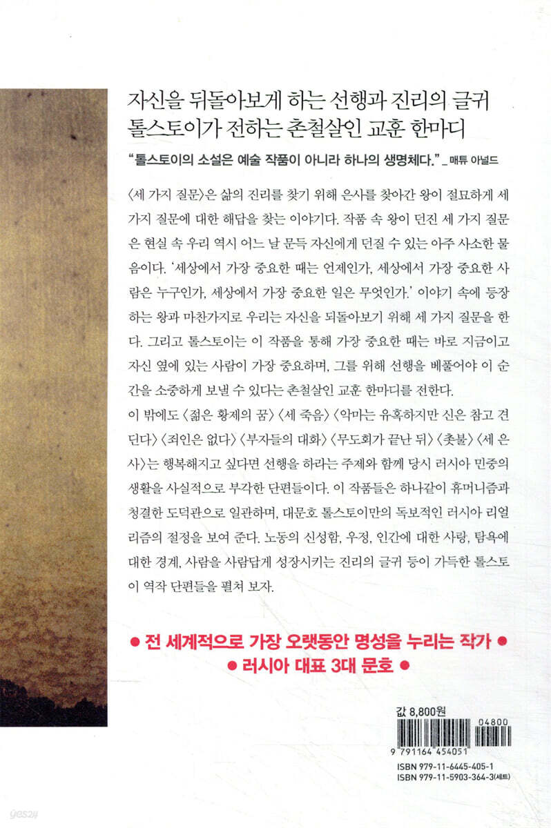 이 작품은 인간이 가져야 할 가장 기본적이면서도 중요한 삶의 방향을 제시하고 있다. 누구나 고민할 수 있는 기본적인 문제에 대한 해답을 만날 수 있으며 행복한 삶을 가꾸기 위해 무엇을 해야 할지 생각하게 한다. 작품 속에 등장하는 ‘왕’은 일을 시작할 때 알맞은 때와 귀를 기울여야 할 사람, 가장 중요한 일이 무엇인지 항상 안다면 좋겠다고 생각한다. 수많은 학자마다 생각하는 바를 듣지만 답을 구하지 못한 왕은 은사를 찾아가기로 한다. 왕은 그곳에서 우연히 상처 입은 남자를 만난다. 그리고 중요한 때는 ‘지금’이며, 필요한 사람은 ‘함께하는’ 사람이고, 가장 중요한 일은 ‘함께 있는 이에게 선을 행하는 것’임을 깨닫는다. 「젊은 황제」 나랏일을 처리하는 데 정신없는 젊은 황제는 아내와의 달콤한 휴식을 꿈꾼다. 하지만 휴식을 만끽하려던 찰나 잠이 들고, 꿈속에서 그는 안내자와 함께 여러 상황과 맞닥뜨린다. 황제는 자신과 관계있는 인물, 사건을 들여다보며 모든 것을 바로잡으려 하는데, 그 순간 황제에게 당신의 의무가 무엇인지 생각하라는 안내자의 음성이 들린다. 황제는 권력과 재물을 모두 가진 자다. 중요한 것은 그의 역할이다. 이 작품은 인간으로서 자신의 위치에서 행해야 하는 의무가 무엇인지, 이를 올바르게 실천하는 방법은 무엇인지에 대한 무한한 사유를 불러일으킨다. 「세 죽음」 이 작품은 귀족 부인, 마부, 나무, 각기 다른 세 가지의 죽음을 그리고 있다. 난치병에 걸려 죽음에 쉽게 순응하지 못하고 고통과 두려움 속에서 죽음을 맞이하는 귀족 부인, 자신의 죽음을 불평 없이 받아들이며 세르료하에게 자신의 장화를 선물하는 마부 크베오도르, 세르료하에게 생명을 바쳐 십자가가 되는 것으로 자신을 내주는 나무. 어느 순간, 죽음이 찾아온다면 우리는 과연 죽음을 어떻게 받아들일까. 과연 ‘가치 있는 죽음이란 무엇인가’에 대한 질문을 던지는 작품이다. 「악마는 유혹하지만 신은 참고 견딘다」 착하고 친절한 주인에게 그의 시중을 드는 많은 하인이 있었다. 하인들은 한결같이 그 주인을 칭송하고 다녔다. 그런데 악마는 주인과 하인이 서로 사랑하며 조화롭게 지내는 것이 마음에 들지 않았다. 그래서 아렙이라는 하인을 조종하기에 이르고, 아렙의 악마적인 행동으로 주인은 곤경에 처한다. 하지만 결국 주인은 그를 용서하고 이를 지켜보던 악마는 나무에서 떨어져 땅속에 파묻힌다. 악마의 꾐에 빠져 못된 언행을 일삼는 아렙과 그와 대비된 주인의 모습은 전형적인 선과 악의 일면을 보여 준다. 악마의 유혹에 쉽게 빠지게 되는 인간의 모습을 경계함고 동시에 선악의 뚜렷한 대비가 나타나 있다. 「죄인은 없다」 중년의 독신자 볼긴의 눈에 비친 여러 인물이 등장한다. 많은 땅을 소유하며 탐욕스럽고 과도한 탐닉에 빠진 집주인, 늙은 집사 스테판, 글도 읽을 줄 모르는 소년 등 등장인물 모두는 스스로의 선택이 아닌 주어진 신분에 가둬진 채 살아가고 있다. 부자는 부자의 삶을 가난한 자들은 가난한 삶을 반복하며 그 속에서 벗어나지 못한다. 절대적인 삶 속에서 삶의 방향을 결정하는 것은 어느 누구의 잘못도 아니라는, 성자의 마음으로 인간의 삶을 바라보는 톨스토이의 강인한 정신이 돋보이는 작품이다. 「부자들의 대화」 어느 부잣집에 손님 몇 명이 모여 인생에 대한 대화를 나눈다. 여러 이야기가 오고가지만 자신의 삶에 만족하는 사람은 단 한사람도 없다. 모두가 자신과 자신의 가족만을 위해 산다고 말할 뿐이다. 시종일관 토로하고 있는 내용은 올바른 삶에 관한 저마다의 이야기다. 이 단편에서 톨스토이는 같은 듯 다른, 인간들의 삶과 현실 상황을 교차하며 진정으로 원하는 삶과 그 방향은 무엇인지 질문한다. 「무도회가 끝난 뒤」 주인공 이반 바실리예비치는 젊은 시절 무도회에서 만난 아름다운 여인을 사랑하게 된다. 무도회에서 그녀와 그녀의 아버지(연대장)가 함께 춤추는 모습 또한 그에게는 행복감을 안겨 준다. 이와 대비되는 장면은 무도회가 끝난 뒤다. 그녀의 아버지가 도망가려다가 잡힌 죄수를 잔인하게 구타하는 장면이다. 그의 무자비한 폭력 앞에 주인공의 사랑은 식어 간다. 주인공은 그렇게 사랑 이야기를 끝맺는다. 사랑과 시련, 폭력과 무저항주의, 화려한 무도회장 안과 그와 반대인 무도회장 밖 등 톨스토이는 인간의 삶 속 존재하는 문제의식을 비교 가능한 인물, 상황으로 작품 곳곳에 배치해 형상화하고 있다. 「촛불」 포악한 마름이 소작인들을 착취하자 소작인 몇 명은 그에게 앙갚음을 하려 한다. 그러나 소작인 중 미헤예프만이 반대한다. 그럼에도 마름에게 계속된 앙심을 품고 있던 바실리는 마름에게 자신의 의견을 반대했던 미헤예프를 이간질시킨다. 하지만 불운한 사고로 마름이 죽게 되자, 미헤예프만이 그의 시신을 거두어 준다. 작품은 인간의 기본적이지만 쉽게 지킬 수 없는 인간 본성을 성찰하게 한다. ‘악을 악으로 갚지 말라’는 성경에 쓰인 신앙 메시지를 전하며 독자로 하여금 참회하는 기회를 제공한다. 「세 은사」 한 주교가 배를 타고 항해를 하던 중 신앙심이 깊은 세 은사가 