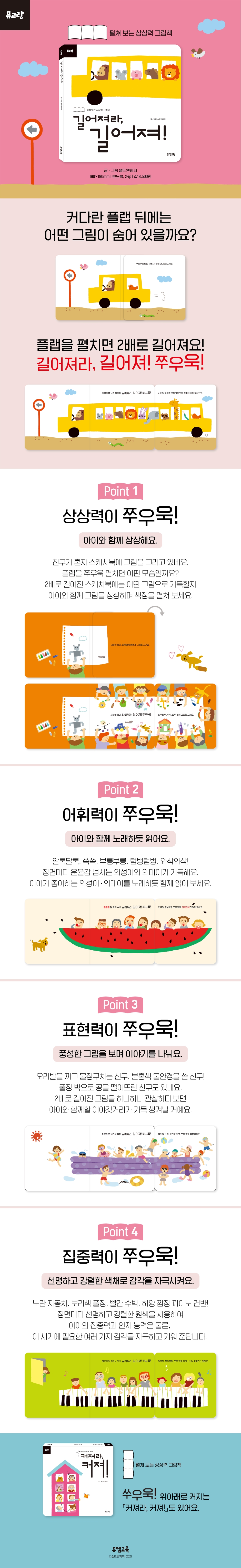 그림 속 작은 플랩을 열어 보는 기존의 플랩북들과는 다르게, 『길어져라, 길어져!』는 플랩을 펼치면 같은 그림이 2배로 길어지는 특별한 플랩북입니다. 노란 자동차가 쭈우욱 길어지면 어떤 모양이 될까요? 2배로 길어진 노란 자동차에는 또 어떤 동물들이 타고 있을까요? 아이와 함께 재미난 상상을 하며 플랩을 넘겨 보세요. 2. 어휘력이 쭈우욱! 부릉부릉, 쓱쓱, 텀벙텀벙, 와삭와삭, ……. 『길어져라, 길어져!』의 글줄에는 예쁜 그림과 어울리는 재미난 의성어?의태어가 가득 담겨 있어요. 운율감 넘치는 문장들을 노래하듯 읽으며 자연스럽게 어휘력을 기를 수 있답니다. 3. 표현력이 쭈우욱! 친구 하나가 그림을 그리던 스케치북, 플랩을 펼치니 쭈우욱! 스케치북이 2배로 길어져요. 길어진 스케치북 앞에는 친구들이 너도나도 모여 앉아 그림을 그립니다. 노란색 예쁜 꽃, 부릉부릉 파란 자동차, 알록달록 무지개, …… 다들 무얼 그리고 있을까요? 이야깃거리가 2배로 늘어난 그림을 보며 아이와 대화를 나누면, 아이의 표현력도 2배로 쭈우욱 기를 수 있답니다. |