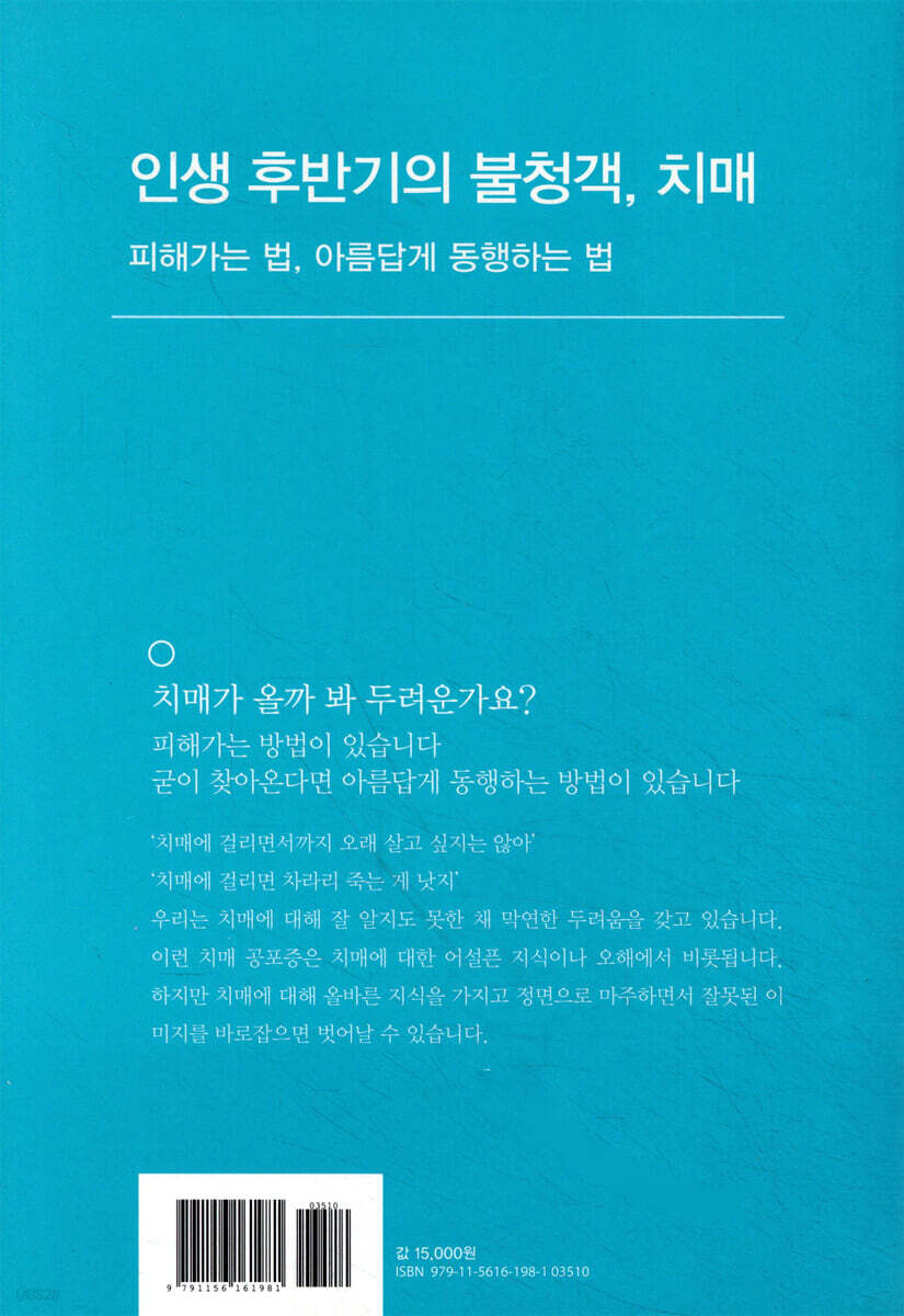 30년 경력 치매 전문의가 명쾌한 해답을 제시합니다 ‘치매에 걸리면서까지 오래 살고 싶진 않아’ ‘치매에 걸리느니 차라리 죽는 게 낫지’ 주변에서 나이 드신 어르신들이 이렇게 이야기하는 것을 많이 보았을 겁니다. 실제로 우리나라 노인들이 가장 두려워하는 질병은 치매이며, 나이가 들수록 암보다 치매를 더 무서워한다는 조사 결과가 이를 뒷받침합니다. 치매가 올지 모른다는 불안감으로 책을 읽고 방송도 찾아보지만 알아갈수록 더 두려운 치매, 그 불안은 어디에서 오는 걸까요? 30년 이상 치매 환자들을 진료해온 노인정신의학 전문의 ‘와다 히데키’ 교수는 우리가 치매에 대해 제대로 알지 못한 채 막연한 두려움만 키우고 있는 건 아닌지 반문합니다. 그는 치매를 ‘나이 들면 나타나는 질병’의 하나로 받아들이라고 조언합니다. 나이가 들면 하체가 약해진다거나, 귀가 어두워지거나 하는 것처럼, 치매 역시 나이 들어 나타나는 수많은 모습 중 하나에 불과하다는 것입니다. 다만 치매의 본질을 알 수 있는 올바른 지식은 갖춰 놓아야 한다고 강조합니다. 그래야 치매에 대한 오해에서 오는 공포감에서 벗어날 수 있기 때문입니다. 게다가 치매는 생각만큼 불행한 것은 아니라고 말합니다. 치매에도 행복한 치매가 있고 치매에 걸려도 사랑받는 사람이 있다는 것입니다. 이러한 사실을 알고 솔직하게 받아들이면 마음이 편해지고 감정이 안정되어 치매를 늦추게 합니다. 전보다 자주 깜빡하거나 판단력이 떨어진 부모님 혹은 자신의 모습에 지레 ‘치매 아닐까?’ 하는 두려움 섞인 의심부터 키우는 사람들. 그러한 경험이 있다면, 저자가 제시하는 올바른 지식을 통해 진정한 해답을 찾을 때입니다. | 이 책의 특징 환자와 가족 모두에게 당장 도움이 되는 정보 ‘부모님이 혹시 치매라면?’ 하는 생각을 떠올리면 덜컥 겁이 나고 당혹스러워집니다. 이 책에서는 치매를 진단받았을 때 어디에서 상담받을 수 있는지, 현재 어떠한 지원 제도가 있는지와 같이 실질적으로 바로 도움이 되는 정보들을 제공합니다. 치매에 걸렸을 때 실천해야 할 매뉴얼이나 간병과 관련된 제도, 치매 환자를 대하는 방법 등은 ‘당장’ 적용 가능한 정보로서 매우 유용합니다. 이 책과 함께라면 치매를 당장 마주했을 때 발생할 여러 가지 혼란을 줄일 수 있습니다. 지금 바로 실천 가능한 22가지 치매 예방법 저자는 손에 잡히지 않는 이론 중심의 예방법 대신 생활습관과 관련해 구체적이고 실천 가능한 예방법을 소개합니다. 치매 예방에 좋은 음식, 적정한 수면 시간과 같은 내용뿐만 아니라, 손글씨 쓰기나 일기 쓰기, 사람들과 교류하고 대화하기, 평소 몸을 적극적으로 움직이기 등 치매를 예방하는 방법과 그 이유를 소개합니다. 제시하는 방법을 실천한다면 치매의 발병이나 진행을 늦출 수 있습니다. 이는 치매 환자 자신과 그 가족 모두에게 효과적인 지침이 될 수 있습니다. 치매에 대비하는 필수 체크포인트 치매를 조기 발견할 수 있도록 치매 초기에 나타나는 증상을 체크리스트로 정리했습니다. 특히 치매 종류에 따른 원인과 증상, 치매 초기 증상, 단순 건망증과 기억 장애의 차이, 노인성 우울증과 치매의 차이, 일상 대화식 치매기능 평가 등 꼭 짚고 넘어가야 하는 체크포인트를 별도로 안내합니다. 이를 통해 독자들이 치매를 대비하기 위해 우선적으로 파악해야 할 사항들을 직접 체크해볼 수 있습니다. 피할 수 없다면 아름답게 동행하기 이 책의 특징은 아무도 주목하지 않았던 치매의 숨겨진 측면들을 설득력 있게 다루었다는 점입니다. 특히 사람들이 막연하게 가졌던 두려움이 ‘치매에 걸리면 성질이 난폭해지고, 정신줄을 놓으며, 주위에 폐만 끼치는 사람이 된다’는 편견에서 비롯된 것임을 밝히고, 치매의 어두운 면만이 아니라 행복한 측면도 있다는 것을 강조합니다. 피할 수 있다면 피하되 굳이 치매가 찾아왔다면 아름답게 동행하는 법, 주위에 폐 끼치지 않고 사랑받는 치매인으로 살아가는 방법이 이 책에 있습니다. 일본 전문가가 쓰고 한국 전문가가 번역한, 신뢰할 수 있는 건강서 이 책을 번역한 조기호 교수는 경희대 한방병원 중풍뇌질환센터 교수로 재직 중이며, 파킨슨병과 치매를 세부 전공으로 하고 있습니다. 쏟아져 나오는 치매에 관한 정보 속에서 그는 이 책을, 믿을 수 있는 단 한 권의 참고서라 말합니다. 30년 이상 치매만을 연구한 저자의 뛰어난 전문성에 더해 신뢰할 수 있는 주장과 최신 이론의 반영이 그 이유입니다. 또한 역자가 우리나라 실정에 맞게 현재 시행 중인 노인요양서비스에 대한 내용을 충실히 조사·반영하였습니다. 이는 치매 가정이 지원 제도를 이해하는 데에 유용한 기초자료가 될 수 있습니다. | 오해가 단번에 풀리는 질문과 답 Q. 건망증이 치매의 시작인가요? A. 치매로 인한 기억장애와 나이가 들면서 나타나는 단순한 건망증은 다릅니다. 치매로 인한 기억장애에 해당하는 증상이 없다면 단순한 건망증은 치매의 시작이 아닙니다. Q. 치매에 걸리기 쉬운 체질이 있나요? A. 유전도 하나의 요인으로 추정되고 있지만, 생활습관의 영향이 큽니다. 평소 자