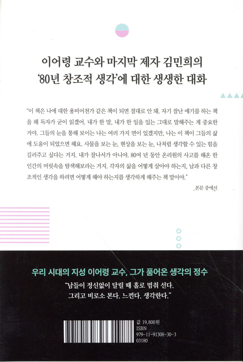 책머리의 대화_80분에 담은 80년 생각 1장. 생각의 탄생 01. 물음표가 씨앗이라면, 느낌표는 꽃이지 _창조의 씨앗 첫 번째, 물음느낌표 02. 아버지의 지적 호기심, 어머니의 문학적 감수성 사이에서 _창조의 씨앗 두 번째, 어머니의 책과 아버지의 기계 03. 창조와 파괴는 동전의 양면, 창조하려면 먼저 파괴하라 _〈우상의 파괴〉와 이상의 발굴 04. 타는 갈증으로 우물물을 마시지 말고, 우물을 파라 _말하지 못한 등단작의 비밀 05. ‘말’에 ‘말’을 걸면 세상에 없던 ‘새 말’이 나온다 _‘흙 속에 저 바람 속에’ 너머에는 06. 체제적 체제에 갇히면 그것이 바로 창조의 무덤이다 _『새벽』 『세대』 『문학사상』의 선봉에서 07. 어린아이의 눈으로 세상을 보라 _일본어로 쓴 일본 문화론 『축소지향의 일본인』 2장. 창조의 기록들 08 채우지 말고 비워라 _굴렁쇠 소년의 탄생 09. 오래된 정원에서 새로운 생각이 꽃핀다 _88서울올림픽 개폐회식 10. 글로컬리즘, 극과 극을 끌어안아 결합시켜라 _88서울올림픽 주제가 〈손에 손잡고〉 11. 관료주의는 창조의 적이다 _초대 문화부 장관 시절의 파격 행보 12. 창조적 상상력은 생활의 밑바닥에서부터 우러나온다 _쌈지마당, 우정의 문화열차, 남산자락공원 13. 궁하면 통한다, 궁즉통의 마법 _한예종 탄생의 뒷얘기, 5분 스피치의 기적 14. 반걸음만 앞서서 내다보라 _너무 일렀던 쌍방향 소통, ‘페스탈로치 프로젝트’ 15. 천진난만의 힘, 자유분방하게 사고하라 _백남준과 대전엑스포 재생조형관 16. 모두가 안 된다고 하는 걸 되게 하라 _무주·전주 동계유니버시아드의 한복 입은 스키어 17. 만인이 납득하는 아이디어는 아이디어가 아니다 _새천년준비위원장, 즈믄둥이를 낳다 18. 위기를 만들지 않는 것이 진짜 창조다 _50만 명이 모인 새천년맞이 자정행사 3장. 통찰을 넘어서 19. 생각 공장에 생각 재료부터 채워라 _디지로그와 생명자본 20. 메타언어로 쓴 문명론, 젓가락의 젓가락성을 읽다 _청주 젓가락 페스티벌 21. 현실의 색과는 다른 상상의 색을 그려라 _알파고가 한국을 점령하던 날 22 우리 안의 창조유전자를 다시 보라 _천재를 알아본 백락, 그리고 못다 이룬 창조 책말미의 대화_창조적 주체로 우뚝 서는 한국인이 되길 부록_사진으로 본 이어령의 80년 생각 |