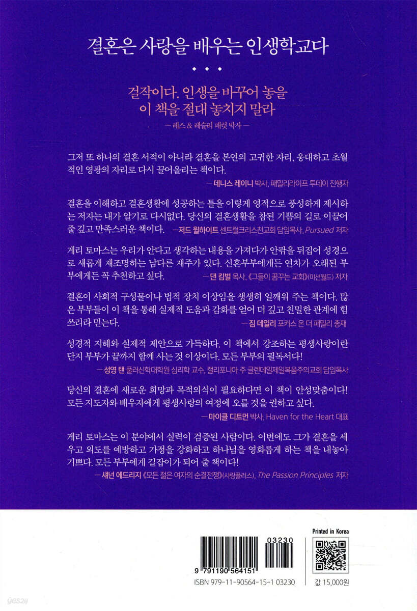 게리 토마스가 아주 알찬 내용으로 모든 부부에게 시의적절한 책을 내놓았다. 그저 또 하나의 결혼 서적이 아니라 결혼을 본연의 고귀한 자리, 웅대하고 초월적인 영광의 자리로 다시 끌어올리는 책이다. - 데니스 레이니 (박사, 패밀리 라이프 투데이 진행자)