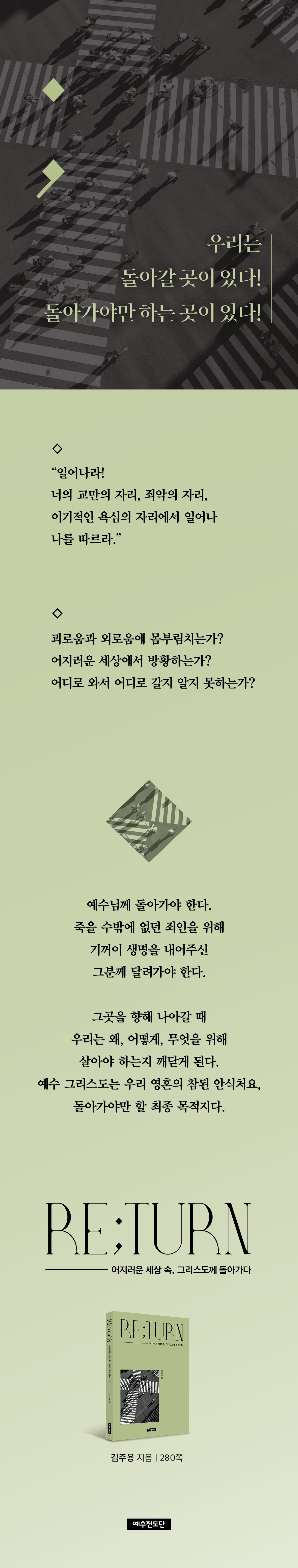 머리말 Chapter 1. 원래 상태로 돌아가다 비 올 확률 50% 하늘나라의 비유 1 간음하지 말라 위선의 회개 다시, 부르심 지혜롭고 순결하라 두려워 마라, 갈릴리로 가라 회개의 시간 Chapter 2. 책임이 돌아가다 분함이 생각나거든 그제야 끝이 오리라 무화과나무와 시대정신 하늘나라의 비유 2 거룩한 고독이 필요할 때 하나님 나라의 영성 회복 따르거나 혹은 떠나 보내거나 거창하지 않게, 필요한 곳에! Chapter 3. 어떤 결과로 돌아가다 쉼의 시간 바로 이곳에서 누리는 팔복 중용의 신앙 깨어 있으라 기억하고 있으라 하나님 나라의 시간 아직 배고프다 역류의 예수 가족의 시간 |