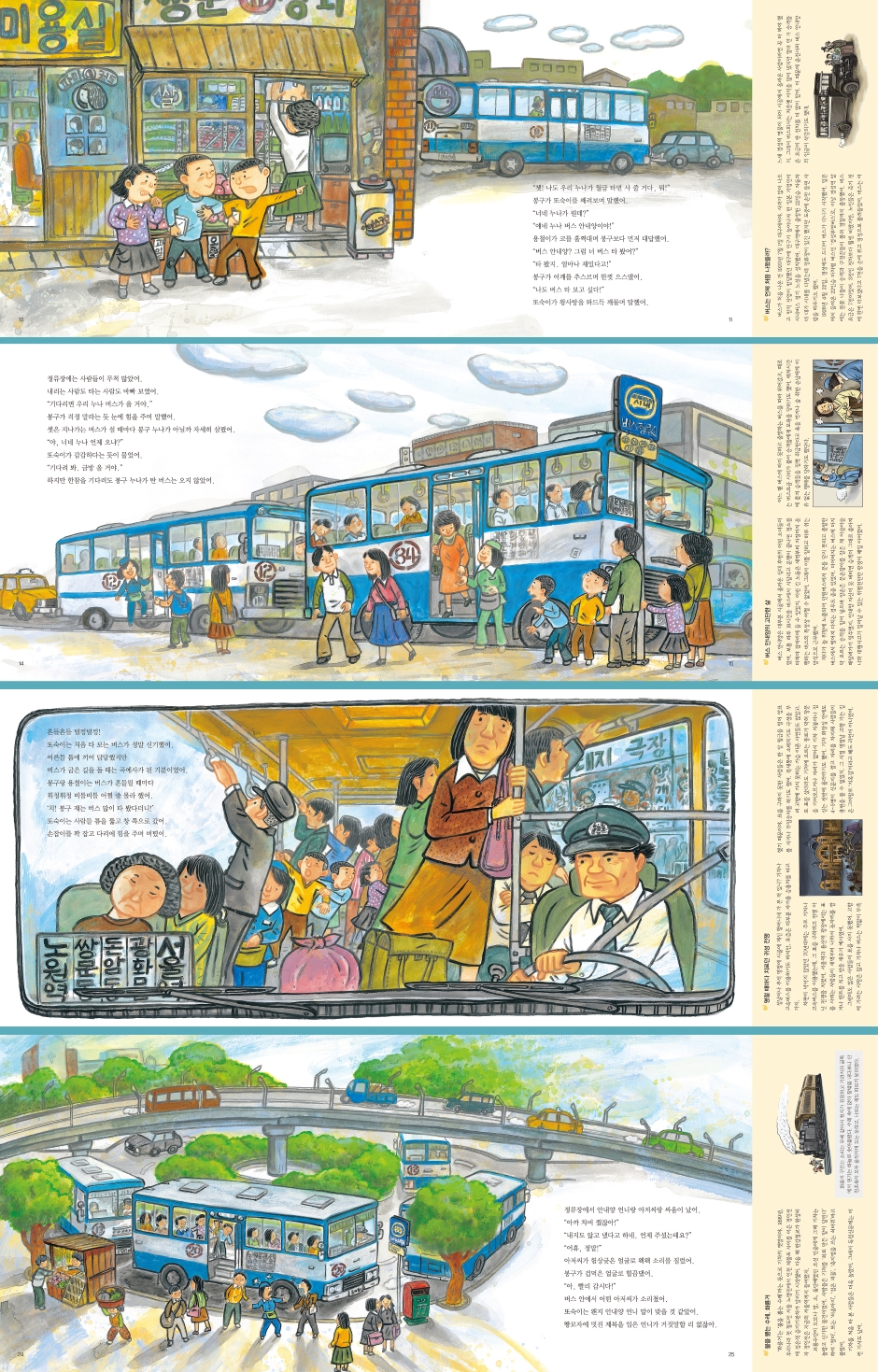 ◆ 1학년 1학기 가을 1 1. 내 이웃 이야기 ◆ 3학년 2학기 사회 3. 교통과 통신 수단의 변화 버스 처음 타 보는 세 아이의 하루 지금은 집집마다 자가용이 있고, KTX를 타면 부산까지 몇 시간 만에 뚝딱 다녀올 수 있는 시대다. 버스도 마을버스, 일반버스, 광역버스 등 이용자의 편의를 위해 세분화되고 다양해졌다. 지하철은 9호선까지 생겨서 서울뿐만 아니라 경기도와 강원도, 충청도까지 연결되었고, 과학기술의 발달로 공상만화 속에서나 보던 전기자동차들이 도로를 달린다. 이것 말고도 택시, 오토바이, 스쿠터 등 탈것이 넘친다. 불과 몇 십 년 전인 1970년대만 해도 상상도 할 수 없는 풍경이다. 당시 도로 여건과 대중교통은 매우 열악해서 대중교통하면 곧 버스였다. 그렇다고 지금처럼 버스 노선이 다양하고 많았거나 배차 간격이 촘촘한 것도 아니었다. 그러다 보니 출퇴근 시간이면 버스 안은 콩나물시루처럼 사람들로 미어터졌다. 다른 마땅한 교통수단이 없으니 어쩔 수 없었다. 하지만 버스 탈 일이 없는 아이들에게는 그런 버스라도 한번 타 보는 게 소원이었다. “너네, 버스 타 봤어?” “그러는 넌 타 봤냐?” “쟤 누나가 버스 안내양이야!” “진짜? 그럼 버스도 공짜로 타겠네!” 이 책 『버스 처음 타던 날』의 봉구, 또숙이, 용철이도 그랬다. 봉구 누나가 버스 안내양이라 공짜로 버스를 탈 수 있다는 말에 셋은 들떠서 버스를 타러 간다. 그러나 아무리 기다려도 봉구 누나가 탄 버스가 오지 않자 셋은 봉구 누나네 회사 버스 아무 거나 몰래 탄다. 버스 안은 생각만큼 좋진 않다. 어른들 틈에 끼어 숨이 막히고, 버스가 굽은 길을 돌 때에는 휘청휘청 비틀비틀 넘어지지 않으려고 버티느라 힘도 든다. 그렇지만 셋은 처음 타 보는 버스가 마냥 신기하기만 하다. 할머니에게 자리를 양보하는 ‘착한’ 아줌마도 있고, 차비를 안 내려고 버스 안내양과 싸움을 하는 아저씨도 있다. 그렇게 덜덜덜 흔들흔들. 밖은 어느새 어둑어둑해졌다. 셋은 집에 가야 하지만 어떻게 해야 할지 몰라 당황하여 울음을 터뜨리게 된다. 세 아이는 무사히 집으로 돌아갈 수 있을까? 순수했던 시절의 풍경과 교통에 관한 알찬 정보 요즘 아이들이 보기에는 이 책에 나오는 아이들은 너무도 세살 물정 모르는 것처럼 보일 것이다. 낯설게 느껴질 수도 있다. 당시 아이들이 요즘 아이들보다 더 순수했다고 얘기할 수는 없지만 지금보다 그때 아이들은 사람들과 부딪치며 살아가는 모습이 자연스러웠고, 놀거리가 적다보니 소소한 것에도 호기심과 모험심이 피어올랐다. 누나가 버스 안내양이라는 사실만으로 누나네 버스는 무엇이든 공짜로 탈 수 있다는 생각, 친구들 앞에서 자랑도 하지만 함께 누리고 싶은 마음, 버스를 타고 달리면서 휙휙 지나가는 사람들과 간판들을 신기해하고 재미있다고 느끼는 모습이 당시 아이들의 생각이고 모습이다. 버스에 탄 아이들이 보는 1970년대 풍경은 요즘 대중교통을 타고 갈 때 만나는 풍경과는 차이가 있다. 요즘은 다들 차에 타면 스마트폰 보기 바빠서 주변 풍경은커녕 앞 사람, 옆 사람의 행동에도 무관심하다. 하지만 세 아이가 만나는 버스 안 풍경이나 버스 밖 풍경은 좀 더 사람들끼리 부대끼며 사는 모습이 그려진다. 또한 이 책은 ‘돌려보는 통통 뉴스’를 통해 토큰과 회수권, 버스 안내양, 고속버스 안내양 같은, 이제는 역사 속으로 사라진 70년대 생활사와 시발택시, 지하철의 변천사, 각종 교통수단의 변천사 등 교통 관련 정보들을 짧지만 인상 깊게 들려준다. 재미있고 알찬 정보와 당시 생활상, 아이들의 순수한 마음까지, 이 책은 이 모두를 놓치지 않고 담아낸다. 〈1970 생활문화〉 시리즈 소개 〈1970 생활문화〉는 급변하던 1960, 70년대 대한민국 생활사를 통해 오늘날을 재조명하는 어린이책 시리즈입니다. 당시 생활의 모습을 이야기로 풀어내고, 변하는 생활의 중심에 있던 소재에 대해 깊이 있고 다채로운 정보를 담아내었습니다. 1. 영자 아줌마네 양장점 〈시장 편〉 2. 불이 번쩍! 전깃불 들어오던 날 〈전기〉 3. 전화 왔시유, 전화! 〈전화〉 4. 때 빼고 광내고 우리 동네 목욕탕 〈목욕탕〉 5. 그래도 텔레비전 보러 갈 거야! 〈텔레비전〉 6. 쿵작쿵작 사진관이 왔어요! 〈사진〉 7. 울 언니가 결혼한대요! 〈결혼〉 8. 나도 곱슬곱슬 파마해 줘! 〈미장원〉 9. 덜컹덜컹 버스 처음 타던 날 〈교통〉 * 1970 생활문화는 계속 출간됩니다. |