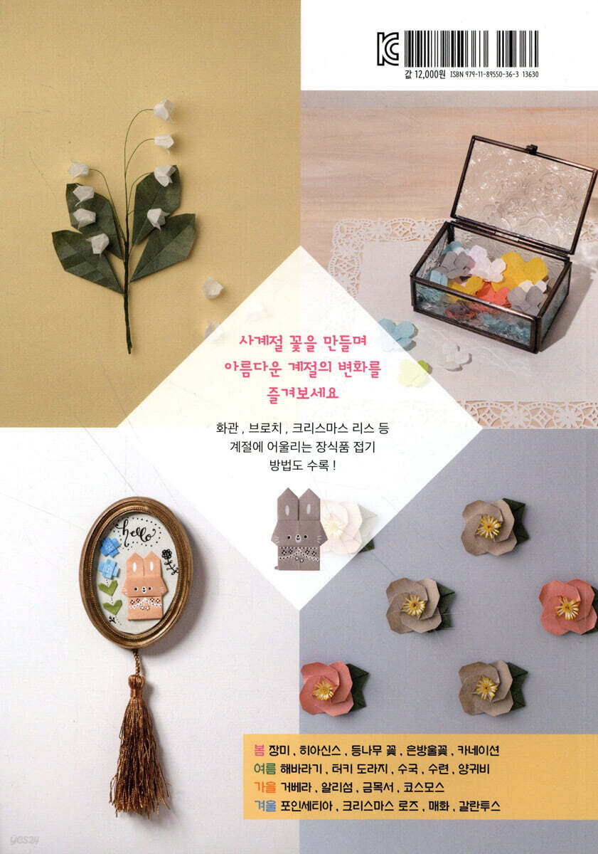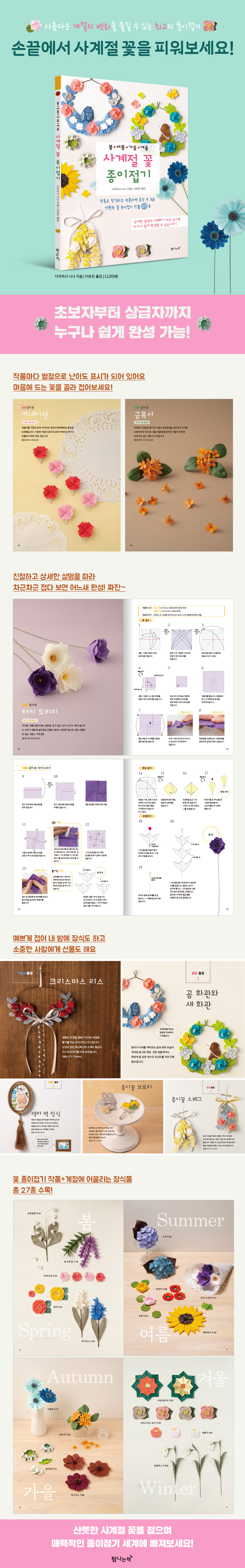 머리말 2 봄꽃 접기 6 여름꽃 접기 7 가을꽃 접기 8 겨울꽃 접기 9 이 책에서 사용하는 재료와 도구 10 이 책을 보는 방법 11 기본적인 접기 방법과 기호 12 1장 봄꽃 접기 장미 16 히아신스 20 봄꽃 활용 ① 곰 화관 24 ② 새 화관 30 ③ 종이꽃 스웨그 34 등나무 꽃 36 은방울꽃 40 카네이션 44 2장 여름꽃 접기 해바라기 48 터키 도라지 52 수국 56 여름꽃 활용 ① 플라워 박스 60 ② 액자 벽 장식 62 수련 64 양귀비 68 3장 가을꽃 접기 거베라 72 알리섬 76 가을꽃 활용 ① 갈란드 80 ② 종이꽃 브로치 82 금목서 84 코스모스 88 4장 겨울꽃 접기 포인세티아 92 크리스마스 로즈 94 겨울꽃 활용 ① 크리스마스 리스 98 ② 설 장식 102 매화 104 갈란투스 108 |