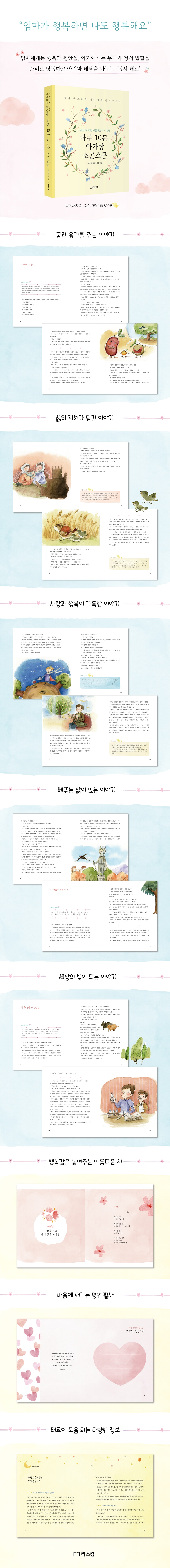 엄마 목소리로 낭독하고 아기와 태담을 나누는 ‘독서 태교’ ‘태내의 열 달 가르침이 생후 십 년 가르침보다 더 낫다’ 예로부터 우리나라 사람들은 태교를 중요시했습니다. 세계 최초의 태교 교과서라고 할 수 있는 조선 후기 〈태교신기〉에서는 ‘태내의 열 달 가르침이 생후 십 년 가르침보다 더 낫다’고 주장합니다. 20세기 들어 서양학자들도 태교의 중요성을 과학적으로 입증하고 있습니다. 산모의 자궁 속 환경이 태아의 뇌 발달에 결정적인 영향을 미친다는 미국 피츠버그대의 연구결과가 그중 하나입니다. 엄마 배 속의 열 달은 아기의 성장발달에 가장 중요한 시기입니다. 이 시기에 태아 발달에 도움이 되는 것들을 배 속의 아기에게 전달하는 것이 바로 태교입니다. 음악감상이나 미술감상, 독서, 뜨개질 등 태아의 두뇌와 감성 발달에 도움이 되는 것들은 많습니다. 그중에서도 독서 태교가 으뜸입니다. 배 속 아기는 엄마를 통해 세상과 만나고 엄마의 목소리에 반응합니다. 이 시기에 좋은 글을 엄마의 목소리로 들려주는 것은 그래서 중요합니다. 소리로 낭독하고 아기에게 태담을 건네보면 아기가 반응하는 것을 느낄 수 있습니다. 태담을 하면서 임산부는 자신이 정말 엄마가 되어간다는 느낌에 배 속의 아기에게 더욱 애정을 쏟게 됩니다. 아기는 엄마와 교감이 이루어지며 정서적으로 안정됩니다. 두뇌가 자극되어 지능 발달에 도움이 되고 감성도 발달합니다. 아기의 뇌세포 발달에 청각의 역할이 80% 이상 차지한다는 것이 이를 증명합니다. 내 아기가 똑똑하고, 재능 있고, 감성이 뛰어난 아기로 자라나길 원한다면, 지금부터 독서 태교를 시작해보세요. 소리 내서 낭독하고 아기에게 태담을 건네면 더 좋습니다. 〈하루 10분, 아가랑 소곤소곤〉은 독서교육전문가인 저자가 인문학자로서 30년 넘게 읽은 수천 권의 책 중에서 고르고 골라, 이 세상에서 가장 아름다운 이야기들을 모은 것입니다. 하루 10분, 엄마와 아기에게 풍요롭고 충만한 시간 아기와 소곤소곤 이야기를 나누는 시간, 단 10분! 글에 담긴 빛나는 가치는 그 시간을 아기에게 충분히 풍요롭고 충만한 교감의 시간으로 만들어줍니다. 잠들기 전 10분만 시간을 내면 됩니다. 이 책은 그저 후루룩 한 번 읽고 끝내는 책이 아닙니다. 태교 때뿐만이 아니라 가까이 두고 틈날 때마다 읽으면 마음이 정화되는 이야기들로 가득 차 있습니다. 아름답고 잔잔해서 마음의 울림을 주는 이야기, 재치 있고 삶의 지혜가 담겨있는 이야기, 가족사랑과 인간애를 느낄 수 있는 이야기, 읽고 나면 마음이 따뜻해지는 이야기들이 가득합니다. 이 책에는 독서교육 전문가인 저자가 고르고 고른 30편의 동화뿐만 아니라, 사랑스러운 아기를 노래한 시, 마음에 새겨두고 싶은 명언 쓰기, 우리나라 전통 자장가와 세계 유명 작곡가의 자장가, 태교를 위한 갖가지 정보가 알차게 담겨있습니다. 10분을 읽어도 다양한 내용을, 다양한 방식으로 풍부하게 활용할 수 있습니다. 시 한 편을 아주 천천히 곱씹어 읽어보아도 좋습니다. 이미 알고 있는 동화도 아가와 함께 나누면 새롭습니다. 아기에게 편지를 쓰는 마음으로 짧은 명언을 또박또박 써보며 마음에 새겨보세요. 하루 10분, 책 속 동심과 지혜를 양분으로 내 아기가 무럭무럭 자라나는 시간이 될 겁니다. |이 책의 특징 독서교육 전문가가 엄선한 30편의 동화 평생 책과 함께 살아온 독서교육 전문가인 저자가 자녀교육을 위한 학부모 인문학 강의를 진행하면서 경험한 수많은 책과 글에서 발췌한 30여 편의 아름답고 삶의 지혜가 담긴 동화를 수록했습니다. 내 아기가 배우길 바라는 소중한 가치 꿈과 용기, 지혜, 행복과 사랑, 나눔, 세상의 빛 등 각 장마다 하나의 주제를 담은 다양한 이야기가 등장합니다. 내 아기가 배우길 바라는 소중한 가치들입니다. 엄마가 어릴 때 읽었던 동화가 다시금 엄마에게 감동과 교훈을 전해주고, 이는 고스란히 아기의 정서 발달로 이어집니다. 시, 명언 필사, 자장가… 한 권으로 다양하게 각 장의 도입부에서 엄마는 시 한 편을 읽으며 자연스럽게 아기에게 말을 걸 준비를 합니다. 시는 아기의 정서 발달에 좋고, 엄마 역시 행복감이 충만해집니다. 각 장 끝에는 좋은 글을 마음에 새기듯 꼭꼭 눌러 쓸 수 있도록 명언 필사 페이지를 넣었습니다. 부록으로 수록된 자장가는 아기가 태어난 후에도 활용할 수 있습니다. 아기와의 대화를 돕는 태교 독서 멘토 도입부 ‘이야기를 들어보렴’과 마지막 ‘아가랑 소곤소곤’은 엄마가 직접 아기에게 속삭이는 태담입니다. 아직은 아기와 대화를 나누는 것이 쑥스러운 엄마 아빠라도 어느새 이야기와 관련된 자신의 경험과 생각을 아기와 함께 나누게 됩니다. 이러한 대화의 시간은 부모와 아기의 소중한 첫 추억을 만드는 시간이 될 수 있습니다. |
