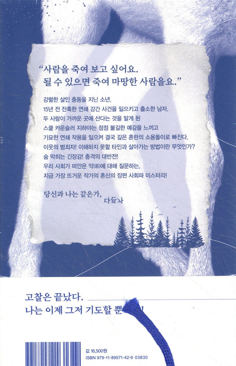 ---「첫 문장」중에서 고찰은 끝났다. 나는 이제 그저 기도할 뿐이다. --- p.8 “혹시 선생님께 거슬리는 사람 없나요?” “뭐?” “제가 그 사람을 죽일 수 있게 허락해 주시지 않겠어요?” --- p.44 ―염소는 제가 그렇게 했어요. ―저는, 사람을 죽여 보고 싶어요. ―혹시 선생님께 거슬리는 사람 없나요? 제가 그 사람을 죽일 수 있게 허락해 주시지 않겠어요? --- p.50 “선생님이 하신 말씀이 맞다고 생각해요. 하지만 전 용서받고 싶지 않은 사람을 죽이고 싶은 거예요.” 반사적으로 목소리가 커졌다. “그런 사람은 세상에 존재하지 않아.” “아뇨. 존재해요. 이를테면 저 같은 사람이요. 전 사람을 죽이려고 하니까요.” 정당방위. “넌 아직 사람을 죽이지 않았잖아.” --- p.130 마음에 걸리는 것은 그 아이가 발산하는 짙은 작위의 기운이다. 꿈 이야기, 죽여야 할 사람을 알려 달라는 부탁, 최면에 의한 충동 억제 실험, 지하야를 향한 도발. 거짓말을 하고 있다는 의심은 사라졌다. 근거는 그저 ‘촉’이라고 할 수밖에 없지만 지하야에게는 확신이 있었다. 그 아이는 자신이 살인을 저지르는 상황을 정말로 상상했던 것이 분명하다. --- p.186 지하야가 남몰래 품고 있었던 비밀스러운 바람. 이리이치를 다시 한번 만나 보고 싶다. 그와 오랫동안 천천히 대화를 나눠 보고 싶다. 그의 표정을 보고, 목소리를 듣고, 말을 주고받고, 그리고 해답을 얻고 싶다. 당신과 나는 같은가, 다른가. --- p.207 모든 게 엄연한 사실이었다. 아키나리의 살의, 살인 충동. 특정 대상을 죽이려는 것이 아니고 죽여서 뭔가를 얻으려는 것도 아닌, 그저 순수하게 사람을 죽이고 싶은 충동. --- p.263 “과오를 저지른 인간과 누가 봐도 확실한 악마. 사람들은 과연 어떤 이리이치를 원할까.” “악마를 어떻게 정의 내리죠?” “정의 내릴 수 없는 단어야말로 힘을 지녔지. 사람들이 원하는 형태로 자유자재로 바꿀 수 있으니.” --- p.313 “살고 싶다는 충동, 죽고 싶다는 충동, 죽이고 싶다는 충동. 세상에는 모순이 맞물린 수많은 충동이 있고 우리는 그 모든 걸 갖고 있어.” 죽이고 싶지 않다는 충동도. 살아 주기를 바라는 충동도. --- p.478 이곳에서는 서로 맞물리지 못하는 타인들이 살아가고 있다. 고작 몇 미터 거리를 앞에 두고 생활하고 있다. 다투고, 사랑을 나누기도 한다. 그 모든 이들을 꼭 ‘특별한 타인’이라고 생각하지 않아도 그렇게 살아갈 수밖에 없으니 의심을 포기하지 못하는 것처럼 믿음도 포기하지 못하는 것이다. --- p.483 |