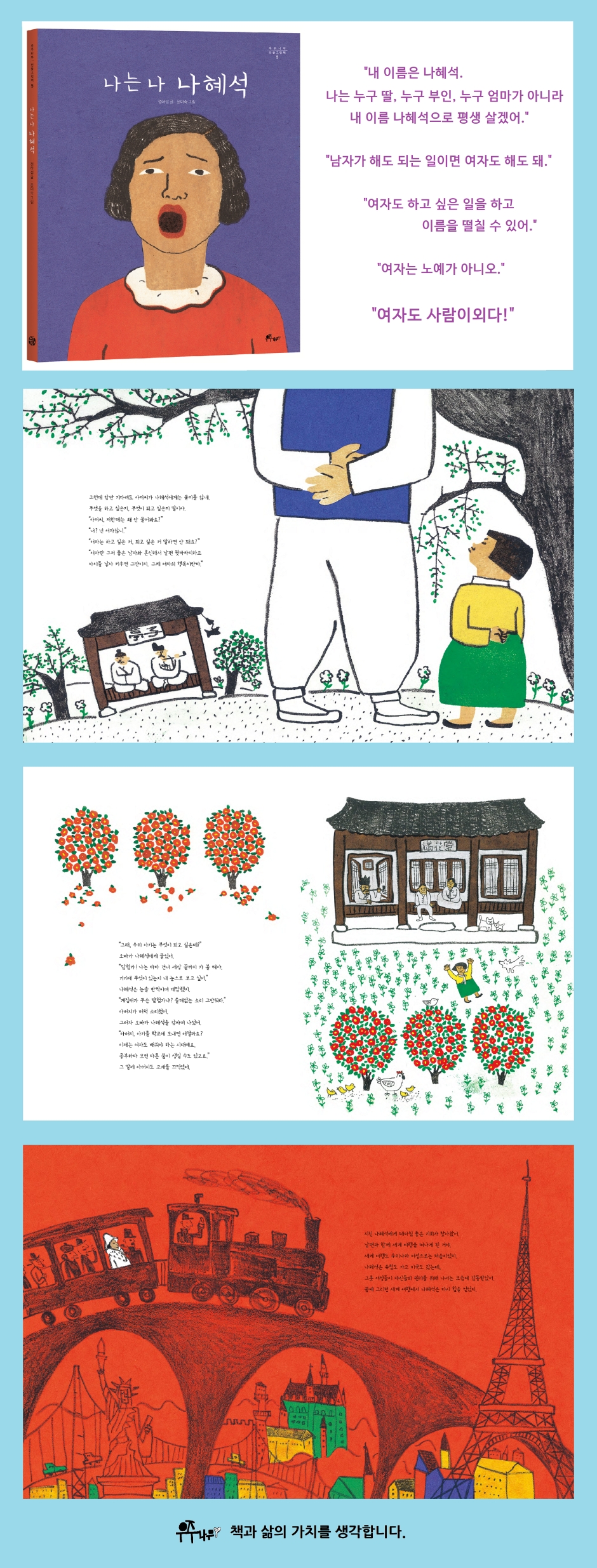 100여 년 전, 남자 여자 차별 없는 세상을 꿈꾼 선구자. 누구의 무엇이 아니라 오로지 자기 자신으로 살아간 여성. 나혜석은 나혜석이다. 나혜석은 1896년, 조선이 망국으로 기울어지던 구한말에 태어났다. 나혜석의 마지막 해는 1948년, 남북이 각기 정부를 세워 분단이 확정된 해다. 이 기간은 우리 겨레가 암흑 속에서 실낱같은 빛을 찾던 시절이었고, 옛것과 새것이 뒤섞여 치열한 몸싸움을 벌이던 시대였으며, 개인이 주체로 서는 근대라는 이름의 체제가 터를 잡는 시간이었다. 이 역사의 한복판에서 나혜석은 자신의 길을 찾아 나갔다. 나혜석은 그 당시 여성으로는 드물게 유학까지 하며 신학문을 배운 이른바 신여성이었다. 봇물 터진 듯 밀려오는 새로운 문물과 사상을 받아들인 나혜석은 그림을 그리는 화가로, 소설을 쓰는 작가로 이름을 알렸다. 잡지에 만평을 그리고 다른 작가의 책에 삽화를 그리는가 하면, 암울한 여성의 처지와 불평등한 삶의 조건을 고발하고 낡은 관습에 맞서는 주장을 신문에 싣기도 했다. 독립운동에도 관여했다. 이렇게 왕성한 활동을 하며 나혜석은 ‘우리나라 최초’라는 타이틀을 여럿 얻었다. 우리나라 최초의 여성 서양화가이고, 최초의 여성주의 작가이며, 우리나라 여성으로 처음 세계 일주를 한 이도 나혜석이었다. 무엇보다 여성의 삶을 중심에 두고 치열하게 문제를 제기한 최초의 여성주의자였다. 그러나 단지 최초라는 것에 과도한 의미를 부여할 필요는 없다. 중요한 것은 그 삶이 전하는 메시지인데, 나혜석의 일생을 관통한 것은 여성이 삶의 주인이 되고 주체로 서야 한다는 생각이었다. 나혜석은 작가이며 화가이며 여성으로서 자기 생각과 느낌을 진솔하게 말하고 쓰고 그렸다. ‘나는 누구 딸, 누구 부인, 누구 엄마가 아니라 내 이름 나혜석으로 평생 살겠다.’라고 선언하고 그대로 실천한 나혜석의 삶은 많은 질문을 던지게 한다. 그것이 우리가 지금 나혜석을 다시 돌아보는 이유다. |