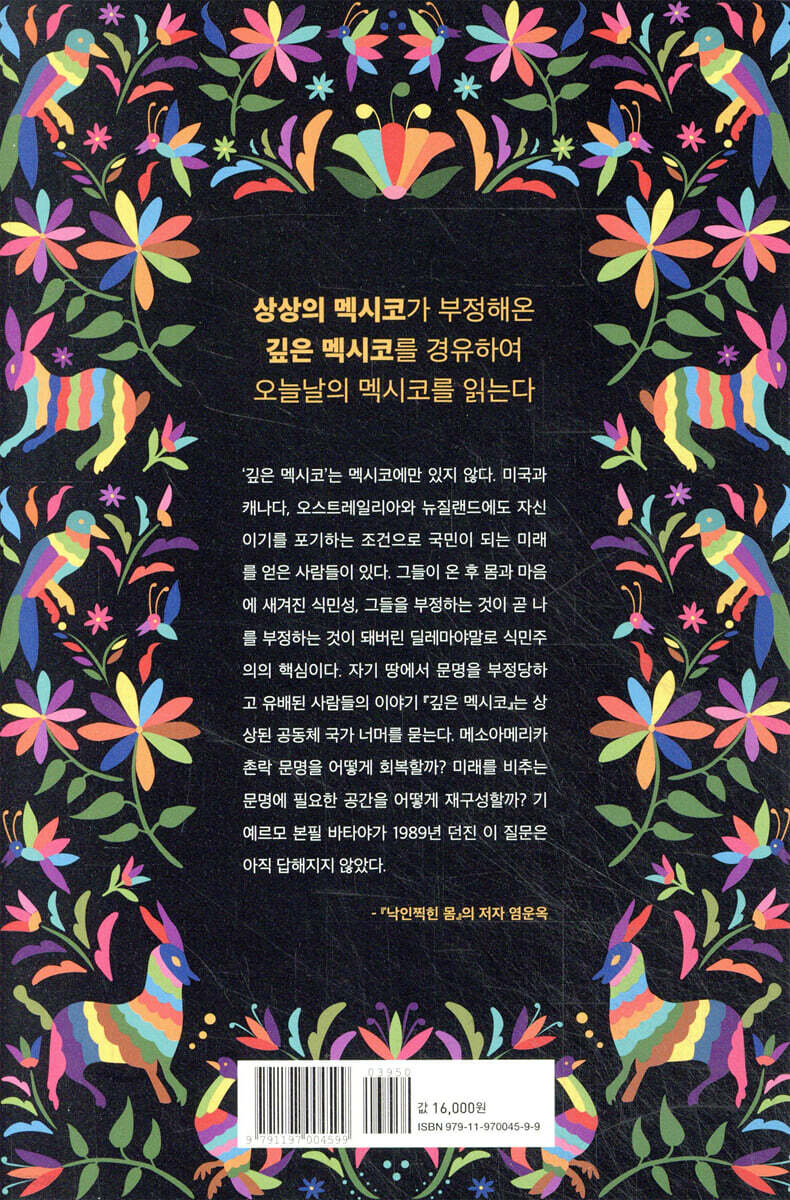 치첸이차의 경이로운 건축에 매료되었다면, 토르티야의 맛을 음미해 보았다면, 백년초가 매달린 노팔과 용설란이 서있는 황량한 풍경이 궁금했다면, 알록달록 수놓인 전통 복색에 눈길이 머문 적이 있다면, 당신은 이미 메소아메리카 문명을 아는 것이다. 메소아메리카 문명은 기원전 1500년경 오늘날 멕시코 땅에 등장했다. 오늘날 멕시코 여행의 필수 코스가 된 치첸이차, 테오티우아칸, 팔렌케 등의 유적지는 수천 년의 역사를 지닌 메소아메리카 문명이 남긴 흔적이다. 메소아메리카 문명의 테두리 안에서 다양한 문화들이 발전해 나갔다. 각각의 문화들은 멕시코시티의 국립인류학박물관 전시실을 하나씩 차지하고 있다. 그러나 메소아메리카 문명은 박제되어 우리 앞에 전시된 과거의 유산이 아니다. 바로 지금 소칼로에서 춤추는 젊은이들도, 멕시코시티 남부 운하의 치남파에서 기르는 채소와 꽃도, 토르티야부터 엘로테까지 변신을 거듭하는 주요 식재료인 옥수수도, 오아하카주와 치아파스주 소도시에서 들려오는 원주민어도, 메소아메리카 문명을 이어받고 그 문명을 다음 세대에게 전수하고 있다. 많은 사회가 서구 유럽을 본보기로 삼아 자신을 왜곡하고 변형시켰다. 멕시코도 예외는 아니었다. 멕시코에 유럽인이 도착한 순간부터 서구 문명을 이곳에서 실현하려는 지속적인 시도가 있었다. 19세기 초 독립 이후에도 마찬가지였다. 정치경제적 엘리트의 관념 속 ‘상상의 멕시코’는, 바로 눈앞에 펼쳐져 있는 손에 만져지고, 코로 냄새를 맡을 수 있고, 귀로 들을 수 있는 ‘깊은 멕시코’를 부정했다. 지금의 나를 부정하고, 타인에게 내 모습을 찾아 헤맨 것이 멕시코의 역사이다. 인류학자인 기예르모 본필 바타야는 부정당하고 가려진 메소아메리카 문명이 바로 여기에 있음을 알려준다. 500년 동안 부정당했지만, 자신이기를 멈추지 않은 메소아메리카 문명의 이야기를 들려준다. 이 책은 한국 사회에서 이미 익숙해진 탈식민화 담론의 멕시코 버전이 아니다. 이 책은 정교한 이론을 전개하거나, 대단한 지성들과 어깨를 견주려는 분석을 제시하지도 않는다. 이 책은, 저자가 멕시코의 원주민으로부터 ”배운 것을 더듬더듬 번역“한 것이다. 그래서 이 책은 탈식민적 행위의 기록이다. 우리는 이 책에서 메소아메리카 문명의 과거와 현재를 읽어 낼 수 있을 뿐만 아니라 한 사회의 현재와 미래를 위해 부단히 행동하는 인류학자의 모습까지 발견할 수 있다. |