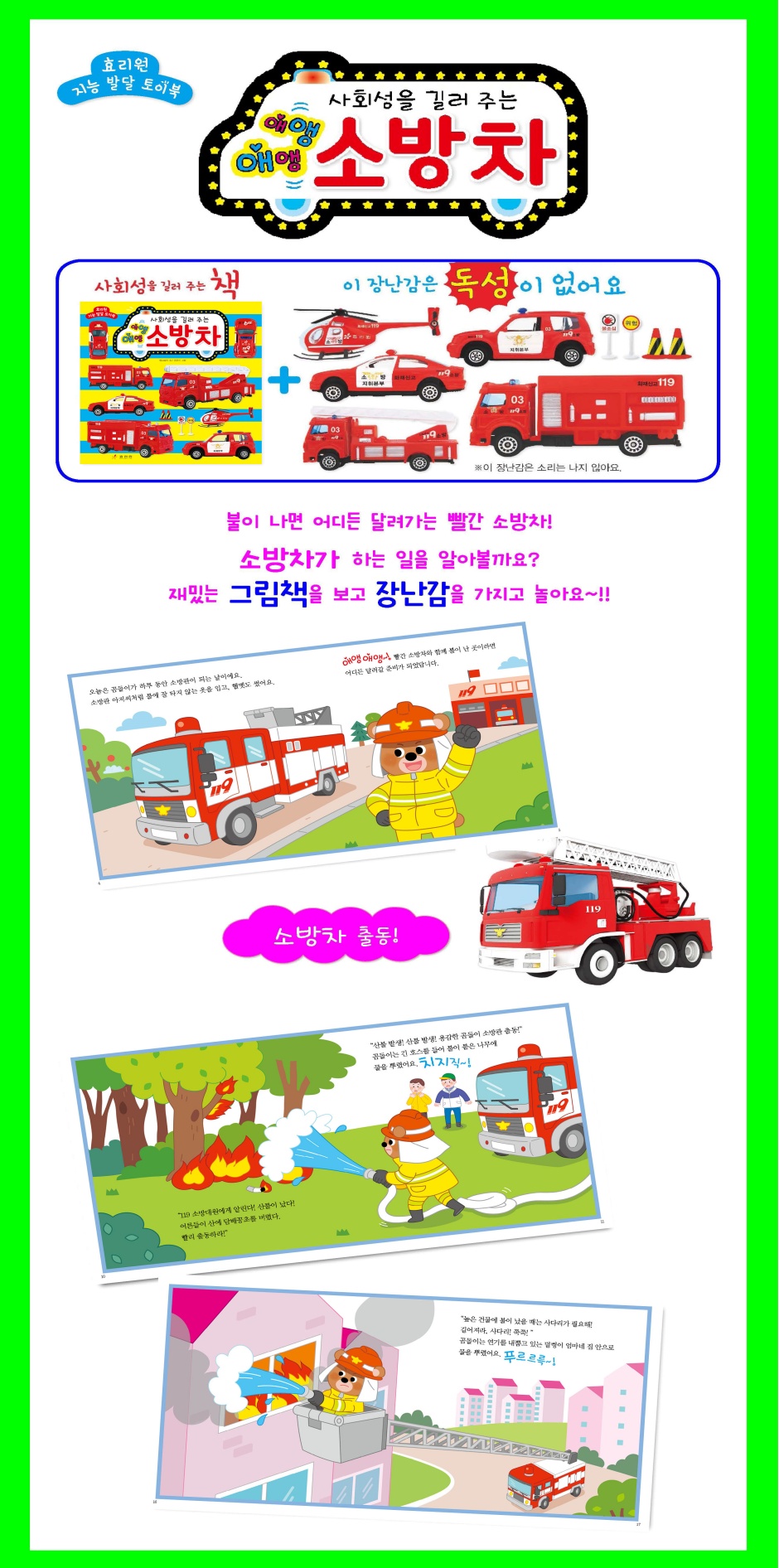 아이들이라면 누구나 좋아하는 장난감! 하지만 엄마 아빠는 우리 아이에게 두되 발달에 도움이 되는 책도 선물하고 싶어 하지요. 『효리원 지능 발달 토이북 시리즈』는 아이와 엄마 아빠의 마음을 모두 담은 시리즈입니다. 자동차, 소방차, 구급차, 동물, 곤충……. 등 아이들이 좋아하는 주제를 아기자기한 그림, 또는 풍부한 사진을 곁들여 이야기책으로 꾸미고, 관련 장난감을 넣어 하나의 세트로 구성하였습니다. 재미있는 이야기를 읽으며 지식을 쌓고, 장난감을 가지고 놀면서 호기심과 상상력을 키울 수 있는『효리원 지능 발달 토이북 시리즈』! 손과 눈, 머리가 즐거워지는 시리즈입니다! 『효리원 지능 발달 토이북 시리즈』 특징 ① 재미있는 이야기책과 정교하고 튼튼한 장난감을 함께 만날 수 있습니다. ② 아이들의 지적 호기심을 자극하는 내용을 이야기책으로 구성하였습니다. ③ 이야기책은 아이들의 눈높이에 맞추어 간결하고 이해하기 쉽게 풀어 쓰고, 아기자기한 그림을 함께 실어 재미있게 읽을 수 있도록 하였습니다. ④ 장난감은 KC마크를 획득하여 아이들이 가지고 놀기에 안전한 무독성 제품입니다. |