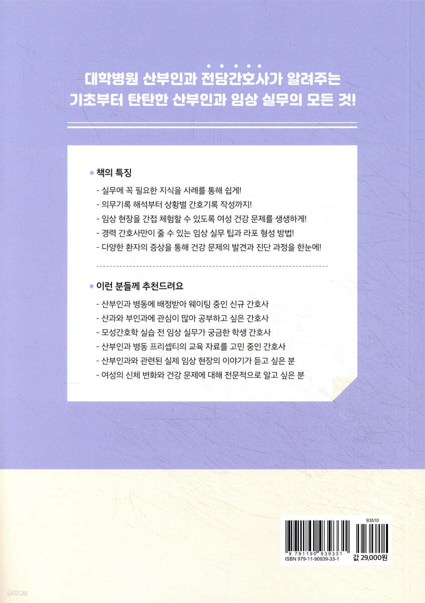 1. 입원 간호 기록지(간호 초기평가부터 기록까지) 2. 입원 초진 기록지(의사 Admission note 해석부터 환자파악까지) 3. 다빈도 산과 진단검사(USG, NST 등 진단검사 실무 Tip) Part 2 케이스로 보는 다빈도 산과 건강 문제 1. 임신 관련 건강 문제 1) 선분홍색 출혈이 있어요! - 유산(Abortion) - 자궁 외 임신(Ectopic pregnancy) - 자궁경부 무력증(IIOC) - 전치태반(Placenta previa) - 태반 조기 박리(Placenta abruption) 2) 최근 머리가 아프고 몸이 부어요 - 임신성 고혈압(PIH) / 전자간증(Preeclampsia) / 자간증(Eclampsia) 3) 갈증이 나고 화장실을 자주 가요! - 임신성 당뇨(GDM) 2. 분만 관련 건강 문제 1) 소변 나오듯이 흘러내려요 - 조기 양막 파수(PROM) / 만삭 전 조기 양막 파수(PPROM) 2) 배가 규칙적으로 뭉쳐요 - 조기진통 (Preterm labor) 3) 분만하러 왔어요! - 자연분만(NVD, N/D, NSVD) - 제왕절개 분만(C-sec) 3. 산후 관련 건강 문제 1) 출혈로 이불까지 다 젖었어요! - 산후 출혈(PPH, PPB) 2) 자꾸 눈물이 나고 움직이기 싫어요 - 산후 우울감(Postpartum blue) / 산후 우울증(PPD) 산후 정신병(Postpartum psychosis) Part 3 부인과 기초 실무 다지기 1. 입원 간호 기록지(간호 초기평가부터 기록까지) 2. 입원 초진 기록지(의사 Admission note 해석부터 환자파악까지) 3. 다빈도 부인과 진단검사 (Pelvic examination, pap smear, colposcopy 등 진단검사 실무 Tip) Part 4 케이스로 보는 주요 질환 1. 자궁 관련 질환 1) 양성 종양 - 자궁에 혹이 있대요 - 가장 흔한 케이스 자궁근종(Uterine myoma) - 재발이 잦은 자궁 내막증(Endometriosis) - 월경 양이 많은 자궁 선근증(Adenomyosis) 2) 악성 종양 - 자궁에 암이 있대요 - 정상도 암도 아닌 자궁경부 상피 내 종양(CIN) - 성교 후 잦은 출혈? 자궁경부암(Cervical cancer) - 폐경 이후의 출혈? 자궁내막암(Endometrial cancer 2. 난소 관련 질환 1) 양성 종양 - 난소에 혹이 있대요 - 젊은 여성에게 흔한 난소 낭종(Ovarian cyst) 2) 악성 종양 - 난소에 암이 있대요 - 조용한 살인범 상피성 난소암(Ovarian cancer) 3. 부인과적 질환 치료 1) 수술 - 수술을 해야 한대요 - 흉터가 거의 없는 복강경 수술(Laparoscopic op) - 제거 범위나 종양이 크다면 개복술(Laparotomy) 2) 항암제를 맞아야 한대요(Chemotherapy) 3) 방사선 치료는 어떻게 하나요?(Radiation therapy) 4. 기타 질환 1) 열이 나고 배가 아파요 - 성교육이 중요한 골반 염증성 질환(PID) 2) 밑이 빠지는 느낌이 들어요 - 시골 어르신들에게 흔한 자궁 탈출증(Uterine prolapse) 부록 보충자료 1. 불안한 산모 이해하기 (난임 시술 과거력의 경우) 2. 산부인과 환자들이 많이 하는 질문? 3. 산과 관련 의학용어 4. 부인과 관련 의학용어 |