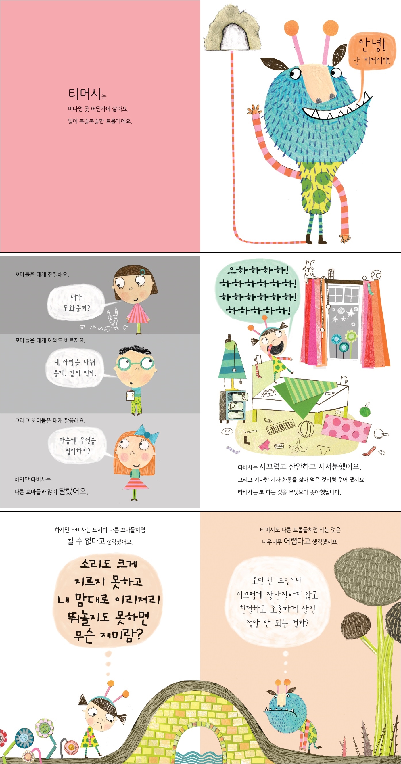 “타비사는 다른 꼬마들처럼 될 수 없다고 생각했어요. 티머시도 다른 트롤들처럼 되는 것은 너무너무 어렵다고 생각했지요.” 《만일 내가 트롤이 된다면》은 트롤 티머시와 꼬마 소녀 타비사를 통해 있는 모습 그대로의 자신이 얼마나 소중하고 특별한지 알려 주는 그림책이에요. 대부분의 트롤들은 지저분하고 시끄럽지만 이 책에 나오는 주인공 티머시는 깨끗하고 친절한 트롤이에요. 또 다른 주인공 꼬마 소녀 타비사는 여느 아이들과 달리 코 파는 것을 좋아하고 소리 지르며 뛰노는 걸 좋아하지요. 다른 트롤들은 티머시를 형편없는 트롤이라며 놀리고, 타비사의 엄마 아빠는 타비사가 다른 아이들처럼 얌전히 행동하기를 바랐답니다. 그러나 티머시와 타비사는 다른 트롤들이나 다른 아이들처럼 행동하는 것이 너무 어렵다고 생각했어요. 그리고 어느 날, 둘은 서로 사는 곳과 역할을 바꾸었지요. 티머시와 타비사는 있는 모습 그대로 행동해도 지적받지 않아서 모든 것이 좋았어요. 하지만 곧 친구들과 가족들은 원래의 티머시와 타비사가 그리워졌어요. 티머시와 타비사도 그곳에서는 자신이 특별하게 느껴지지 않았지요. 아이는 유아기 때부터 스스로에 대해 판단해요. 그래서 이때부터 올바른 자아 개념을 세우고 긍정적인 자아 존중감을 형성하는 것이 중요하지요. 자신을 잘 알고 소중히 여기며 자아 존중감이 높을수록 사회성이 높다는 연구 결과도 있습니다. 이 책은 남들과 달라서 힘들어하던 두 주인공이 ‘특별한 나’를 인정하고 원래의 나로 되돌아가기로 한 이야기를 통해, 있는 그대로의 내 모습에 대해 생각하게 합니다. 더 나아가 생김새나 성격, 사고방식이 달라도 누구나 소중한 존재임을 자연스레 깨닫게 되지요. 아이는 사회생활을 시작하면서 자신의 개성이나 특별함을 잃어버리기 쉬어요. 일반적인 잣대와 판단으로 인해 남들과 같은 모습을 강요받기도 합니다. 예절이나 규율을 지키는 건 아이의 사회생활을 위해 꼭 필요한 것이지만, 남들과 조금 다른 특별함을 무조건 사회에 일반화하는 것은 좋지 않습니다. 그로 인해 아이가 자신감을 잃어버려서도 안 되지요. 우리 아이가 이 그림책을 읽으며 티머시와 타비사처럼 스스로를 긍정적으로 판단하고 자신이 특별하다는 것을 느끼게 해 주세요. 그럼 자존감과 자신감을 갖고 자신과 다른 사람의 개성도 존중할 수 있는 아이로 성장할 것입니다. 내가 괴물이 되는 상상으로 더욱 재미있는 이야기! ‘트롤’은 북유럽 신화에 나오는 상상 속 괴물이에요. 신화 속에서 트롤은 꼬마 아이와 트롤 아이를 바꾸는 장난을 좋아한다고 전해지지요. 로알드 달 유머 상 후보에 오른 바 있는 이 그림책의 작가 리 호지킨슨은 이런 신화 속 트롤 이미지를 바탕으로 재치 넘치는 이야기를 만들었습니다. 아이들은 티머시와 타비사가 서로의 자리를 바꾸었다가 다시 되돌아오는 모습을 보며 마치 만화 영화를 보듯 흥미진진하게 책 속으로 빠져들 것입니다. 또한 트롤이 되어 마음껏 소리를 지르고 뛰노는 타비사를 보며 대리 만족을 하기도 하지요. 책을 읽은 뒤 아이와 함께 만일 티머시와 타비사처럼 서로 역할을 바꾸어 살아야 한다면 무엇을 하고 싶은지 이야기 나눠 보세요. 또 나는 무엇으로 바뀌고 싶은지도 이야기해 보세요. 책을 읽은 뒤 상상 가득한 얘기를 나누다 보면 창의력이 쑥쑥 자랄 거예요. 누리과정 사회관계 영역과 연계된 우리 아이에게 꼭 필요한 그림책! 《만일 내가 트롤이 된다면》은 누리과정 5개 영역 가운데 「사회관계 영역」과 연계된 그림책입니다. 티머시와 타비사처럼 나에게만 있는 특별함이 무엇인지 이야기해 보세요. 그리고 아이 스스로가 자신이 소중한 이유에 대해 생각해 볼 수 있게 해 주세요. 자신에 대한 관심과 이해를 바탕으로 긍정적인 자아 존중감을 형성함은 물론, 나와 다른 사람과의 신체적, 사회적 차이를 알고 다른 이들을 존중하는 마음을 가지게 됩니다. 이 책은 ‘사파리펜’으로 책 읽는 재미를 한층 더 느낄 수 있습니다. 사파리펜으로 티머시와 타비사, 트롤과 가족 들을 눌러 보세요. 생생한 효과음과 함께 흥미로운 또 다른 이야기가 펼쳐져 책 읽는 재미를 한층 더 느낄 수 있어요. 또한 엄마 아빠가 읽어 주지 않아도 처음부터 끝까지 친절하게 읽어 주지요. 문장별로도 들을 수 있어 글자를 배우는 시기에 많은 도움을 받을 수 있어요. |