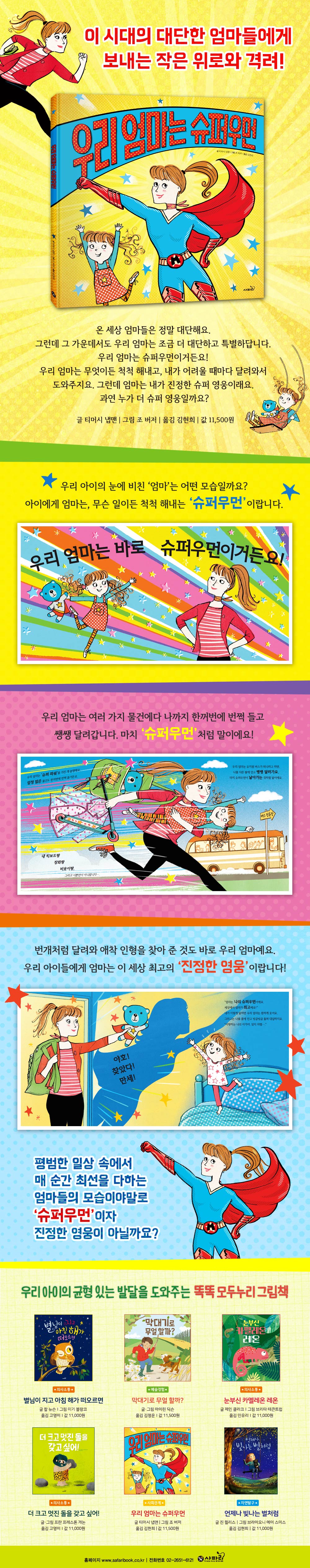 온 세상 엄마들은 정말 대단해요. 그러나 그 가운데서도 우리 엄마는 조금 더 대단하고 특별하답니다. 우리 엄마는 슈퍼우먼이거든요! 우리 엄마는 무엇이든 척척 해내고, 내가 어려울 때마다 달려와서 도와주지요. 그런데 엄마는 내가 진정한 슈퍼 영웅이래요 과연 누가 더 슈퍼 영웅일까요?