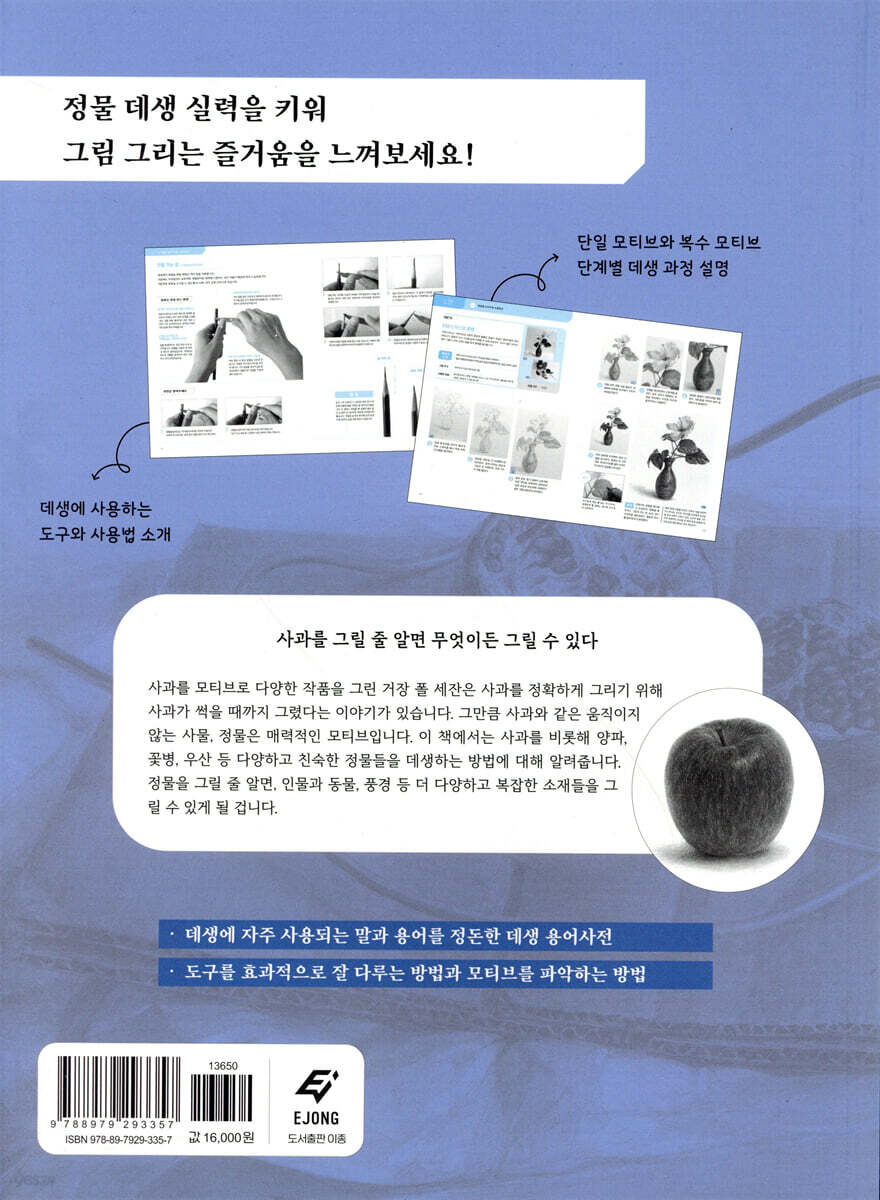 -데생에 사용하는 도구와 사용법 소개 -도구를 효과적으로 잘 다루는 방법과 모티브를 파악하는 방법 -단일 모티브와 복수 모티브의 그리는 단계별 과정 설명 |