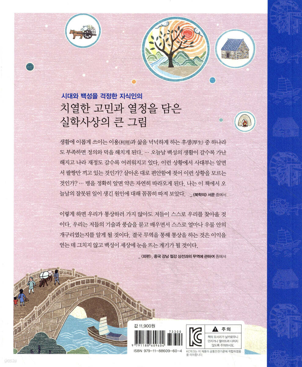 개혁 사상가 박제가 조선 후기의 정치가이자 외교관, 북학파의 대표적 사상가로 알려진 박제가는 어린 시절부터 늘 입에 붓을 물고 다닐 정도로 책 읽기를 좋아했다. 하지만 서자라는 신분의 한계로 일찍부터 벼슬에 대한 기대는 접어야 했다. 벼슬은 힘들어도 마음껏 공부할 수 있도록 전폭적인 지원을 아끼지 않던 아버지마저 일찍 죽자 박제가는 가난이 무엇인지 뼈저리게 실감하며 유년 시절을 보냈다. 서자로서의 신분적 한계와 일찍부터 그가 겪은 가난은 훗날 박제가가 현실을 비판적으로 바라보면서 백성의 고된 삶을 실질적으로 개선하기 위한 개혁 정책을 마련하는 데 큰 영향을 끼쳤다. 청년기의 박제가는 스승인 박지원과 이덕무, 유득공, 이서구, 홍대용 등 실학파 동료와 어울리며 자신의 생각을 더욱 확장시켜 나간다. 그리고 1778년(정조 2년) 청나라로 파견되는 사신단의 수행원으로 꿈에 그리던 북경 땅을 밟는다. 북경에 가서 직접 본 청나라의 발전상은 박제가를 충격에 빠뜨렸다. 청나라를 오랑캐라며 깔보던 조선 사회의 편견과는 달리 당시 청나라는 동아시아 최고의 선진국으로 경제와 문화, 기술 등 모든 분야에서 조선보다 월등했다. 북경의 여러 중국 지식인들과 학문을 교류하면서 그곳의 풍속과 문화, 제도를 자세히 살피고 돌아온 박제가는 곧바로 《북학의》를 집필하게 된다. 십 대를 위한 고전 파란클래식의 스물일곱 번째 책 《북학의》는 선진국의 앞선 문물을 받아들여 백성을 잘살게 하고 부강한 나라를 만들고자 한 박제가의 개혁 사상이 담긴 책이다. 윤리와 도덕만 앞세운 성리학 일변도의 학문 풍토와 공리공론만 일삼는 폐쇄적인 조선 사회에서 박제가는 새로운 사상과 문물을 적극적으로 받아들이고 현실을 냉철하게 분석해, 사회 문제를 해결할 구체적이고 실질적인 대안을 마련하고자 한 개혁 사상가였다. 사회의 편견과 고정관념에 휘둘리지 않고 항상 열린 마음으로 자신이 처한 현실을 개선하려 한 박제가의 삶을 대하는 태도는 오늘날까지도 역사를 뛰어넘는 보편적 가치를 지닌다. 당대 실학자들의 고민과 직접 보고 느낀 것을 녹여 낸 조선 최고의 개혁 사상서 박제가는 총 네 차례 북경을 방문하는 동안 청나라의 제도와 문물을 허투루 보지 않았다. 그들의 풍속 가운데 조선 사회에 적용하여 편리하게 쓸 수 있는 제도나 문물을 쉼 없이 관찰하고 글로 기록하면서, 그것이 실제로 조선 사회에 적용되었을 때 어떤 이점이 있고, 따르지 않으면 무슨 손해가 있는지도 충실히 덧붙였다. 그렇게 탄생한 책이 바로 《북학의》다. 《북학의》는 박제가 자신의 학문적 능력과 열정의 산물이기도 하지만 홍대용, 박지원, 이덕무 등 같은 시대를 살아간 지식인들과 수없이 토론하고 고민한 시간들을 함께 녹여 낸 실학사상의 총체라 볼 수 있다. 제목 그대로를 놓고 보자면, ‘북학北學’은 북쪽, 즉 청나라의 앞선 문물을 배우자는 뜻으로 받아들일 수 있다. 하지만 박제가는 중국을 앞세워 서양, 일본 등 ‘선진국의 앞선 문물을 배우자’고 주장한다. 당시 청나라는 아시아 최대 강대국으로, 경제와 문화, 국방 등 모든 분야를 막론하고 조선보다 월등히 앞서 있었고, 그 안에는 세계의 앞선 기술과 문물이 다 모여 있었다. 하지만 조선의 지배층은 청나라를 오랑캐의 나라라 무시하며 청나라의 발전한 모습에도, 조선의 낙후한 현실에도 모두 눈을 감은 채 변화를 거부했다. 북경을 방문해 청나라의 실상을 직접 눈으로 보고 접한 박제가는 청나라가 그렇게 앞설 수 있던 이유를 파헤쳐, 그들이 받아들인 앞선 제도와 문물을 배워 국력을 키우고 궁극적으로는 백성을 빈곤에서 벗어나게 할 수 있는 실질적인 정책들을 제시한 것이다. 세상에 실제로 도움을 줄 수 있는 길 백성이 잘사는 부강한 나라를 위한 계획 박제가는 먼저 세계를 향해 문호를 열어 ‘나라와 나라 사이의 물품을 사고파는 통상 교역과 상업’의 중요성을 주장한다. 조선은 전통적으로 농업을 근간으로 하는 나라로 상업 활동을 천시했다. 박제가는 상업의 중요성을 역설하면서 상업으로 물품 거래가 활발해지면 농업 생산도 더욱 활발해진다고 보았다. 우물의 물을 자꾸 퍼 올려야 물이 다시 채워지듯 소비가 늘어나면 물품과 돈이 더 활발하게 유통된다는 것이다. 나라의 근간인 농업 생산을 늘리기 위해서는 청의 기술을 배워 ‘우수한 농기구를 만들고 농업 기술을 개발’해야 한다고 주장했다. 특히 수레를 사용해 유통을 활성화하는 등 ‘산업 기반 확보’에도 신경을 썼다. 우수한 도구와 기술로 농업 생산량을 늘리고, 교통수단인 수레 등을 이용해 유통 경제를 활성화할 방안을 제시한 것이다. 또한 정조에게 올리는 글에서 박제가는 조선의 가장 큰 문제는 바로 ‘가난’이라고 하면서 가난을 극복하기 위한 첫 번째 방법으로 다른 나라와의 통상을 제안한다. 일본과 유구, 안남, 서양의 여러 나라들이 중국과 활발히 교역하는 사례를 들며 조선에서 흔히 나는 물건을 다른 나라에 비싸게 팔 수 있다면 백성이 잘살게 되는 것이 당연한 이치라고 주장한다. 교역을 통해 앞선 기술과 문물을 들여와 조선의 