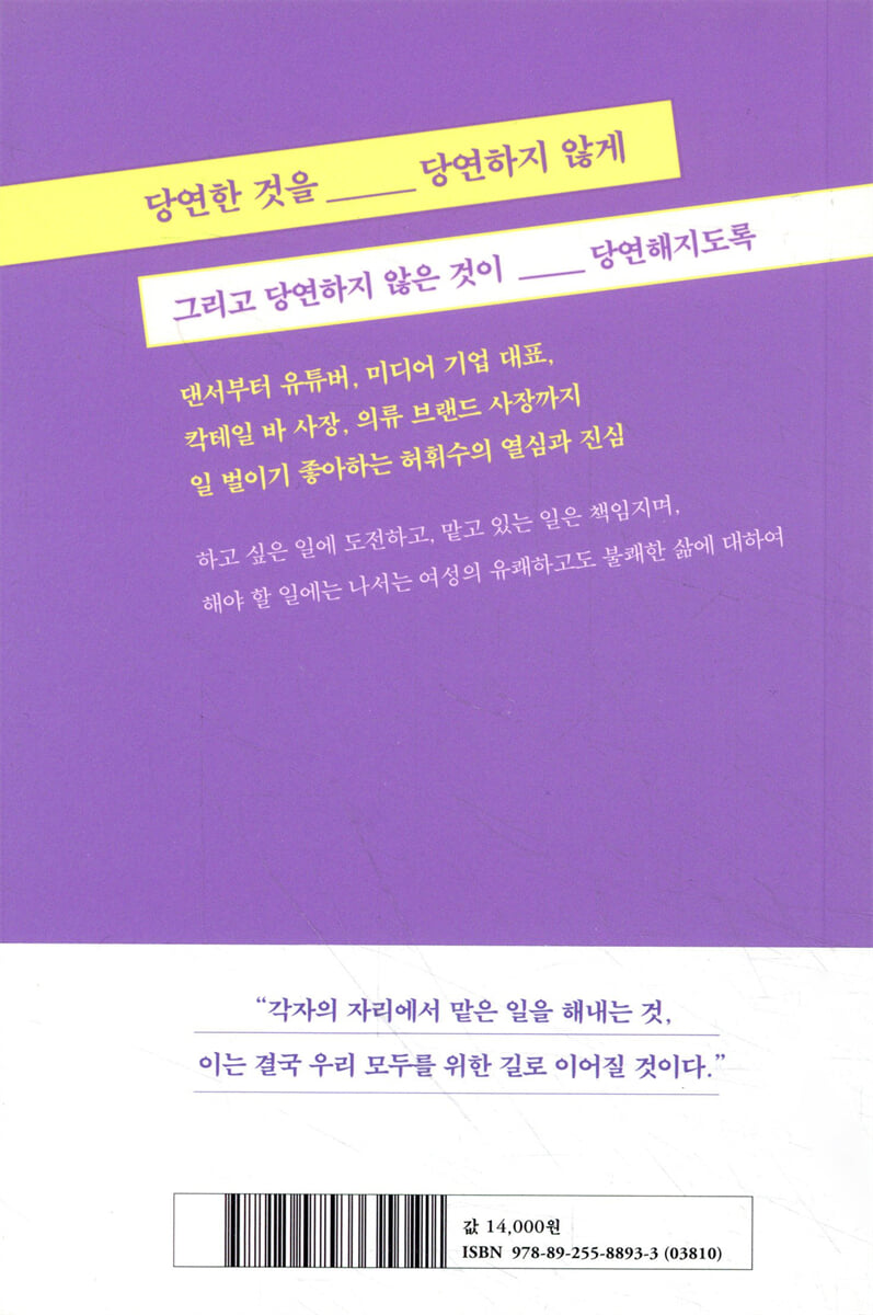 한 사람의 인생을 들여다보는 건 썩 유쾌하지 않은 일이다. 그렇지 않아도 각박한 삶에 비교 대상이 하나 더 추가되는 기분이라 좋아하지 않는다. 그러나 장담하건대 허휘수 인생 이야기는 들어볼 만하다. 읽다 보면 ‘누가 내 얘기 하냐’ 하다가 ‘이 사람 진짜 범상치 않다’ 하게 된다. 마지막 책장을 덮을 땐 비교 대상이 아닌 오늘을 함께 살아갈 동료를 얻은 기분일 거다. ‘이게 왜 당연한 거야?’라는 의문을 가진 모든 여성에게 추천한다. 물론 ‘어떻게 허휘수는 이름도 허휘수야!’라는 감상을 막을 순 없다. - 송채림 (유튜브 [소그노] 운영자)