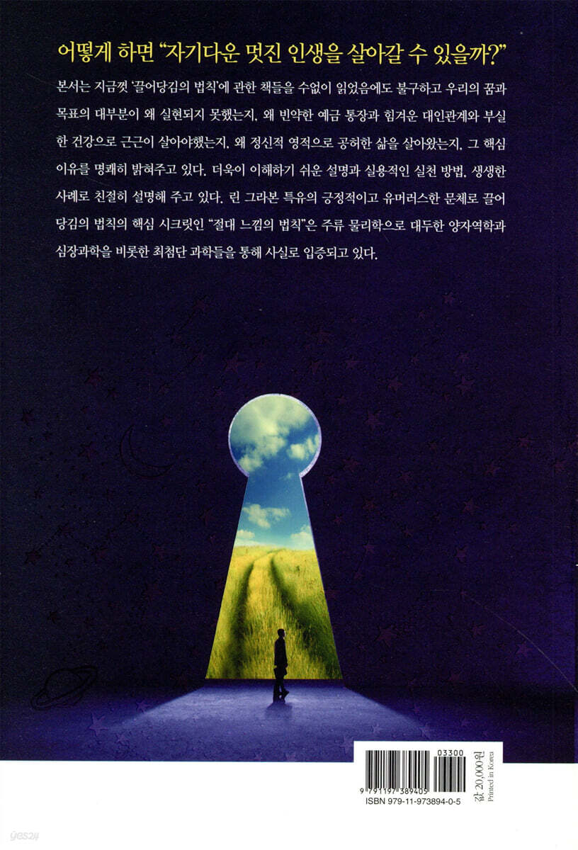 인기 북튜버 책추남TV 강력 추천 당신의 꿈을 이루어주는 절대 느낌의 법칙! 어떻게 하면 “자기다운 멋진 인생을 살아갈 수 있을까?” 본서는 지금껏 ‘끌어당김의 법칙’에 관한 책들을 수없이 읽었음에도 불구하고 우리의 꿈과 목표의 대부분이 왜 실현되지 못했는지, 왜 빈약한 예금 통장과 힘겨운 대인관계와 부실한 건강으로 근근이 살아야했는지, 왜 정신적 영적으로 공허한 삶을 살아왔는지, 그 핵심 이유를 명쾌히 밝혀주고 있다. 더욱이 이해하기 쉬운 설명과 실용적인 실천 방법, 생생한 사례로 친절히 설명해 주고 있다. 린 그라본 특유의 긍정적이고 유머러스한 문체로 끌어당김의 법칙의 핵심 시크릿인 “절대 느낌의 법칙”은 주류 물리학으로 대두한 양자역학과 심장과학을 비롯한 최첨단 과학들을 통해 사실로 입증되고 있다. 내면의 생각과 이미지에 따른 다양한 느낌에 따라 우리 삶이 어떻게 만들어지는지 오랫동안 연구해온 린 그라본은 본서에서 그동안 끌어당김의 법칙에 관련된 책들에서 명료히 정리되지 않았던 놀라운 ‘절대 느낌의 법칙’을 제시하고 있다. 저자는 '느낌이 갖는 놀라운 힘'을 오랫동안 연구한 사람으로 우리가 어떻게 느끼는지에 주의깊은 관심을 기울임으로써 삶을 창조하는 사람이 될 수 있다고 이야기한다. "우리 삶은 우리가 느끼는 대로 진동을 발산하고 그 진동 그대로를 끌어들이며 창조된다.“ |