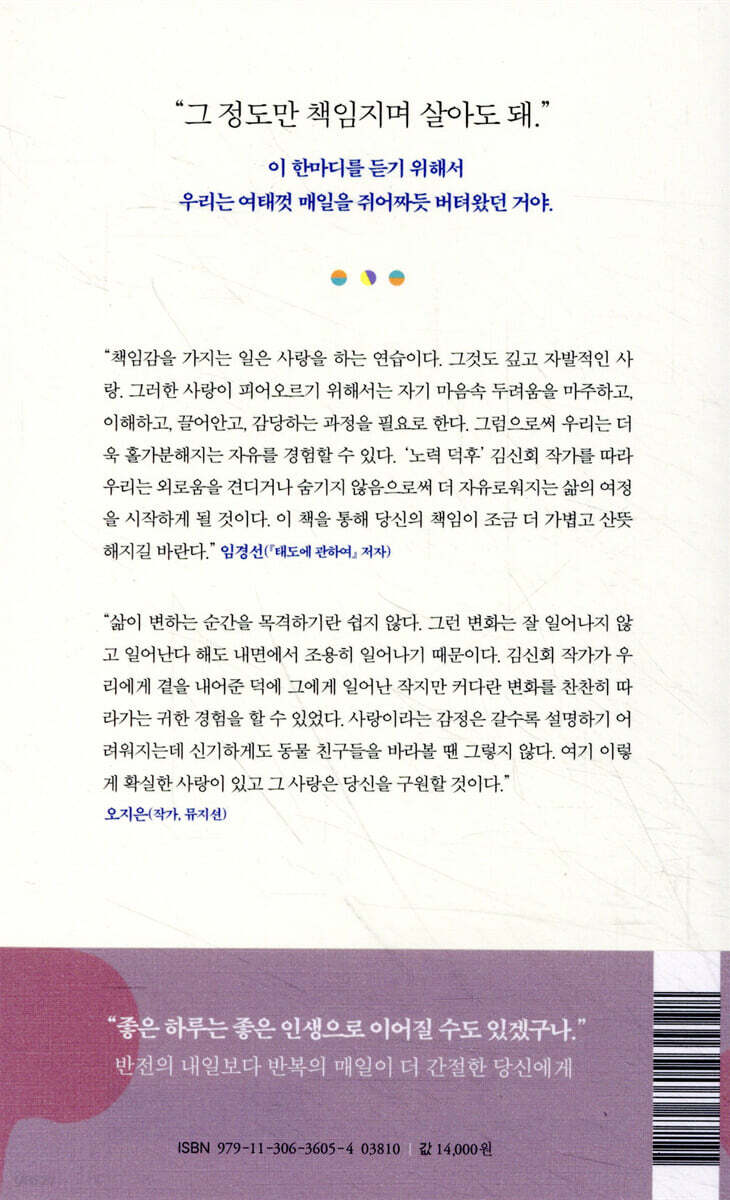 “책임감을 가지는 일은 사랑을 하는 연습이다. 그것도 깊고 자발적인 사랑. 그러한 사랑이 피어오르기 위해서는 자기 마음속 두려움을 마주하고, 이해하고, 끌어안고, 감당하는 과정을 필요로 한다. 그럼으로써 우리는 더욱 홀가분해지는 자유를 경험할 수 있다. ‘노력 덕후’ 김신회 작가를 따라 우리는 외로움을 견디거나 숨기지 않음으로써 더 자유로워지는 삶의 여정을 시작하게 될 것이다. 이 책을 통해 당신의 책임이 조금 더 가볍고 산뜻해지길 바란다.” - 임경선 (『태도에 관하여』 저자)