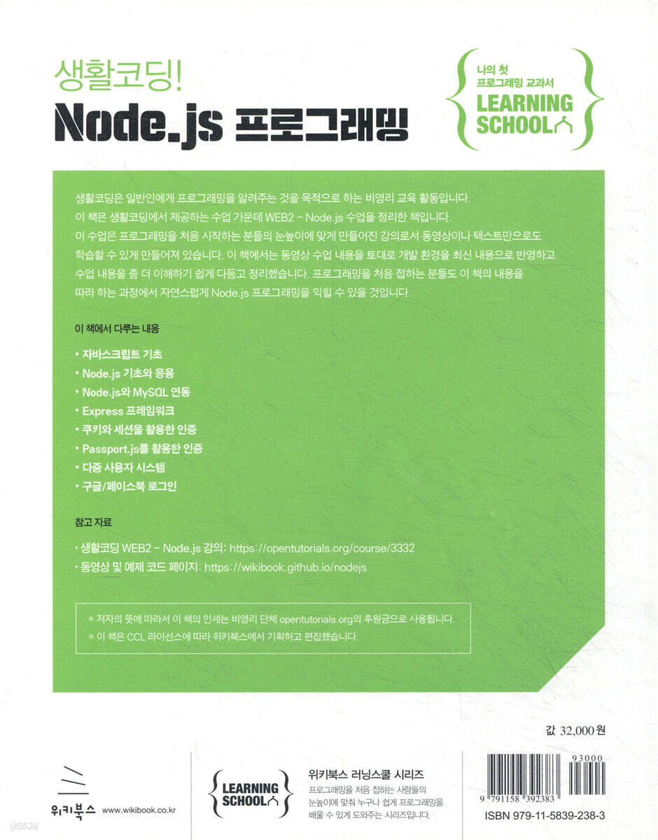 ◎ 자바스크립트 기초 ◎ Node.js 기초와 응용 ◎ Node.js와 MySQL 연동 ◎ Express 프레임워크 ◎ 쿠키와 세션을 활용한 인증 ◎ Passport를 활용한 인증 ◎ 다중 사용자 시스템 ◎ 구글/페이스북 로그인 참고 자료 ◎ 생활코딩 강의 WEB2 - Node.js: https://opentutorials.org/course/3332 ◎ 동영상 및 예제 코드 페이지: https://wikibook.github.io/nodejs |
