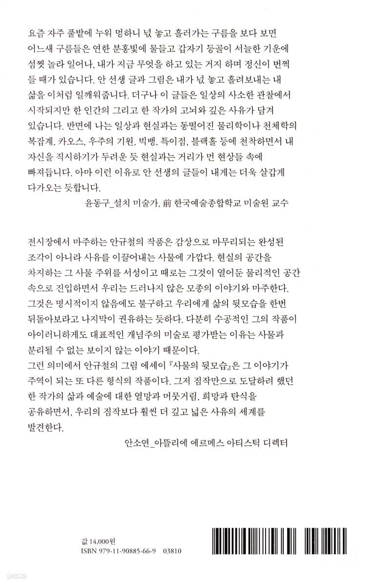 전시장에서 마주하는 안규철의 작품은 감상으로 마무리되는 완성된 조각이 아니라 사유를 이끌어내는 사물에 가깝다. 현실의 공간을 차지하는 그 사물 주위를 서성이고 때로는 그것이 열어둔 물리적인 공간 속으로 진입하면서 우리는 드러나지 않은 모종의 이야기와 마주한다. 그것은 명시적이지 않음에도 불구하고 우리에게 삶의 뒷모습을 한번 뒤돌아보라고 나지막이 권유하는 듯하다. 다분히 수공적인 그의 작품이 아이러니하게도 대표적인 개념주의 미술로 평가받는 이유는 사물과 분리될 수 없는 보이지 않는 이야기 때문이다. 그런 의미에서 안규철의 그림 에세이 『사물의 뒷모습』은 그 이야기가 주역이 되는 또 다른 형식의 작품이다. 그저 짐작만으로 도달하려 했던 한 작가의 삶과 예술에 대한 열망과 머뭇거림, 희망과 탄식을 공유하면서, 우리의 짐작보다 훨씬 더 깊고 넓은 사유의 세계를 발견한다. - 안소연 (아뜰리에 에르메스 아티스틱 디렉터)