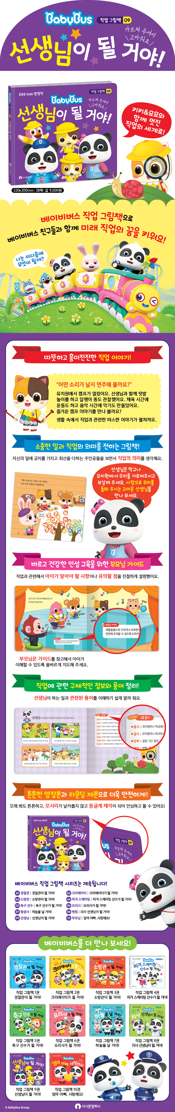 2.선생님 직업을 생생하게 체험할 수 있도록 볼거리 가득한 그림으로 구성했어요. 3.부모님 가이드를 통해서 관찰 놀이나 만들기를 할 때 주의해야 할 내용을 담았어요. 4.권말 부록에 선생님이 하는 일과 관련 용어를 이해하기 쉽게 정리했어요. 5.튼튼한 양장본과 모서리를 둥글게 제작하여 안전하게 볼 수 있도록 했어요. 키키 & 묘묘, 베이비버스 친구들과 함께 다양한 직업을 경험하고 미래의 꿈을 꾸어요! 어린이 인기 애니메이션 시리즈 ‘베이비버스’는 몬테소리 기반의 교육 이념과 가치를 실현하고, 어린이들에게 창의력과 문제 해결 능력, 올바른 생활 습관과 인성을 길러 줄 수 있도록 구성된 글로벌 콘텐츠로 144개국 약 4억 명의 아이들이 사랑하는 인기 애니메이션입니다. 베이비버스 직업 그림책 시리즈는? 베이비버스 인기 캐릭터들과 함께 다양한 직업 세계를 체험하고, 미래의 꿈을 찾을 수 있도록 기획되었습니다. 어린이들에게 큰 사랑을 받고 있는 키키와 묘묘, 베이비버스 친구들과 함께 선생님의 직업 현장을 생생하게 체험하고 선생님과 관련된 구체적인 배경 지식을 알게 되면서 직업의 소중함과 고마움, 미래 직업에 대해 생각해 볼 수 있도록 구성했습니다. 또 수업 시간에 알아야 할 주의 사항을 정리한 ‘부모님 가이드’가 있어서 읽기에 도움을 주도록 했습니다. 직업에 대해 잘 알면 더 큰 꿈을 꿀 수 있습니다. 베이비버스 직업 그림책 속 키키와 묘묘처럼 미래의 꿈을 발견하기 위한 직업 체험에 도전해 보세요. 우리를 위해 애써 주시는 고마운 선생님의 이야기와 함께 주인공들이 펼치는 따뜻한 이야기와 꿈을 향한 도전과 모험, 성취감을 함께 경험하면서 더 넓은 꿈의 세계를 그려 볼 수 있을 거예요! |