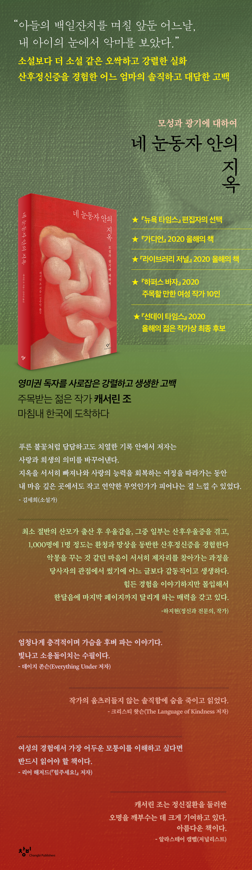 최소 절반의 산모가 출산 후 우울감을, 그중 일부는 산후우울증을 겪고, 1천명에 1명 정도는 환청과 망상을 동반한 산후정신증을 경험한다. 『네 눈동자 안의 지옥』은 갓 100일 된 아이를 놔두고 정신병원에 입원했던 과정의 생생한 복기다. 뿌연 안개 속에서 헤매는 악몽을 꾸는 것 같던 마음이 서서히 제자리를 찾아가는 과정을 당사자의 관점에서 썼기에 어느 글보다 감동적이고 생생하다. 한국계 미국인으로 살아온 시간이 씨줄과 날줄로 엮이면서 미국 사회의 한 단면을 잘 보여주기도 한다. 힘든 경험을 이야기하지만 몰입해서 한달음에 마지막 페이지까지 달리게 하는 매력을 갖고 있다. 하지현(정신과 전문의, 작가) 한 사람의 정체성이란 그 사람이 가진 고유한 두려움이라는 걸 나는 이 책을 읽으며 배웠다. 누구나 살면서 비슷비슷한 지옥에 떨어지지만 거기서 마주하는 것은 자신의 고유한 두려움이라는 걸. 저자 캐서린 조는 광기 한가운데서 자신의 두려움과 마주한다. 어릴 적 할머니가 들려주었던, 커다란 사랑에는 커다란 징벌과 희생이 따른다는 한국의 설화가 자기 안에 깊이 뿌리내리고 있었음을 깨닫는다. 푸른 불꽃처럼 담담하고도 치열한 기록 안에서 저자는 사랑과 희생의 의미를 바꾸어낸다. 지옥을 서서히 빠져나와 사랑의 능력을 회복하는 여정을 따라가는 동안 내 마음 깊은 곳에서도 작고 연약한 무엇인가가 피어나는 걸 느낄 수 있었다. 김세희(소설가) 엄청나게 충격적이며 가슴을 후벼 파는 이야기다. 빛나고 소용돌이치는 수필이다. 데이지 존슨(Everything Under 저자) 작가의 움츠러들지 않는 솔직함에 숨을 죽이고 읽었다. 크리스티 왓슨(The Language of Kindness 저자) 흥미롭고 절묘하게 쓰인 글이다. 캐서린 조의 전기는 내가 전혀 알지 못하는 세상으로 나를 데려갔다. 매우 뛰어난 솜씨다. 루스 존스(배우) 굽히지 않는 정직함으로 쓰인 맹렬하고 용감하고 반짝이는 책이다. 하나의 현실에서 다른 현실로 이동하는 과정과 (항상 알고 있는 것은 아니지만) 모두가 가지고 있는 가족의 기억을 기록하고 있다. 레이철 조이스(저술가) 여성의 경험에서 가장 어두운 모퉁이를 이해하고 싶다면 반드시 읽어야 할 책이다. 리어 해저드(『힘주세요!』 저자) 강력하고 통렬한 책이다. 뇌리를 떠나지 않는 정신질환과 연애의 난관과 잔혹성이 너무나 아름답고 정직하게 그려졌다. 베브 토머스(A Good Enough Mother 저자) 캐서린 조는 정신질환을 둘러싼 오명을 깨부수는 데 크게 기여하고 있다. 아름다운 책이다. 알라스테어 캠벨(저널리스트) 통찰력 있고 충격적인 책. 『스타일리스트』 2020 논픽션 부분 최우수 도서 승리했다. 『코스모폴리탄』 2020 추천 도서 |