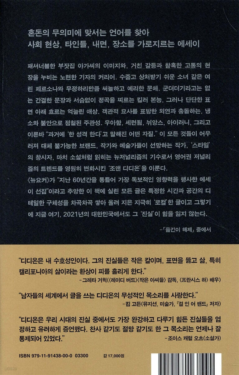 작가와 예술가들이 사랑하는 이름 “디디온은 내 수호성인이다. 그의 진실들은 작은 칼이며, 표면을 뚫고 삶, 특히 캘리포니아의 삶이라는 환상이 피를 흘리게 한다.” _그레타 거윅(〈레이디 버드〉〈작은 아씨들〉 감독, 〈프란시스 하〉 배우) “남자들의 세계에서 글을 쓰는, 디디온의 무성적인 목소리를 사랑한다.” _킴 고든(뮤지션, 미술가, 『걸 인 어 밴드』 저자) “디디온은 우리 시대의 진실 중에서도 가장 완강하고 다루기 힘든 진실들을 엄정하고 유려하게 증언했다. 찬사 같기도 절망 같기도 한 그 목소리는 언제나 잘 통제되어 있었다.” _조이스 캐럴 오츠(소설가) “이 책을 손에 넣었을 때, 나는 디디온의 목소리와 산문이 전하는 독특한 힘─외과수술의 정밀함, 주문에 가까운 리듬에 감동받았다. (…) 사실 디디온의 작품은, 여러 면에서, 1990년대와 2000년대에 등장한 새로운 세대의 작가들이 받아들인 회고록 글쓰기를 예견했다.” ―미치코 가쿠타니(『진실 따위는 중요하지 않다』 저자) “이 책에 완전히 사로잡혔다. (…) 디디온을 사랑한다.” ―애니 클라크(세인트 빈센트, 뮤지션) “디디온은 내가 정말 어두울 때, 세상에 대해 생각하는 방식을 돌아보게 한다. 그건 몹시 절망적이다. 디디온은 부끄러워하지 않고 그냥 거기에 간다.” ―피비 브리저스(뮤지션) “디디온은 언제나 내가 정말로 존경하는 작가 중 한 사람이다. 가장 좋아하는 디디온의 글은 1967년 에세이 〈베들레헴을 향해 웅크리다〉. 영국에서 자란 애들은 히피 시대가 유토피아적인 꿈나라라고 생각하지만, 실제로는 엉망이었다. 문화적 쿨함의 바깥에서 반문화를 그대로 바라보는 디디온의 능력을 사랑한다.” ―매튜 힐리(더 1975 멤버, 뮤지션) “강한 파급력을 지닌 에세이. 서구의 신화와 미국 그 자체에 대한 묵상. 정곡을 찌르고, 앞날을 내다보며, 시대를 타지 않는다.” ―캐리 브라운스틴(슬레이터 키니 멤버, 뮤지션, 〈포틀랜디아〉 배우, 『헝거 메이크스 미 어 모던 걸』 저자) “인간 군상의 초상을 그리는 디디온의 목적은 폭로가 아니라 이해다. (…) 디디온은 그들을 악인으로 몰지도 않고 화려하게 미화하지도 않는다. 그들은 생생히 살아 있고 엉망진창이고 애달프게 아름다울 때도 많다.” ―댄 웨이크필드(《뉴욕 타임스 북 리뷰》) “1960년대와 70년대 미국에 대한 우리의 관념은, 상당 부분, 디디온 덕분에 존재하게 되었다.” ―허마이어니 호비(《가디언》) “캘리포니아는 디디온에게 시작에 불과했다. 지금과 마찬가지로 그때도 디디온은 국가로서의 미국 그 자체를 주시했고, 그때나 지금이나, 그보다 더 명료하고 적확하게 본 사람은 극히 적었다.” ―조너선 야들리(《워싱턴포스트》) 미국 에세이의 살아 있는 전설 ‘원조 쿨 걸’ 조앤 디디온의 세계 2021년 현재 뉴욕에 살고 있는 86살의 조앤 디디온은 20세기 후반 미국을 대표하는 가장 영향력 있는 저널리스트이자 에세이스트를 넘어, 신화가 되었다. 미국에서 통찰력 있는 에세이나 회고록을 쓰는 여성들은 물론, 음악을 만드는 여성들까지도 디디온과의 비교를 피할 수 없다(그 리스트에는 『트릭 미러』의 지아 톨렌티노와 『면역에 관하여』의 율라 비스, 킴 고든, 라나 델 레이 등이 있다). 여러 매체에는 “디디온풍”Didion-esque, “디디온 같은”Didion-like, “디디온스러운”Didion-ish 같은 형용사, “우리 시대의 디디온”과 “다음 세대의 디디온”, “디디온을 비롯한 작가들의 전통 속에서” 같은 표현들이 범람한다. 디디온이 관찰과 분석과 문장이 탁월한 에세이스트의 압도적인 대명사, 나아가 형용사로 사용되기 시작한 것은 2010년대부터다. 밀레니얼 세대에게 영향력 있는 작가와 배우와 뮤지션들이 디디온으로부터 받은 영감과 그에 대한 애정을 피력했으며, 미셸 딘에 따르면 “후대의 젊은 여성들은 디디온이 글에서 자신들 내면의 가장 깊숙한 생각을 표현해주었다고 주장”했다. 은둔으로 악명 높던 이 고령의 작가는 2015년 패션 브랜드 셀린의 모델이 되었고, 같은 해 700페이지가 넘는 디디온 평전이 출간되었다. 2017년에는 디디온에 관한 넷플릭스 다큐멘터리 〈조앤 디디온의 초상〉이 공개되었고, 2019년 디디온의 소설을 영화화한 〈마지막 게임〉The Last Thing He Wanted이 개봉했으며, 올해는 디디온의 미발표 에세이를 묶은 책 『내가 하고 싶었던 말』Let Me Tell You What I Mean이 출간되어 큰 화제를 모았다. 디디온은 1934년에 캘리포니아 새크라멘토에서 태어나 다섯 살부터 글을 쓰기 시작했다. 패션잡지 《보그》 에디터를 거쳐 여러 매체에 글을 기고했으며, 여러 편의 소설과 논픽션, 희곡, 시나리오를 썼다. 국내에는 지금은 절판된, 남편의 죽음 이후를 다룬 『상실』The Year Of Magical Thinking, 그리고 딸의 죽음을 둘러싼 자전적 에세이 『푸른 밤』이 소개되어 상실과 애도의 작가로 알려져 있지만, 영미권의 ‘디디온 르네상스’는 “원조 쿨 걸”이자 “영원한 쿨 걸”의 이미지에 기인한다. 1960년대와 70년대에 찍힌 사진(줄리언 와서Julian Wasser가 촬영한 사진들이 유명하다) 속 수려한 스타일과 무심한 듯 꿰뚫어보는 표정, “명민하고 