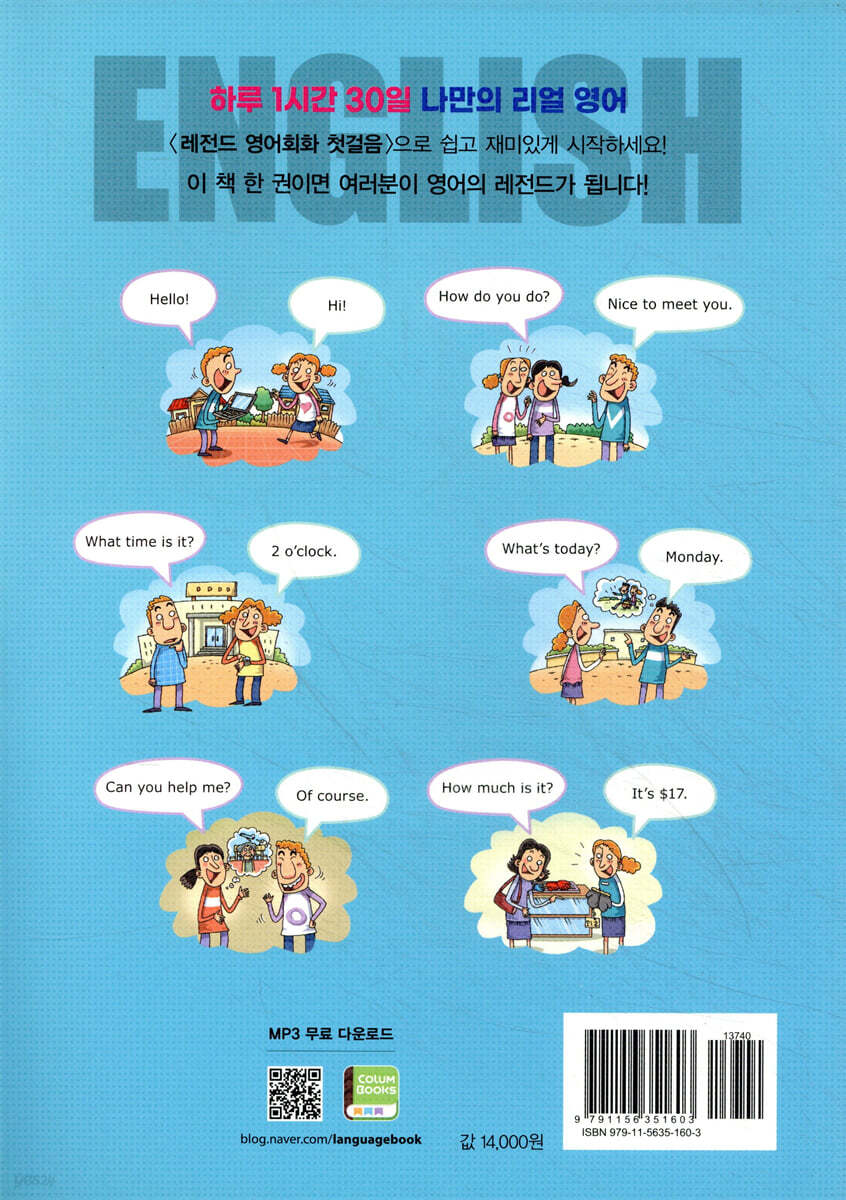 Chapter 1. 기초 영어 Unit 1 Hello! 안녕! Unit 2 How have you been? 어떻게 지내요? Unit 3 How do you do? 처음 뵙네요. Unit 4 What’s your name? 이름이 뭐예요? Unit 5 What’s your hobby? 취미가 뭐예요? Unit 6 Do you like movies? 영화 좋아해요? Unit 7 I like sports. 운동을 좋아해요. Unit 8 What time is it? 몇 시예요? Unit 9 What’s the date? 며칠이에요? Unit 10 How’s the weather? 날씨가 어때요? Chapter 2. 생활 영어 Unit 11 Thank you so much. 대단히 감사합니다. Unit 12 I’m sorry. 미안합니다. Unit 13 Congratulations! 축하해! Unit 14 You can do it! 넌 할 수 있어! Unit 15 May I ask a favor? 부탁 좀 할까요? Unit 16 How about you? 넌 어때? Unit 17 Let’s have lunch. 점심 먹자. Unit 18 When should we meet? 언제 만날까요? Unit 19 Who’s calling, please? 누구세요? Unit 20 May I speak to Billy? 빌리 좀 바꿔 줄래요? Chapter 3. 여행 영어 Unit 21 How long is this flight? 비행시간이 얼마나 걸려요? Unit 22 May I see your passport? 여권 보여주시겠어요? Unit 23 I’m lost. 길을 잃었어요. Unit 24 Do you have any rooms? 방 있나요? Unit 25 How much is it? 얼마예요? Unit 26 Just looking around. 구경 중이에요. Unit 27 Can I return this? 반품할 수 있어요? Unit 28 I’d like to reserve a table. 식당 예약하려고요. Unit 29 Would you like to order? 주문하시겠어요? Unit 30 I enjoyed my meal. 잘 먹었습니다. |