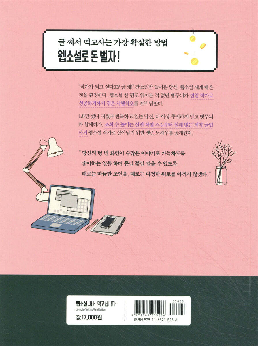 01 웹소설이랑 일반 소설, 뭐가 달라요? | 돈 만지려면 꼭 기억해야 하는 웹소설의 특징 02 웹소설, 돈 많이 벌어요? | 신인 작가도 한 작품에 4,000만 원 가능! 03 어떤 재능이 필요해요? | 쉿! 대박 작가 탄생 비밀 전격 대공개 04 웹소설 왕초보인데 뭐부터 배워야 하죠? | 오늘 당장 초보 탈출, 웹소설 사전! 05 취미로 돈 벌려면 어떻게 써야 해요? | 억대 인세의 첫걸음, 꼭 결정해야 하는 두 가지 06 웹소설 작가가 되는 노하우가 있나요? | 프로 작가가 되는 가장 빠른 방법 네 가지 07 공모전에서 상 타려면 어떻게 해야 해요? | 수상 경력 3회! 공모전 킬러 작가의 비법 공개 08 투고에 성공하는 비법이 있나요? | 출판사를 사로잡는 100% 성공 투고 꿀팁! 09 무료 연재, 왜 해야 해요? | 신인 작가만 모르는 무료 연재의 장·단점 2장 데뷔작으로 대박 나는 작법 스킬 파헤치기 01 뭘 써야 할지 모르겠는데요? | 의외로 쉬운 대박 소재 찾는 법 02 가독성 좋은 문장은 어떻게 써야 하죠? | 10분 만에 글 잘 쓰는 8계명 03 시놉시스, 너무 막막해요! | 돈길 꽃길로 안내해줄 시놉시스의 모든 것 04 손이 너무 느린데 빨리 쓰는 방법 있나요? | 하루 1만 자 스피드업 필살 스킬 05 문장이 너무 밋밋한데 표현력 키우는 방법 있나요? | 표절 걱정 없이 표현력 키우는 꿀팁 06 요즘 어떤 웹소설이 잘 나가요? | 대박 작가만 아는 트렌드 완벽 분석법 07 플롯이 뭐예요? | 독자를 사로잡는 매혹적인 플롯 쓰는 법 08 캐릭터, 어떻게 만들어야 해요? | 캐릭터 만들 때 꼭 기억해야 하는 일곱 가지 09 웹소설 잘 쓰는 특별한 비법 있나요? | 클리셰 & 고구마 & 사이다만 기억하라! 10 절단신공이 뭐예요? | 연독률 무조건 올리는 절단신공 7스킬 11 망한 것 같은데 어떻게 수정해야 하죠? | 인기 없는 소설 되살리는 심폐소생 체크리스트 3장 계약부터 수익까지, 웹소설 작가의 모든 것 01 웹소설, 어디에 올려요? | 플랫폼 파헤치고 무료 연재 시작하는 법 02 조회 수, 어떻게 올려요? | 100만 다운로드를 향한 특급 꿀팁 03 출판사, 어디가 좋아요? | 내 작품에 딱 맞는 출판사 고르는 법 04 계약서, 어떻게 봐요? | 계약서 사인하기 전에 꼭 체크해야 하는 일곱 가지 05 돈, 언제 들어와요? | 웹소설 작가 수입의 모든 것 06 표지, 어떻게 만들어요? | A부터 Z까지 알려주는 일러스트 표지 만들기 07 내 작품도 드라마로 만들 수 있을까요? | 드라마 PD들이 챙겨보는 웹소설의 특징 4장 잘 먹고 잘사는 전업 작가 생존 꿀팁 01 전업 작가 꿀장점 BEST 3 | 늘 짜릿하고 새로운 행복에 대하여 02 전업을 후회하는 작가의 진짜 속내 | 지망생들은 모르는 전업 작가의 치명적 단점 03 전업 작가의 자기 관리 비법 | 살아남기 위해 관리해야 하는 세 가지 04 부서진 멘탈 치유하는 법 | 나를 지옥에서 구한 네 문장 05 반드시 망하는 작가의 특징 | 실패가 두려운 이를 위한 팩트 폭격 06 재능이 중요할까, 노력이 중요할까? | 재능충 vs 노력충, 그 비밀을 파헤친다 07 첫술에 배부르고 싶은 당신에게! | 후회하지 않는 선택의 모든 것 |