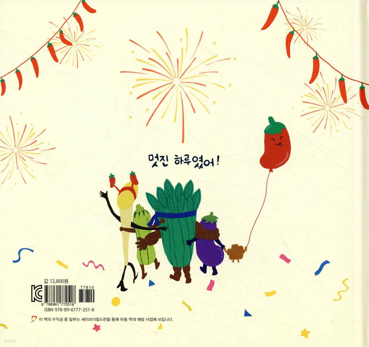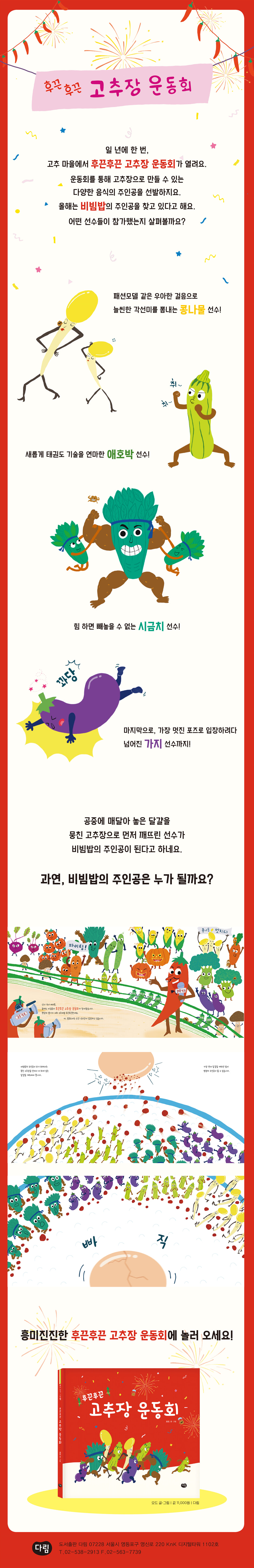 누리과정 〈신체운동 건강〉 바른 식생활하기 누리과정 〈다른 사람과 더불어 생활하기〉 친구와 사이좋게 지내기 통합교과 〈여름〉 3. 소중한 나 / 3. 소중한 우리 2학년 1 학기 국어 4. 말놀이를 해요 ※ 다림의 ‘우리 작가 그림책’은 우리나라 작가들이 손과 마음으로 정성껏 쓰고 그린 창작 그림책 시리즈입니다. “과연 올해 비빔밥을 차지할 승자는 누가 될까요?” 비빔밥을 소재로 경쟁과 화합을 이야기한 유쾌한 그림책 비빔밥은 고기나 나물 따위와 여러 가지 양념을 넣어 비벼 먹는 우리나라 대표 음식 중 하나예요. 비빔밥에 들어간 재료들 중에는 어느 하나 주인공이지 않은 것이 없어요. 모든 재료가 한데 어우러져 조화를 이루어 ‘화합’의 상징이기도 하지요. 그런데 고추 마을에서 비빔밥의 단독 주인공을 뽑기 위한 운동회를 개최했어요. 우리가 운동회에서 하는 박 터뜨리기 놀이처럼, 매달아 놓은 달걀을 향해 뭉친 고추장을 던져 먼저 깨뜨리면 비빔밥의 주인공이 되는 것이지요. 시금치, 콩나물, 애호박, 가지가 선수로 참가했는데, 다른 채소가 먼저 달걀을 깨뜨리지 못하도록 반칙까지 서슴지 않아요. 이때 호시탐탐 비빔밥의 주인공 자리를 노리던 다진 고기 부대까지 끼어들면서 운동회는 한순간에 아수라장이 되어요. 고추장 운동회는 무사히 끝날 수 있을까요? 과연 비빔밥의 주인공은 누가 될까요? 흥미진진한 《후끈후끈 고추장 운동회》를 만나 보세요. 채소에 대한 거부감을 줄여 주고 관찰력과 집중력까지 키워 주는 그림책 많은 어린이들이 채소를 싫어해요. 성장기에는 모든 영양소를 골고루 먹어야 하는데 어린이들은 식감이 좋지 않아서, 혹은 쓴맛이 나거나 오히려 아무 맛도 나지 않는다는 이유 등으로 채소를 멀리하지요. 이 책은 어린이들이 싫어하는 채소들을 단순하지만 코믹한 그림으로 표현해 채소에 대한 거부감이 줄어들게 도와줘요. 작가의 재치 있는 상상력으로 빚은 재미있는 이야기에 빠져 책을 읽고 또 읽다 보면 어느새 채소에 대한 친근함이 생기게 될 거예요. 또한, 이 그림책에는 아이들이 즐거워할 만한 능동적 장치가 하나 마련되어 있어요. 바로 호시탐탐 비빔밥의 주인공 자리를 탐내는 다진 고기 부대들을 그들이 등장하기 전부터 장면 곳곳에 숨겨 놓은 거예요. 아이들은 숨은그림찾기 놀이를 하듯, 다진 고기 부대를 찾기 위해 자연스럽게 책에 집중하게 되고, 책 읽는 즐거움을 느끼는 동시에 관찰력과 집중력도 높아지게 되지요. 숨어 있는 다진 고기 부대들을 찾으며 다시 한번 읽어 보면, 또 다른 책 읽기의 재미를 느낄 수 있을 거예요. |